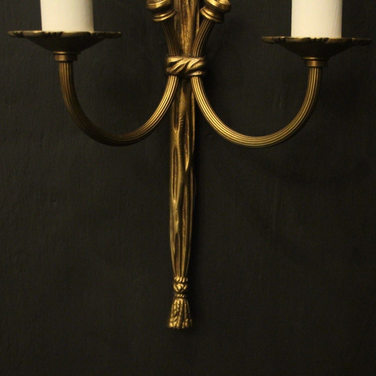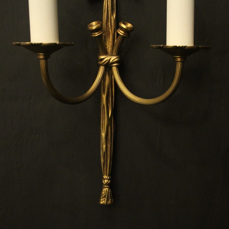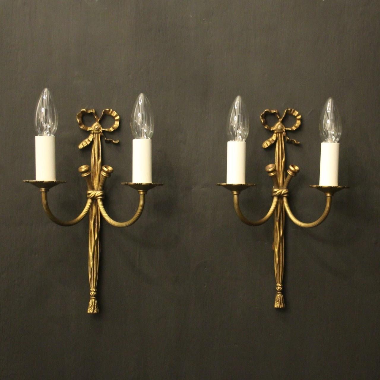 A small French pair of gilded brass twin arm wall lights, the reeded scrolling arms with circular leaf bobeche drip pans, issuing from a decoratively cast elongated rope backplate and pierced ribbon finial, good small scale. Fully rewired and PAT tested. All our wall lights come with aged brass screws for fixing and spare bulbs.