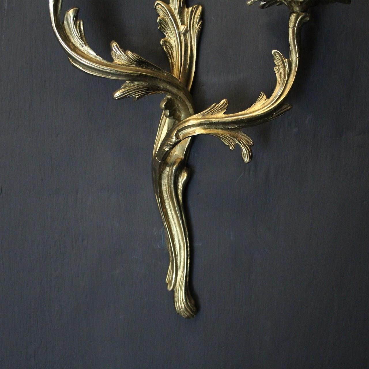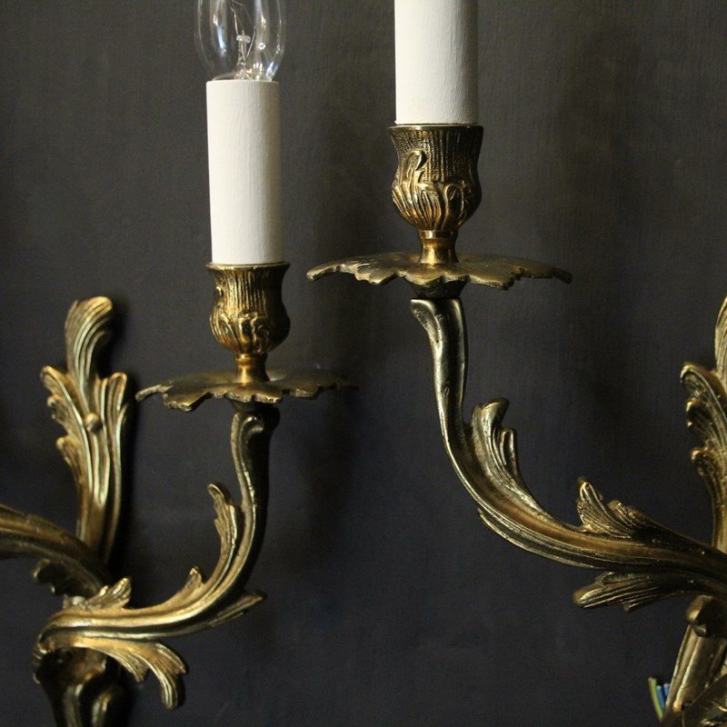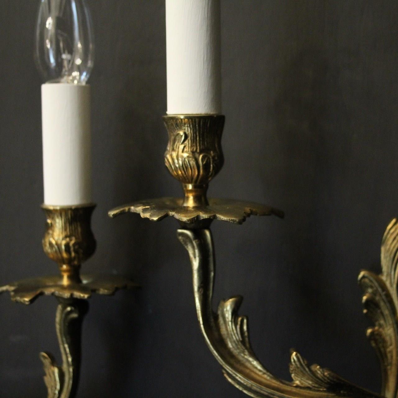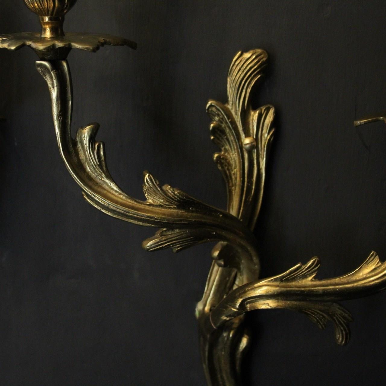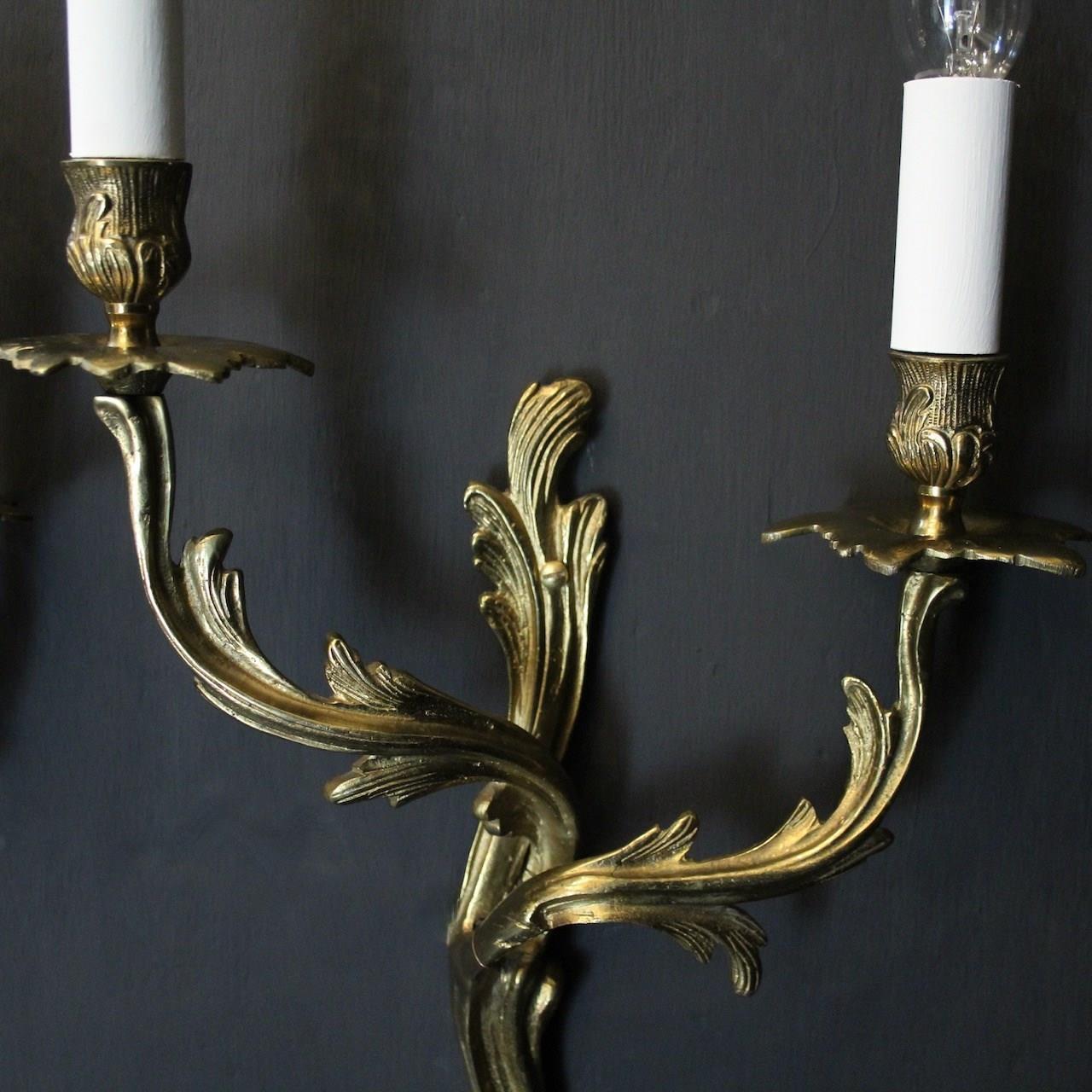 A French pair of gilded brass twin arm wall lights, the tiered leaf clad scrolling arms with foliated bobeche drip pans and bulbous candle sconces, issuing from a scrolling leaf backplate. Fully rewired and PAT tested. All our wall lights come with aged brass screws or brackets for fixing and spare bulbs.
