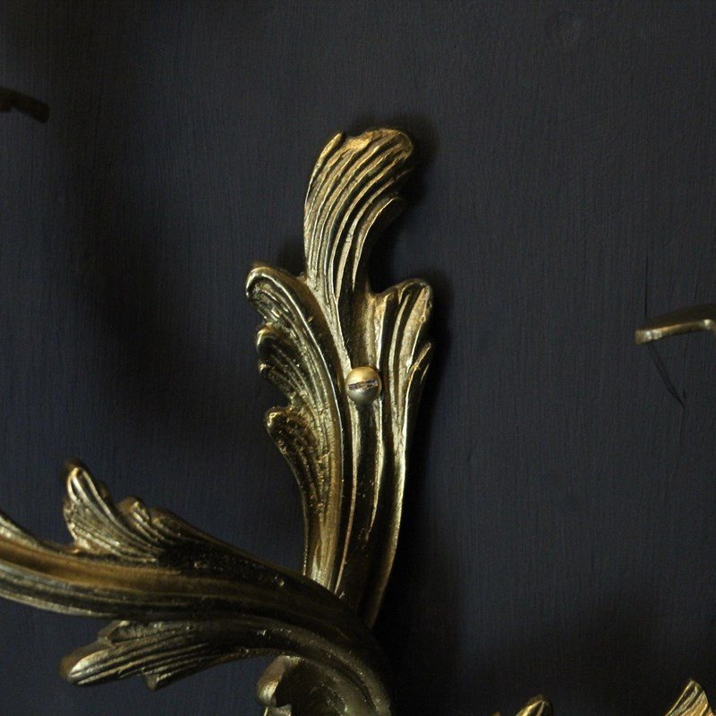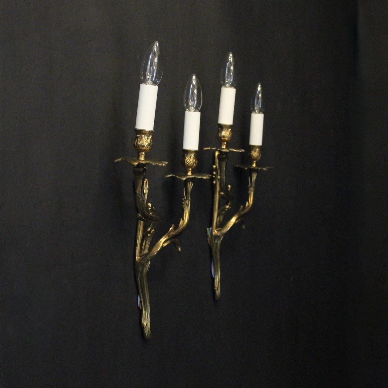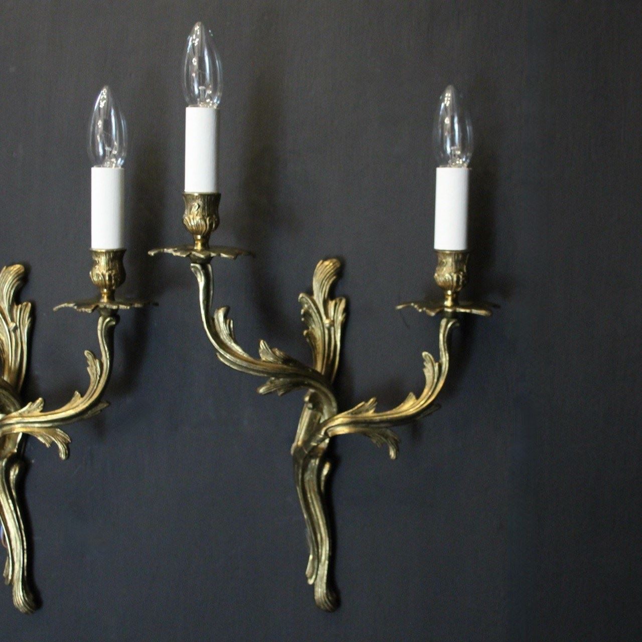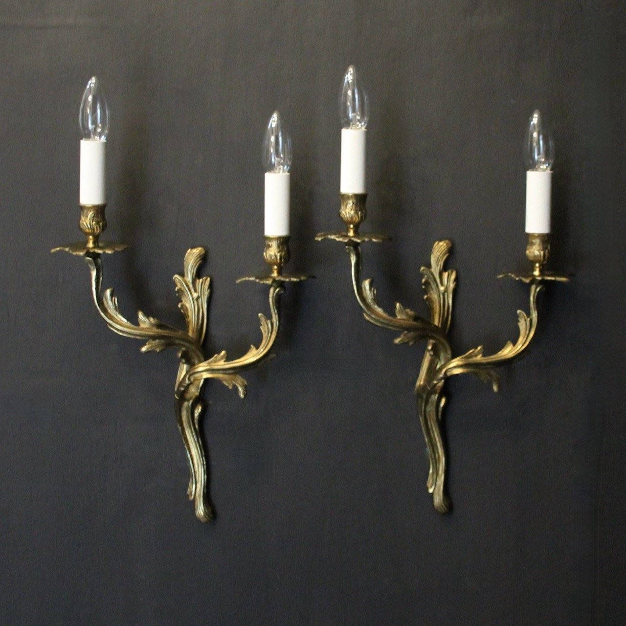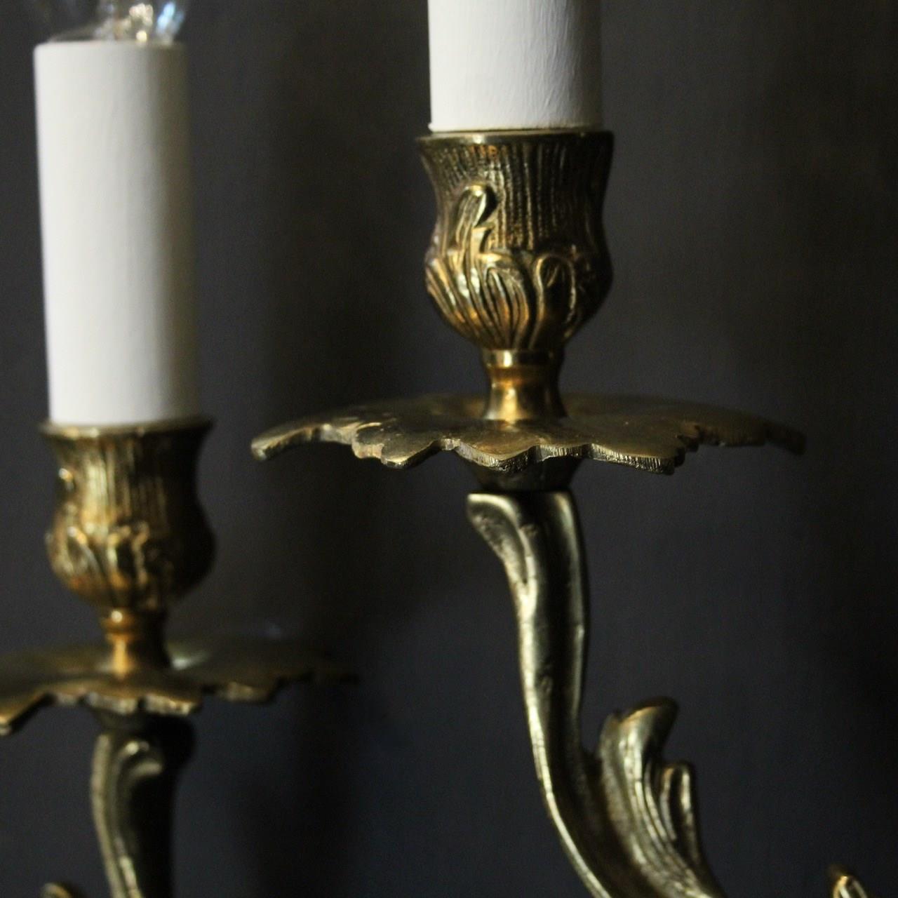 A French pair of gilded brass twin arm wall lights, the tiered leaf clad scrolling arms with foliated bobeche drip pans and bulbous candle sconces, issuing from a scrolling leaf backplate. Fully rewired and PAT tested. All our wall lights come with aged brass screws or brackets for fixing and spare bulbs.