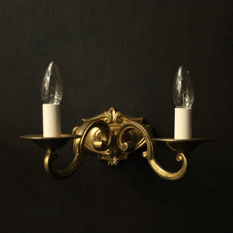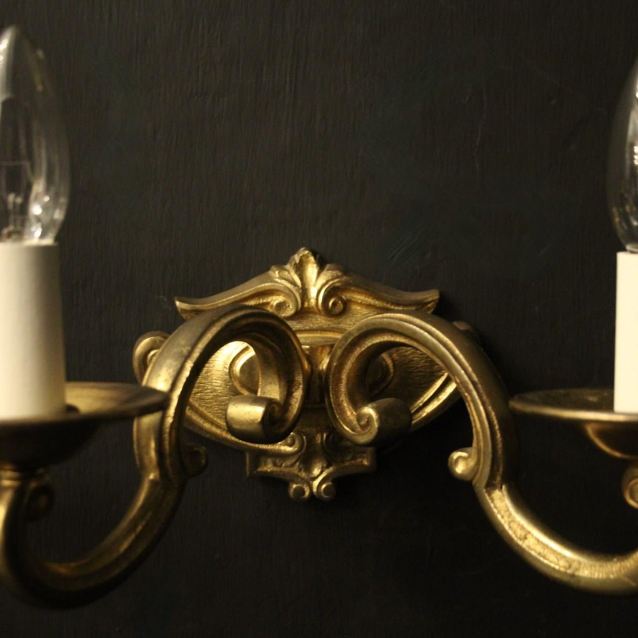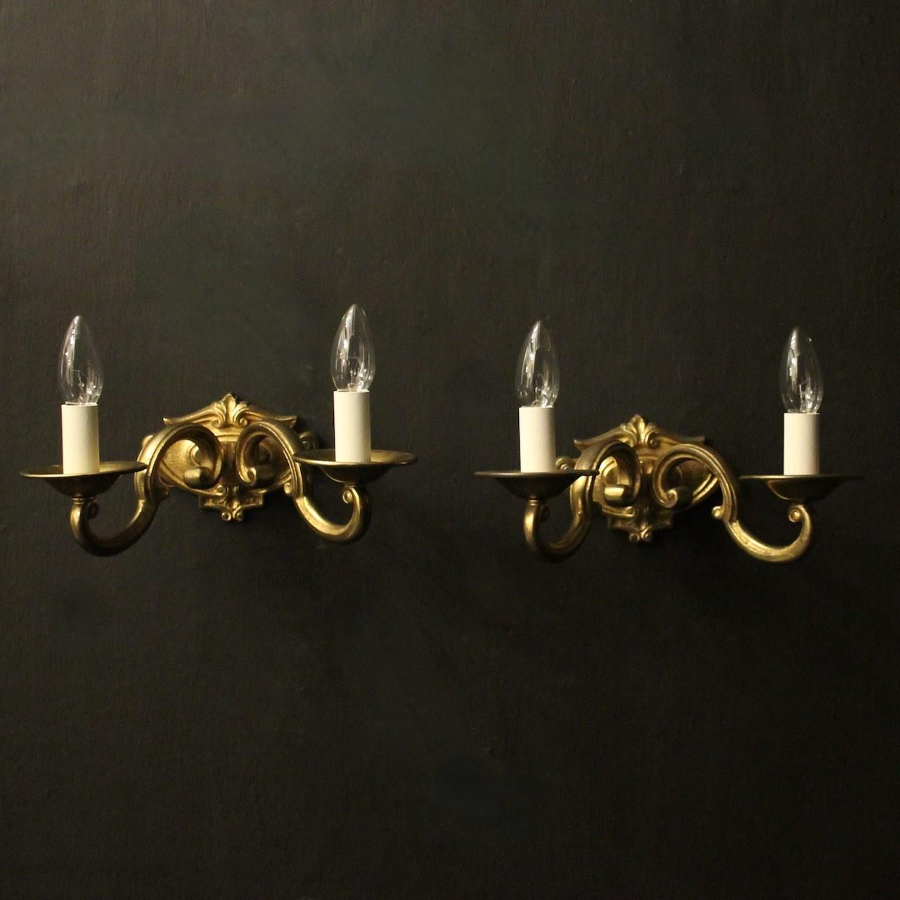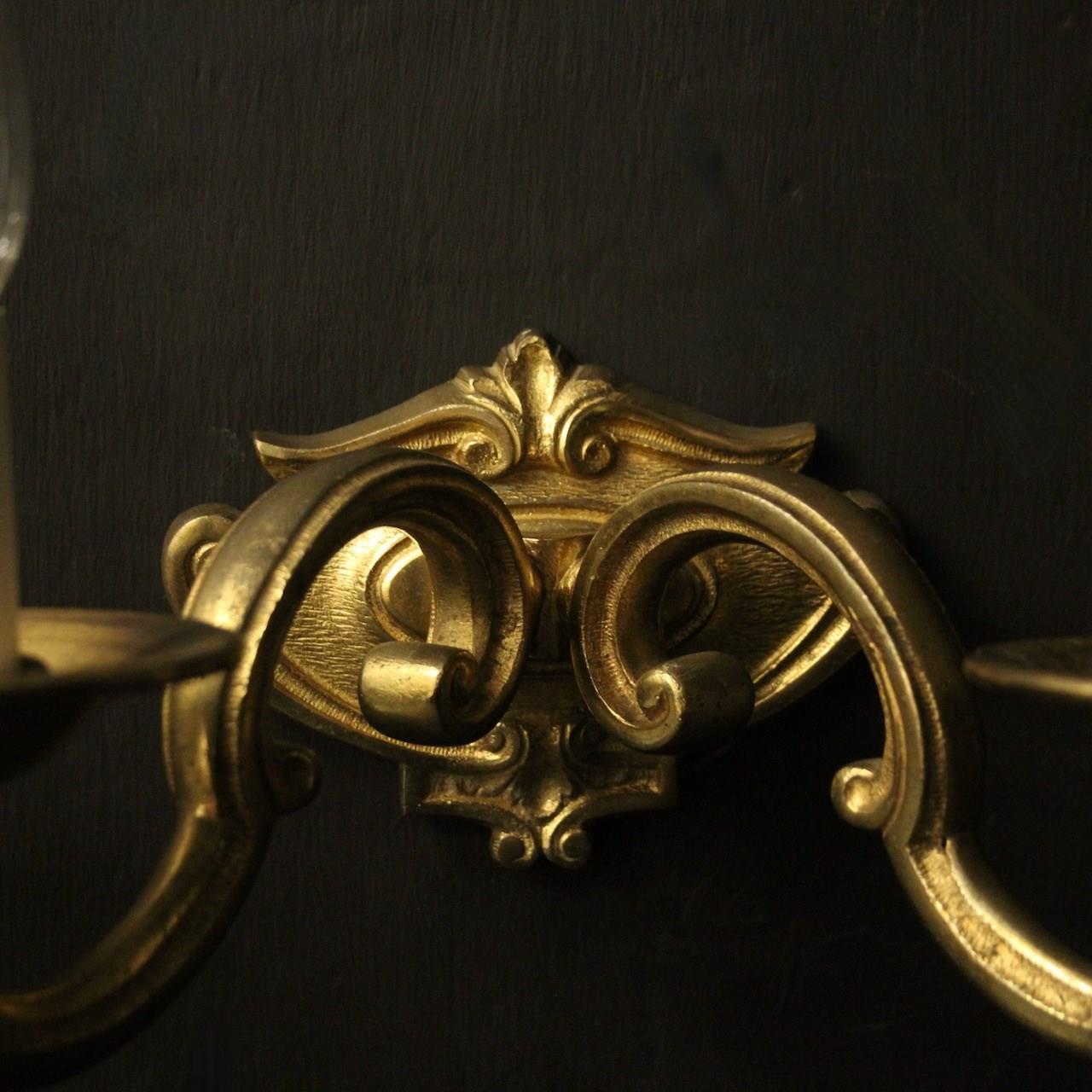 A French pair of gilded bronze twin arm antique wall lights, the scrolling arms with circular bobeche drip pans, issuing from a cartouche shaped foliated backplate, nice original crisp gilded patination. Fully rewired and PAT tested. All our wall lights come with aged brass screws or brackets for fixing and spare bulbs.