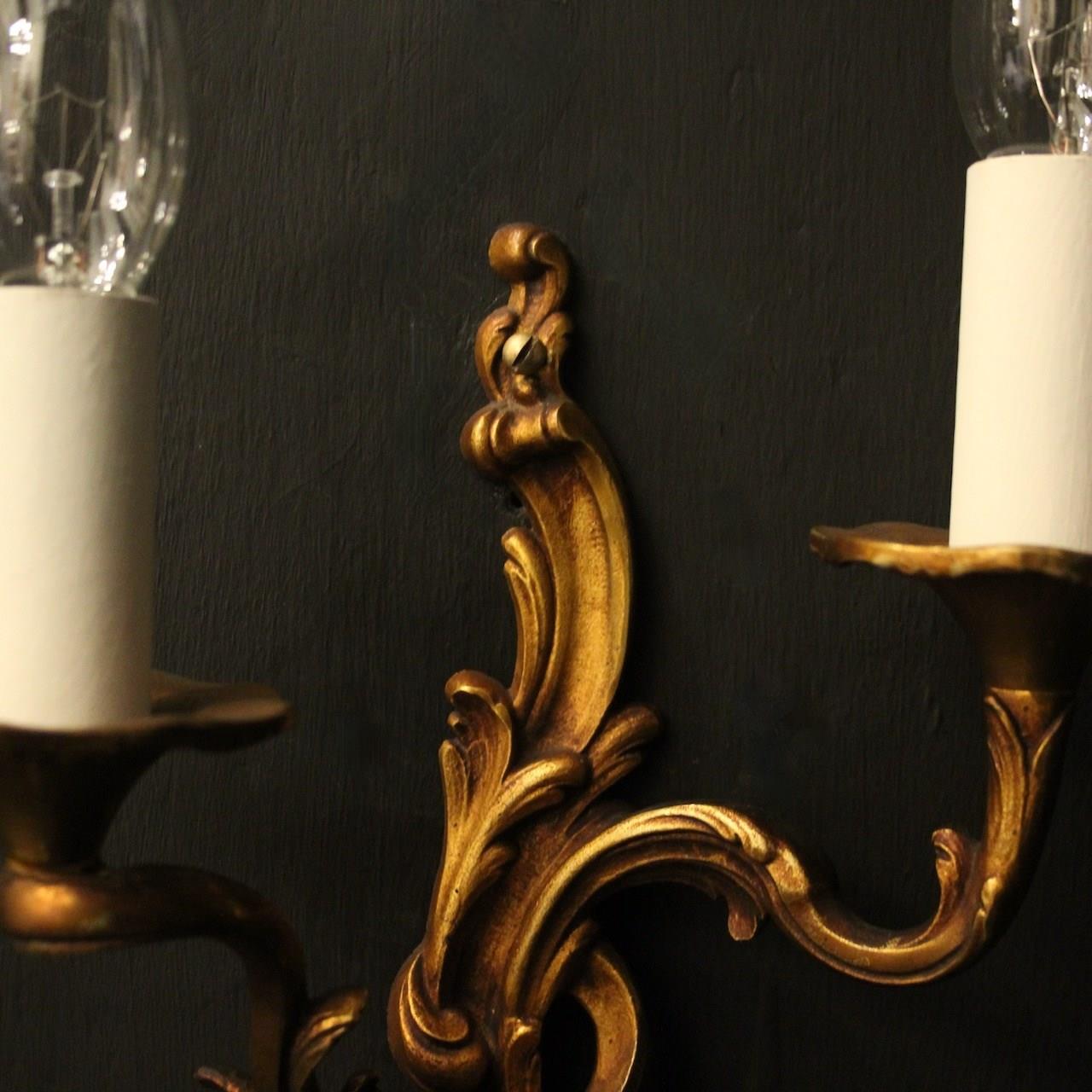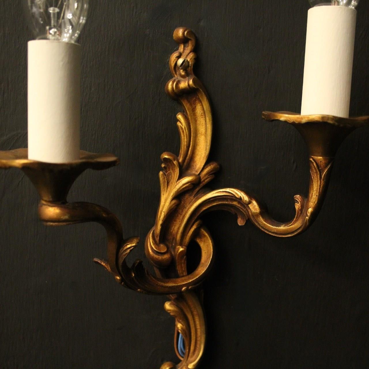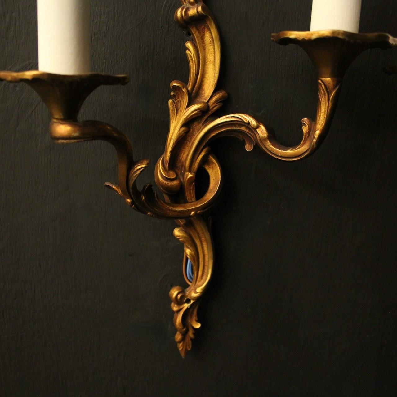 A French pair of gilded bronze twin arm opposing antique wall lights, the leaf scrolling arms with leaf trumpet bobeche drip pans, issuing from an opposing leaf elongated backplate, nice original faded gilded patination. Fully rewired and PAT tested. All our wall lights come with aged brass screws for fixing and spare bulbs.