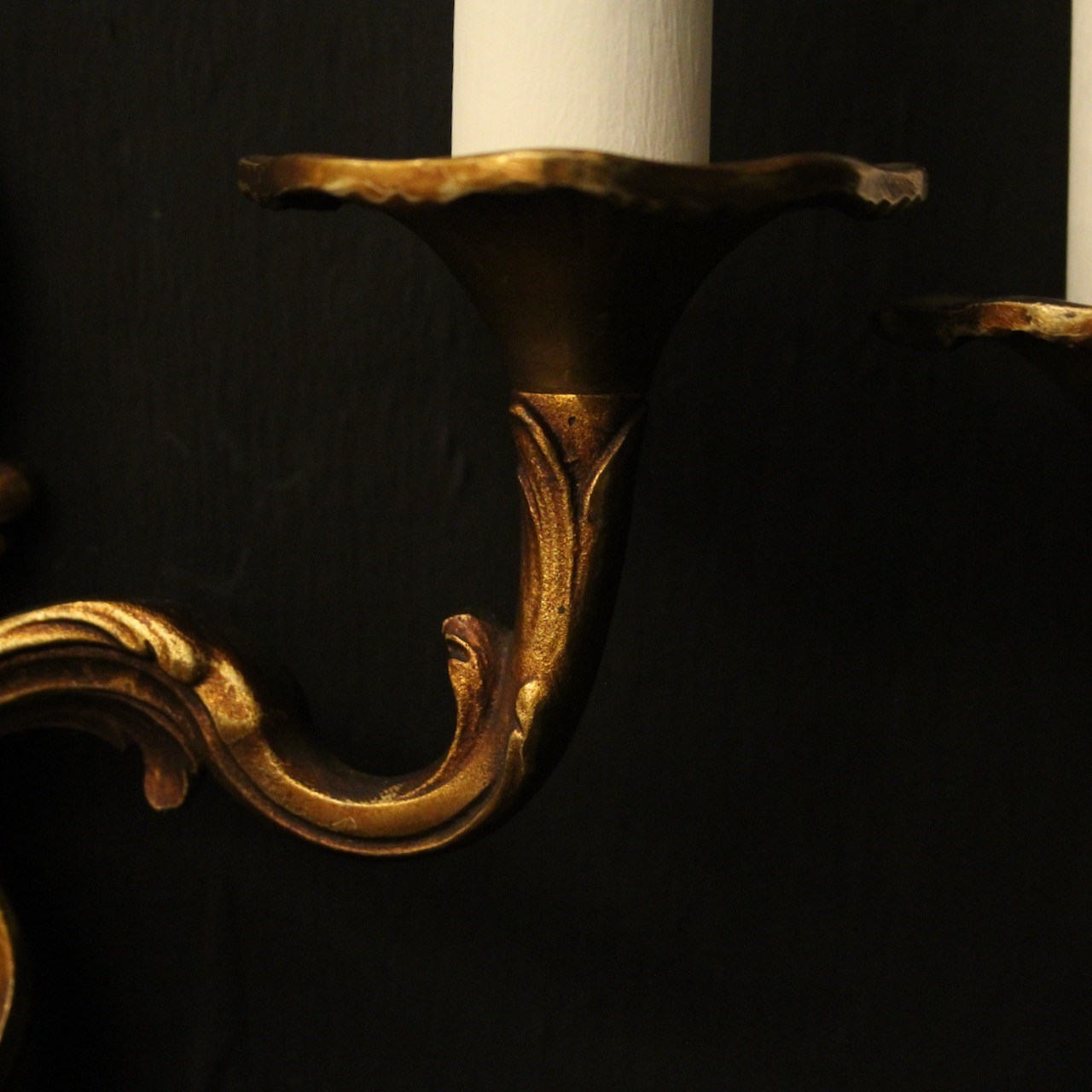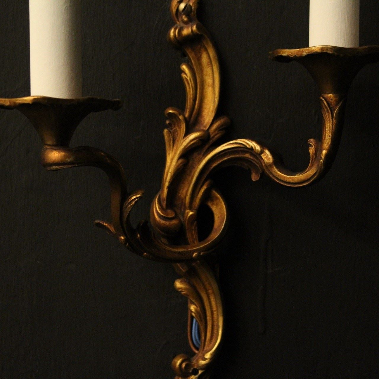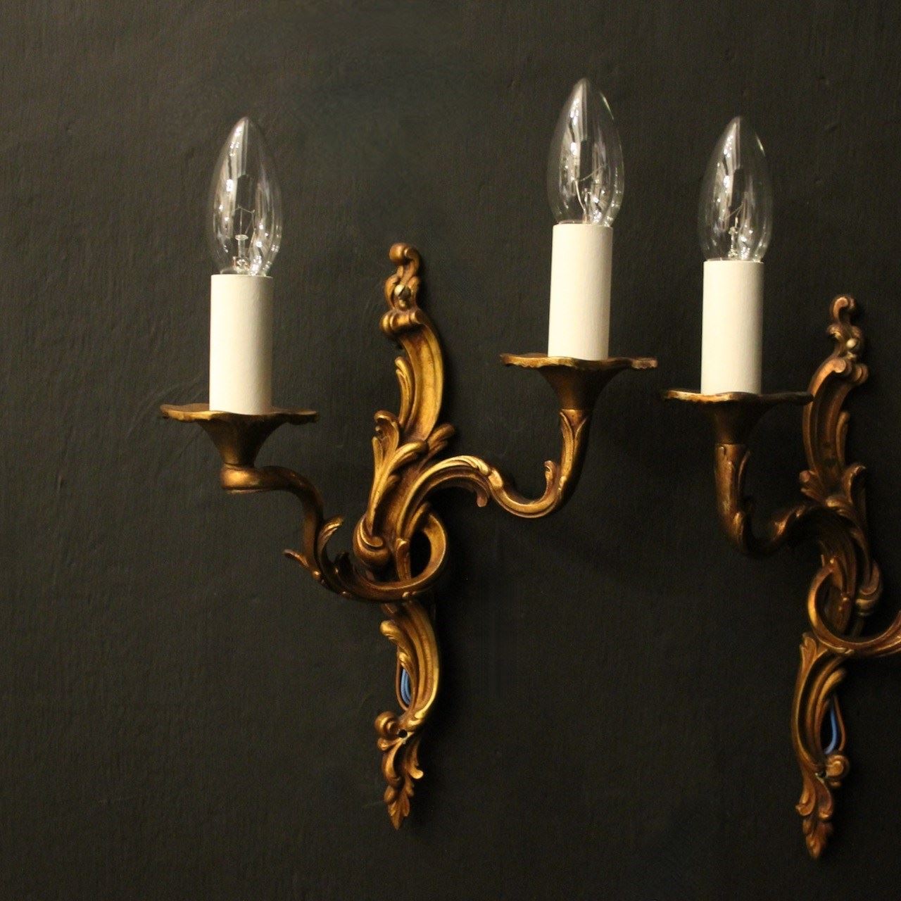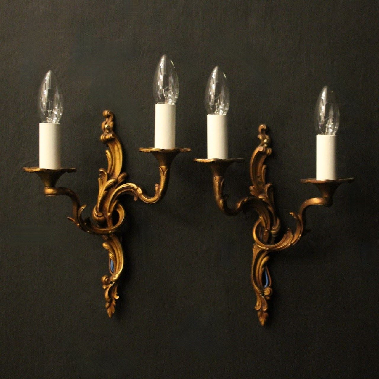 A French pair of gilded bronze twin arm opposing antique wall lights, the leaf scrolling arms with leaf trumpet bobeche drip pans, issuing from an opposing leaf elongated backplate, nice original faded gilded patination. Fully rewired and PAT tested. All our wall lights come with aged brass screws for fixing and spare bulbs.