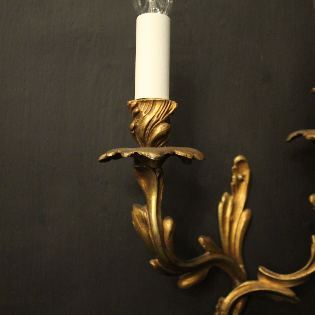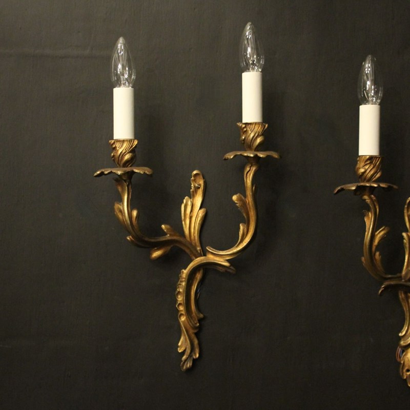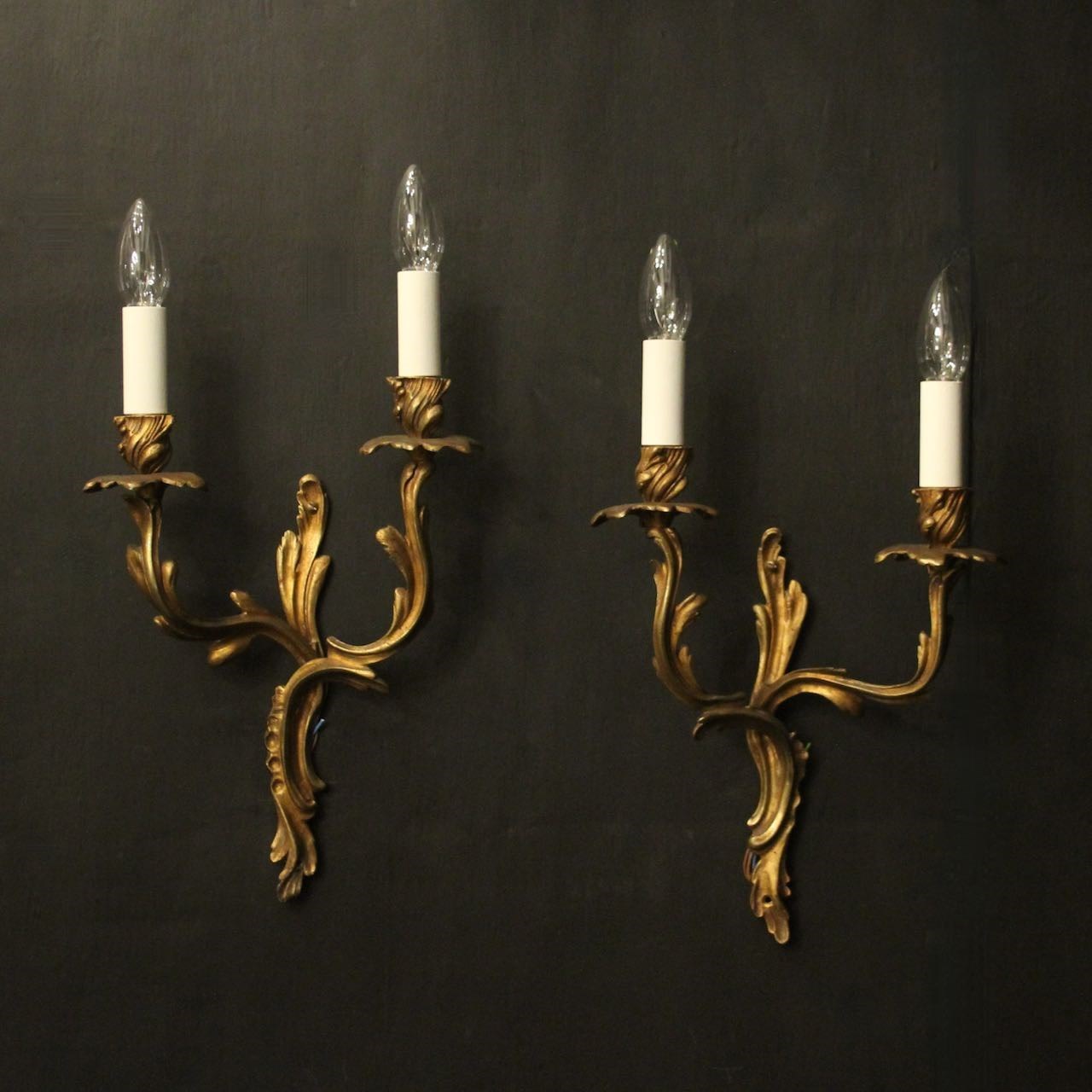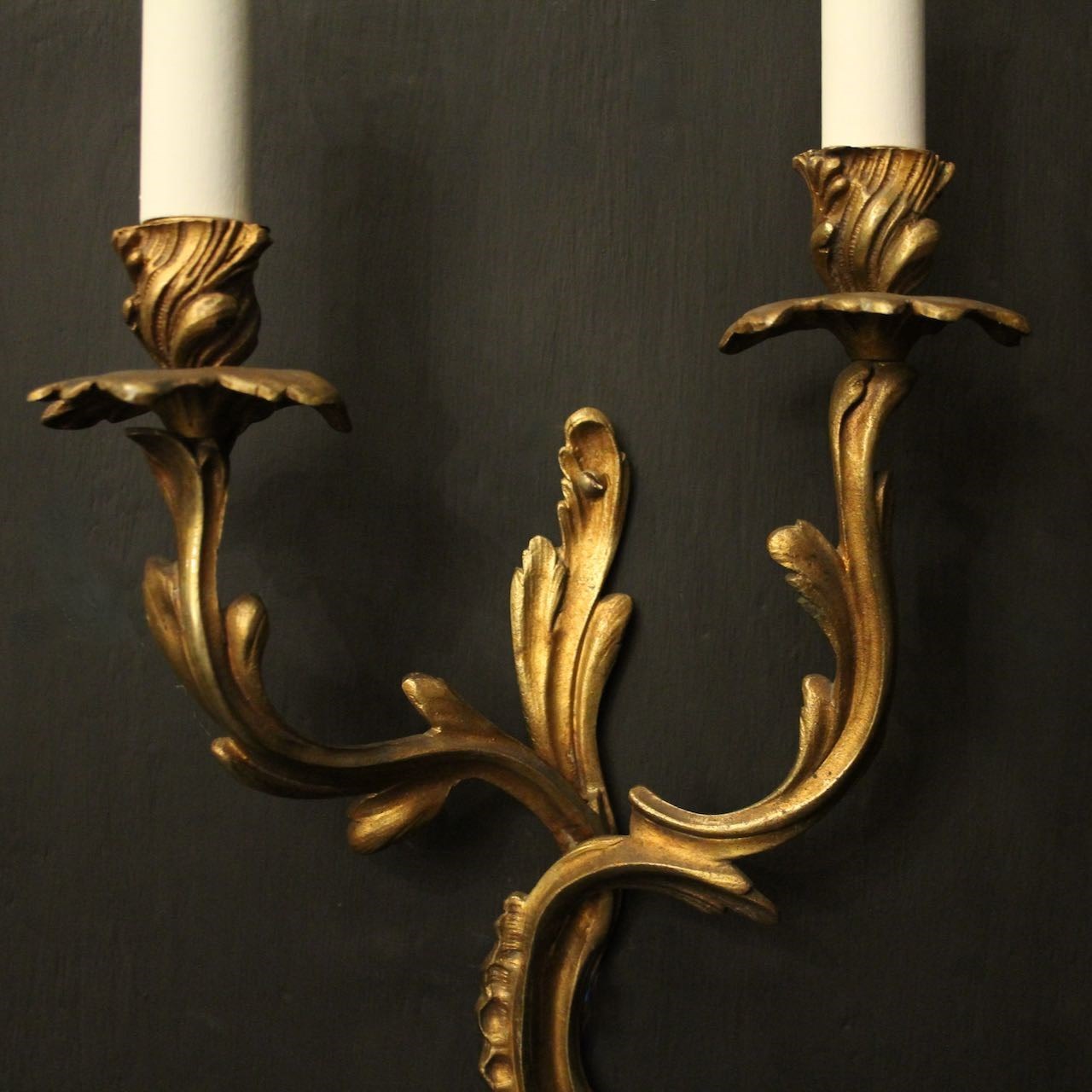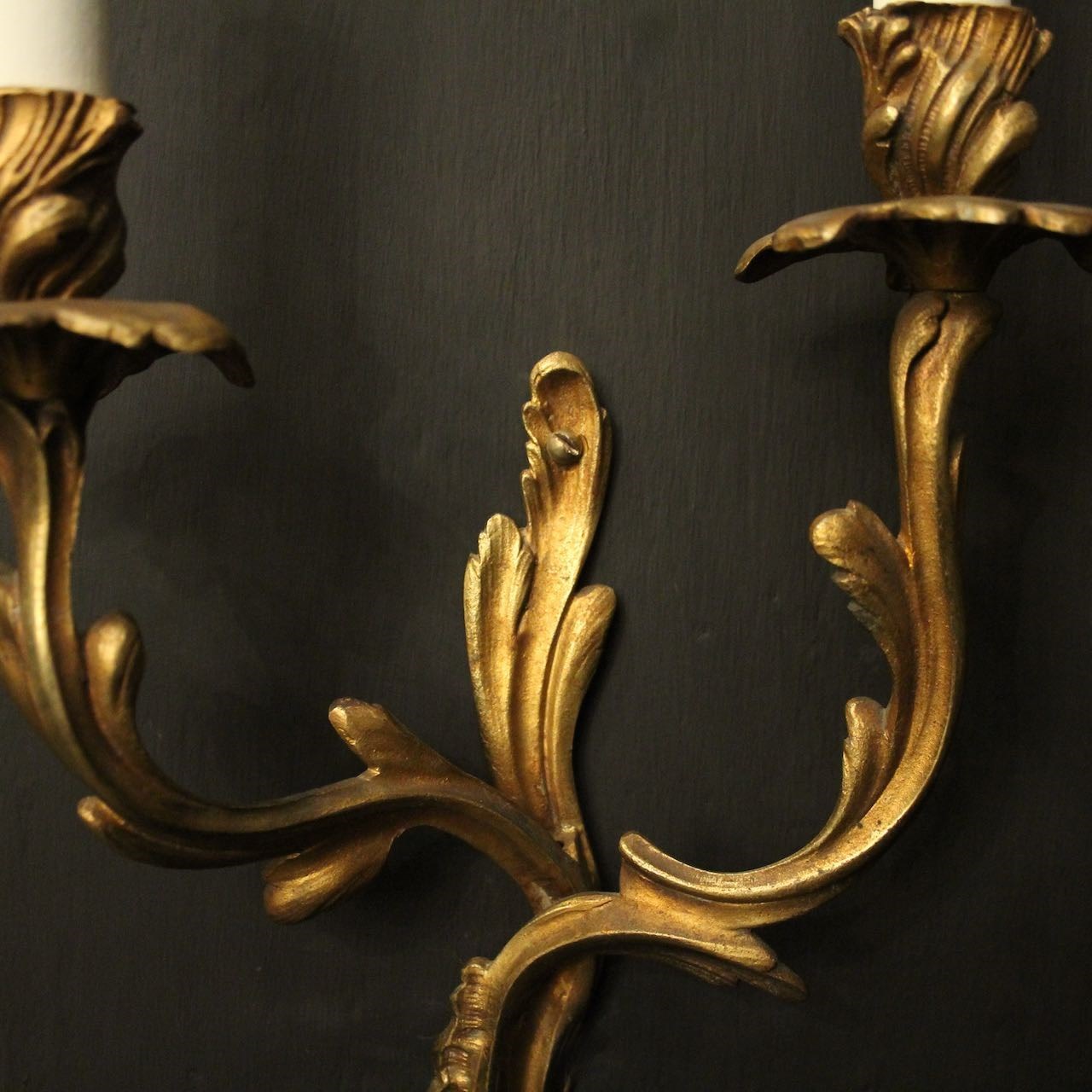 A French pair of gilded bronze twin arm opposing antique wall lights, the tiered leaf clad scrolling arms with leaf bobeche drip pans and leaf bulbous candle sconces, issuing from an opposing leaf backplate, lovely original patination. Fully rewired and PAT tested. All our wall lights come with aged brass screws for fixing and spare bulbs.