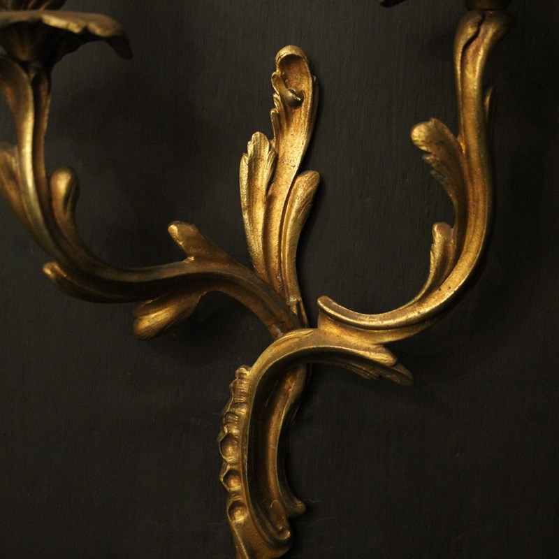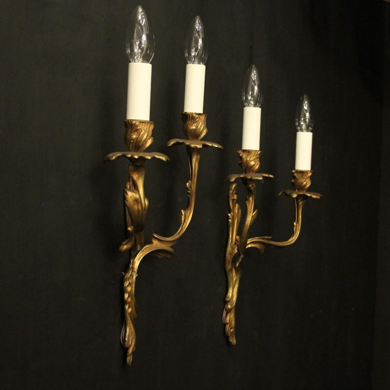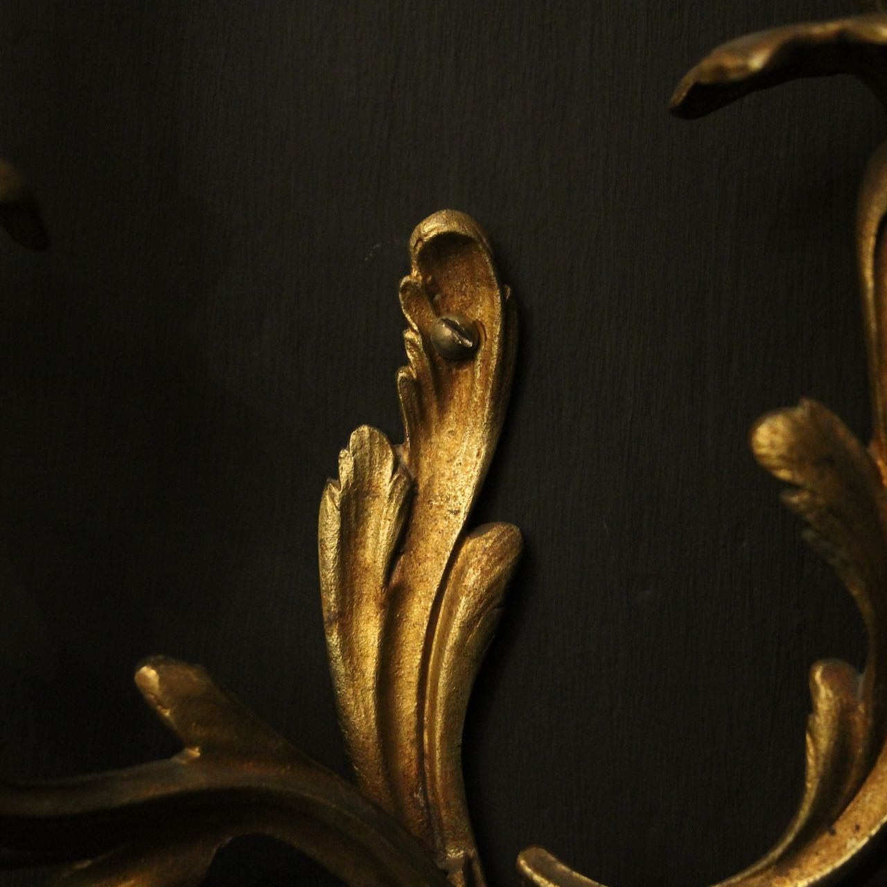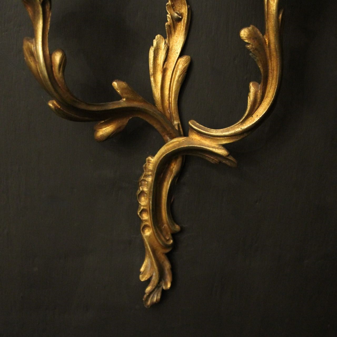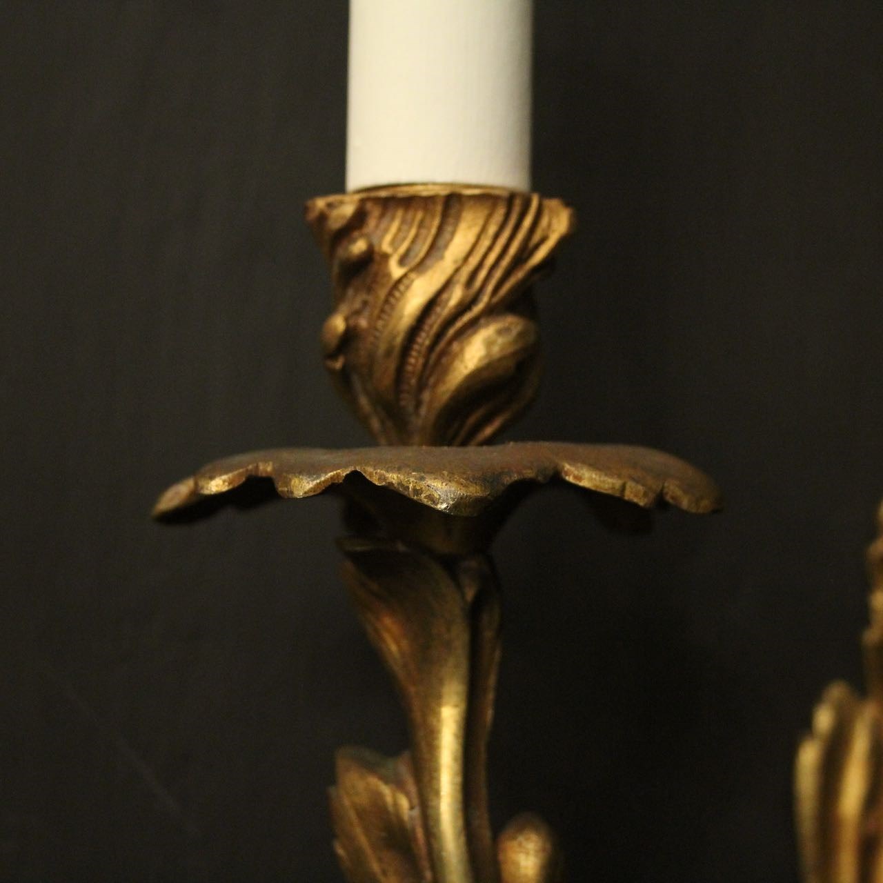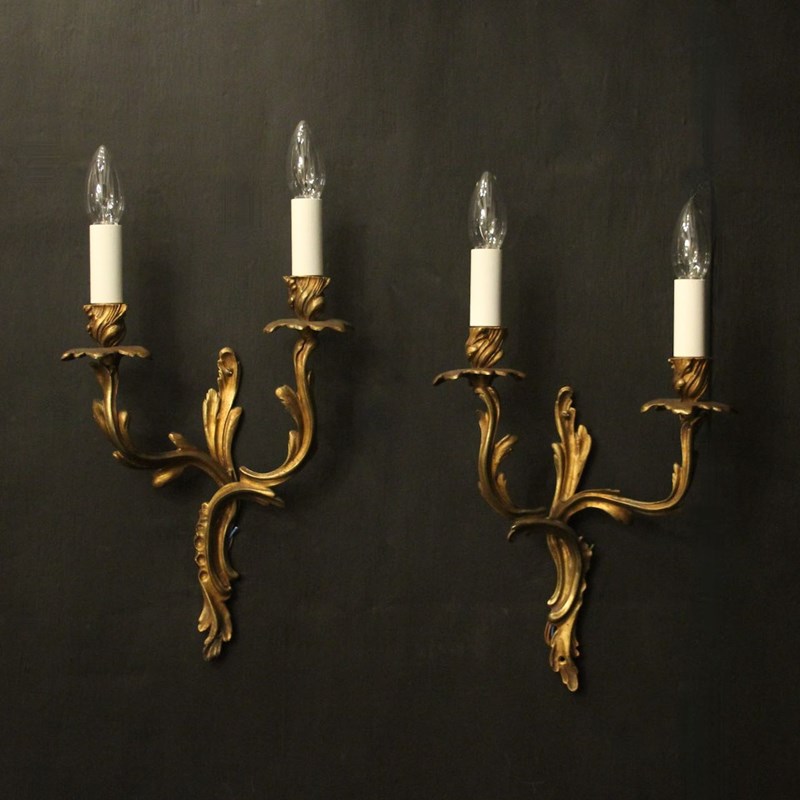 A French pair of gilded bronze twin arm opposing antique wall lights, the tiered leaf clad scrolling arms with leaf bobeche drip pans and leaf bulbous candle sconces, issuing from an opposing leaf backplate, lovely original patination. Fully rewired and PAT tested. All our wall lights come with aged brass screws for fixing and spare bulbs.