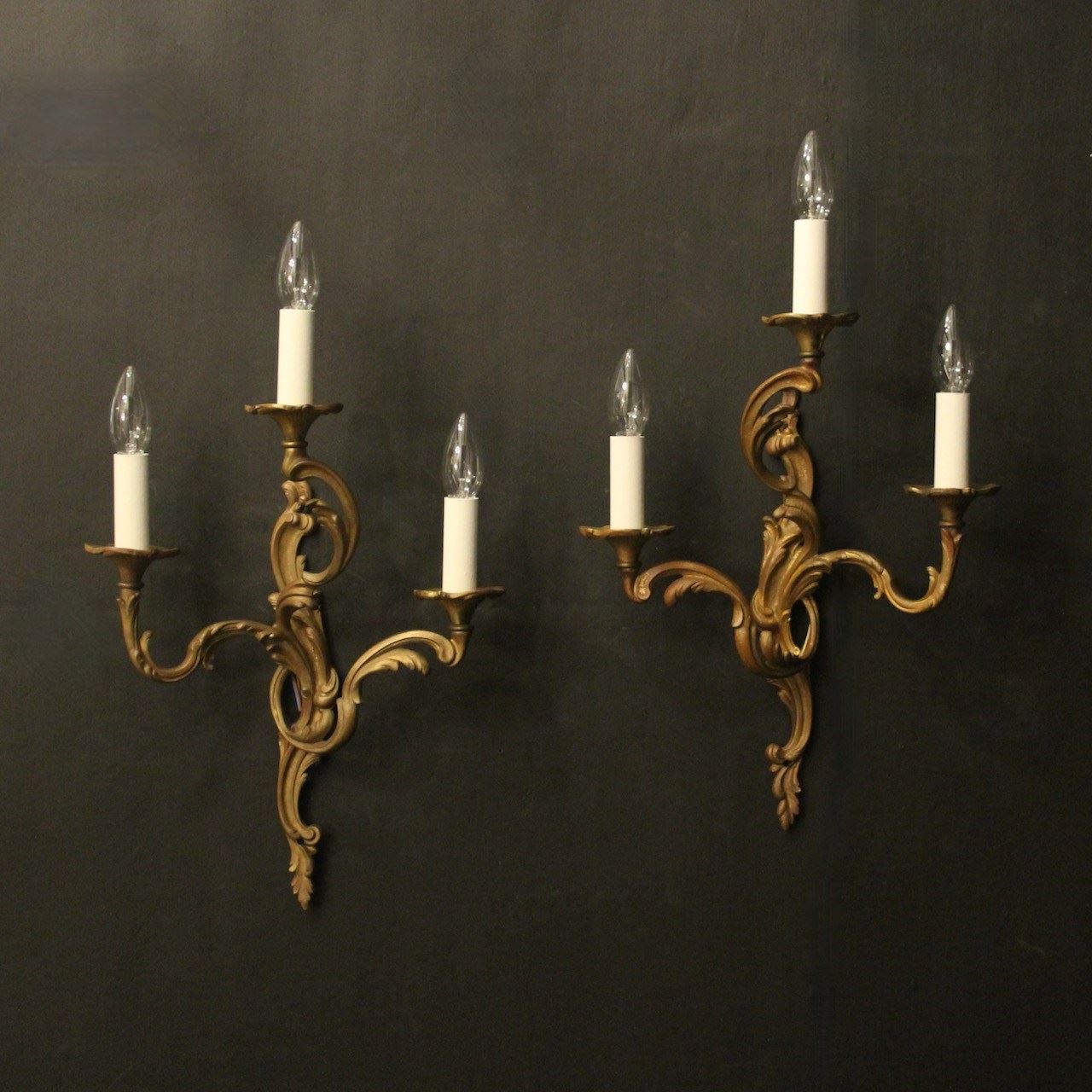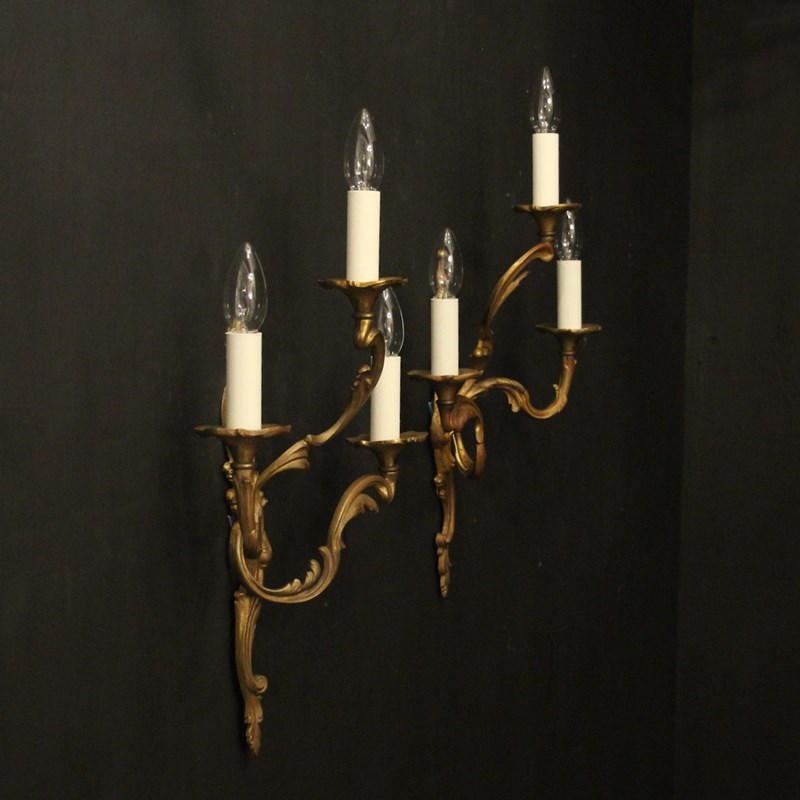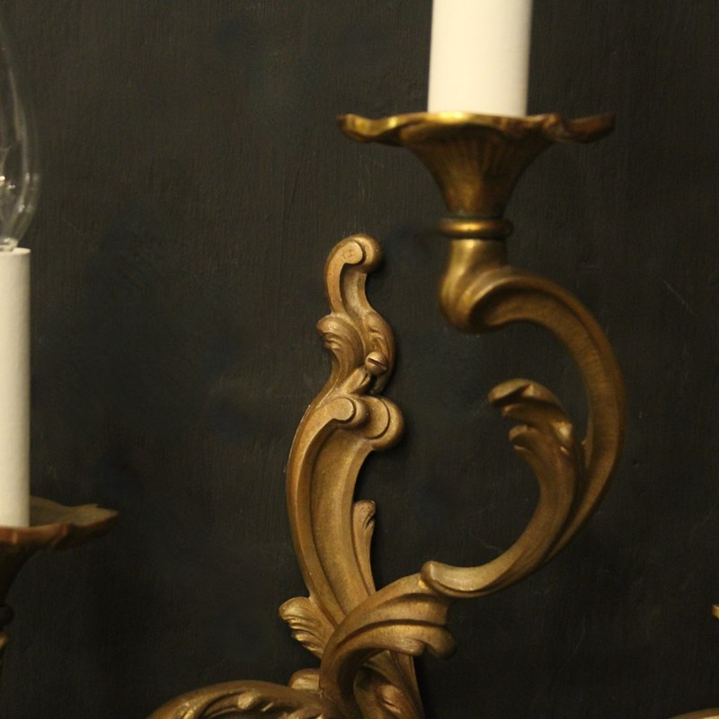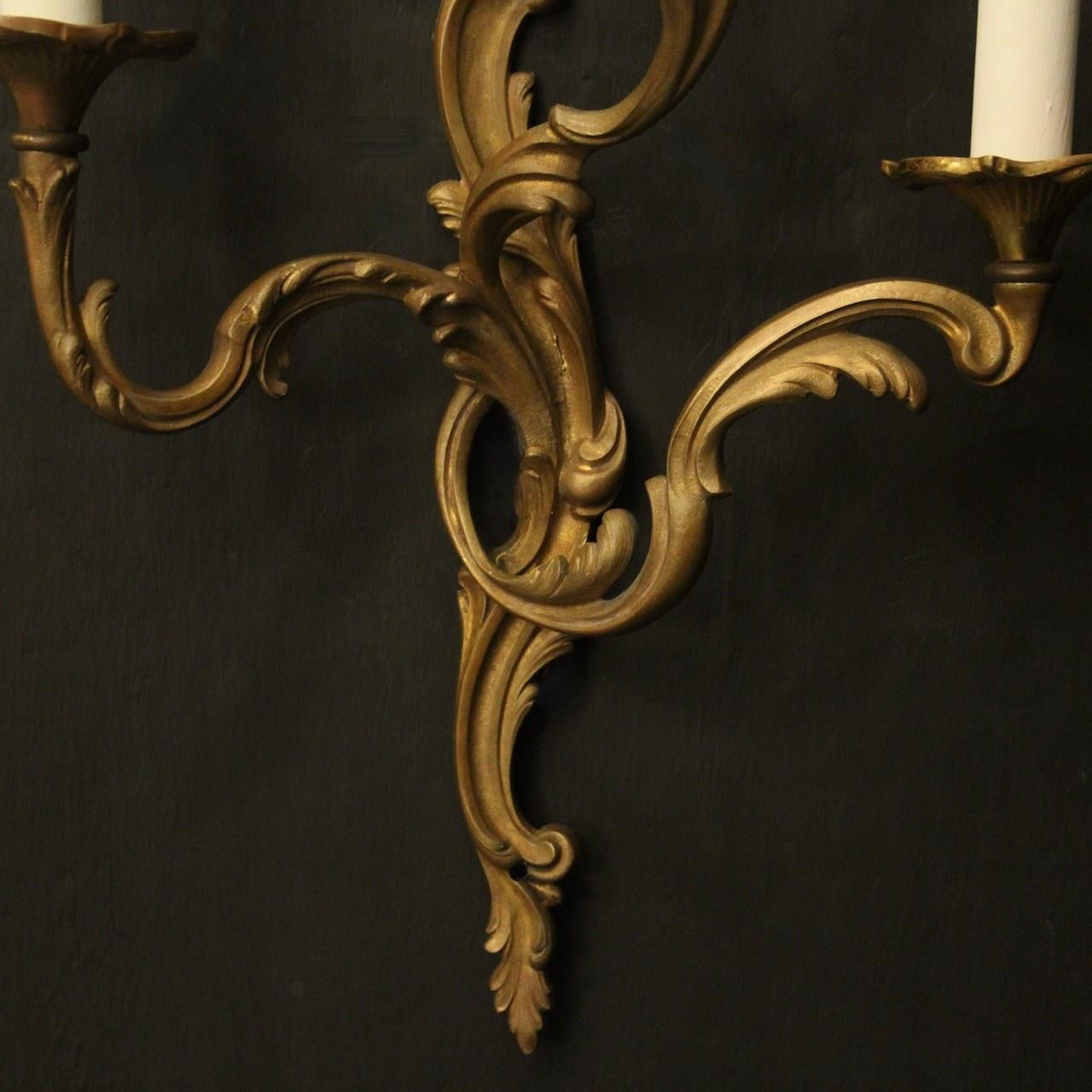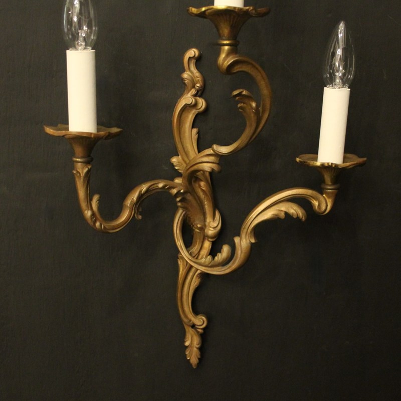 A French pair of gilded bronze triple arm opposing antique wall lights, the leaf scrolling arms with leaf trumpet bobeche drip pans, issuing from an opposing leaf elongated backplate. Lovely original colour. Fully rewired and PAT tested. All our wall lights come with aged brass screws for fixing and spare bulbs.