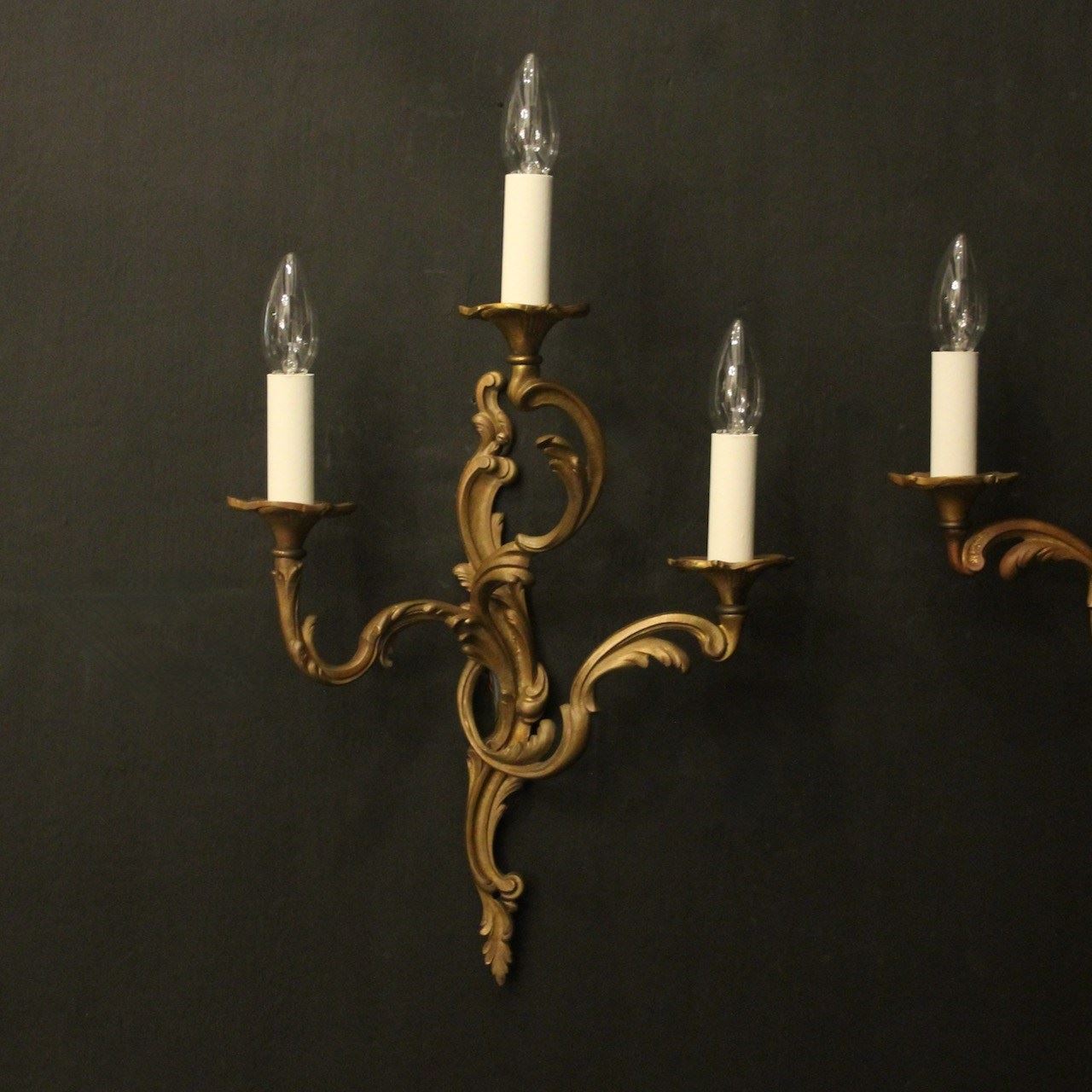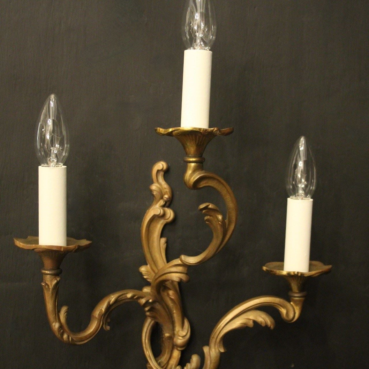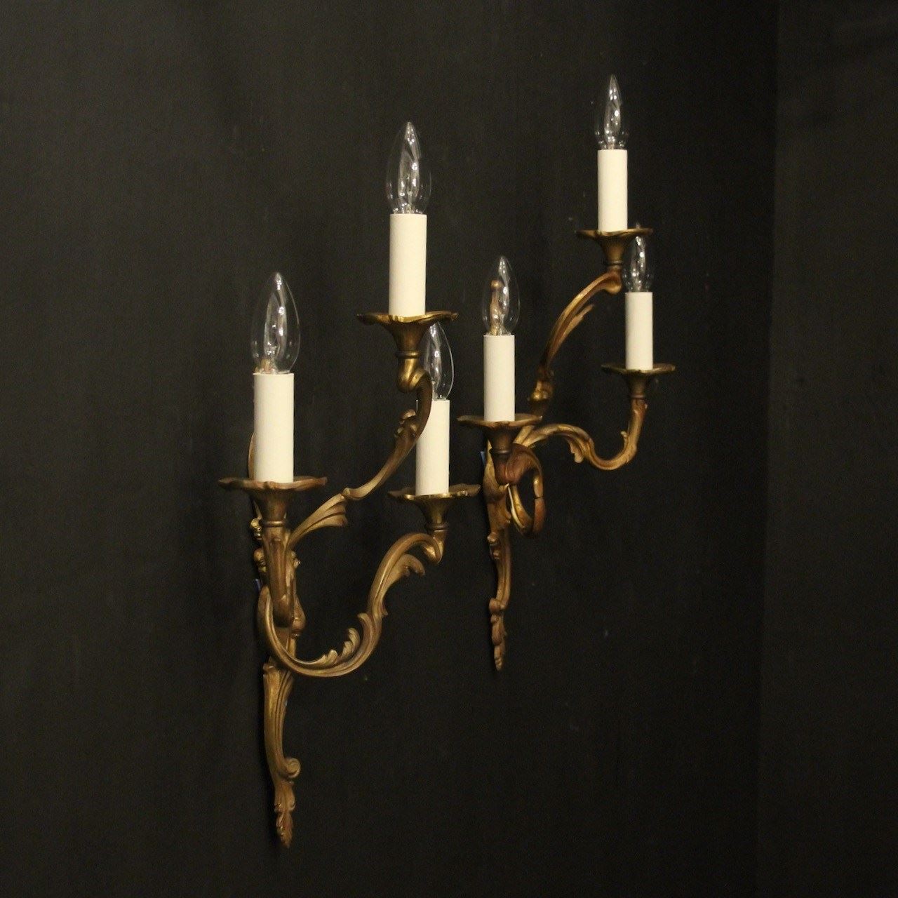 A French pair of gilded bronze triple arm opposing antique wall lights, the leaf scrolling arms with leaf trumpet bobeche drip pans, issuing from an opposing leaf elongated backplate. Lovely original colour. Fully rewired and PAT tested. All our wall lights come with aged brass screws for fixing and spare bulbs.