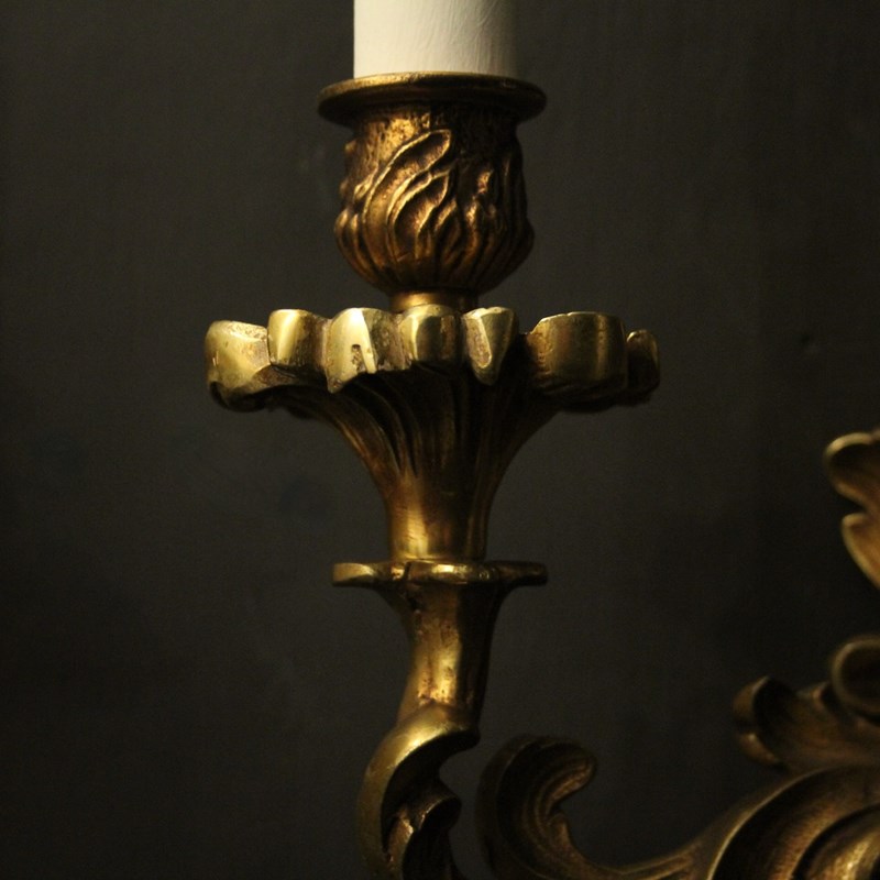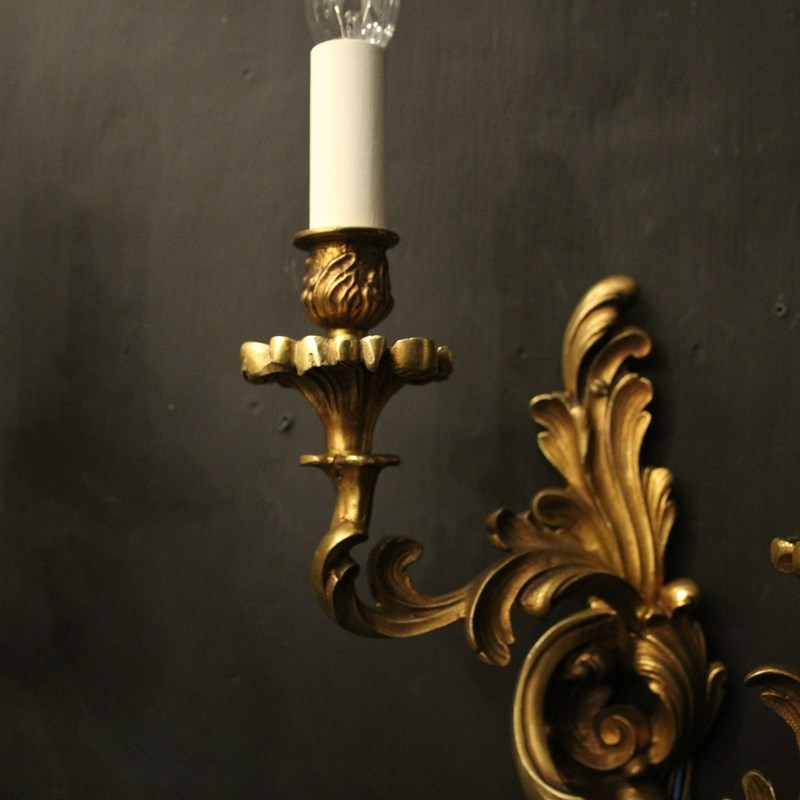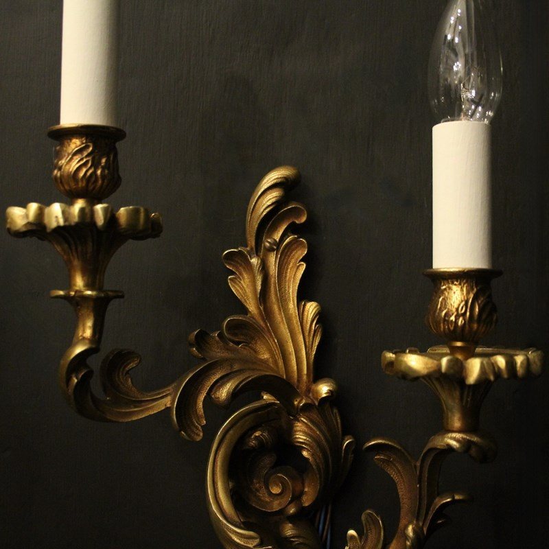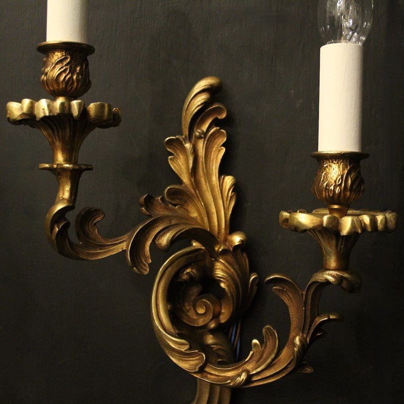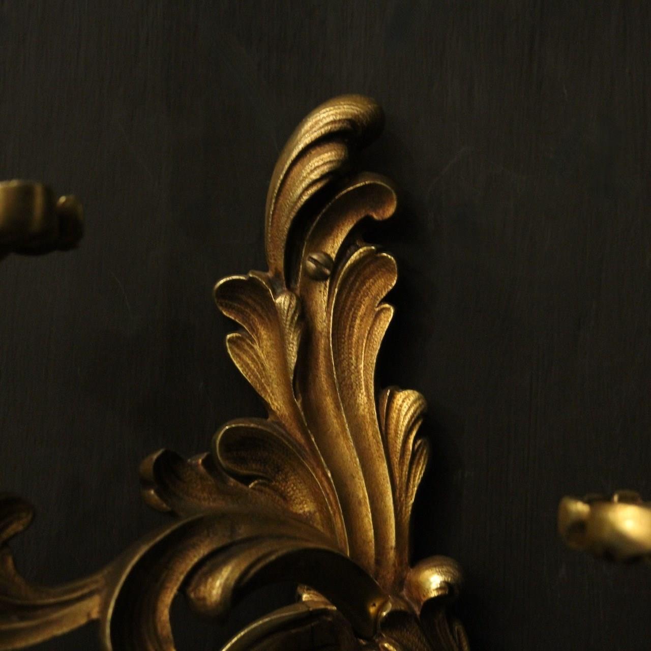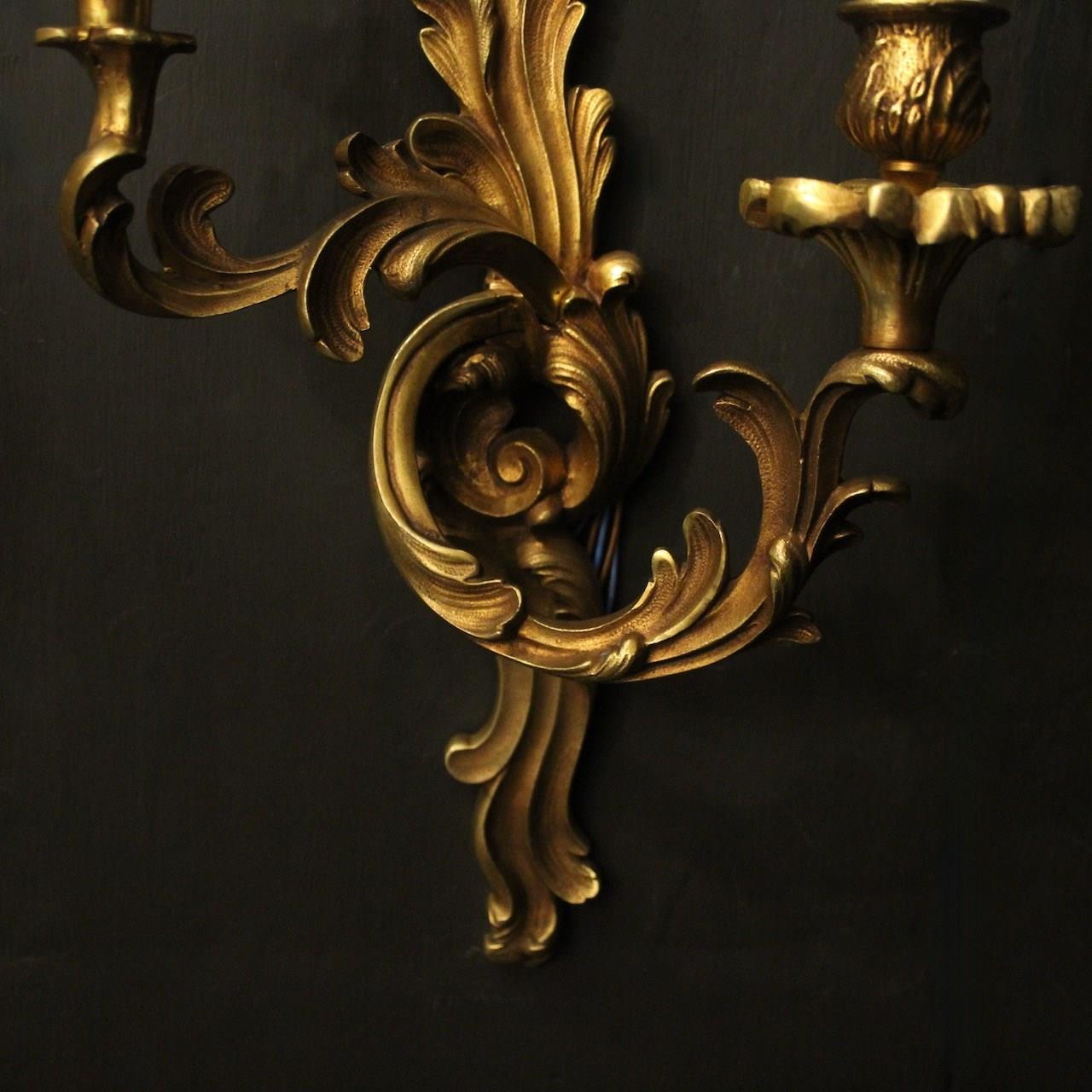 A French pair of gilded bronze twin arm opposing antique wall lights, the tiered leaf clad scrolling arms with leaf bobeche drip pans and bulbous candle sconces, issuing from an opposing leaf backplate, nice scale and well cast. Fully rewired and PAT tested. All our wall lights come with aged brass screws for fixing and spare bulbs.