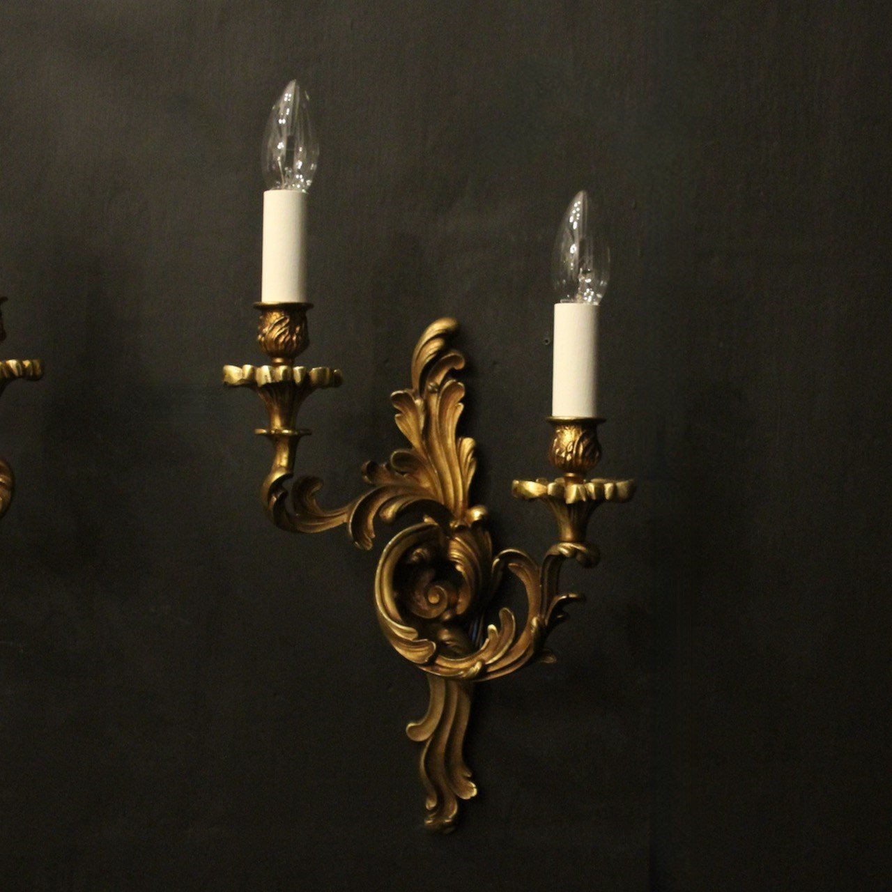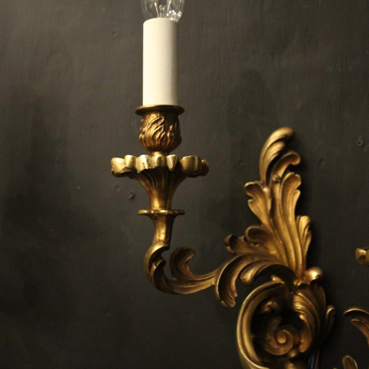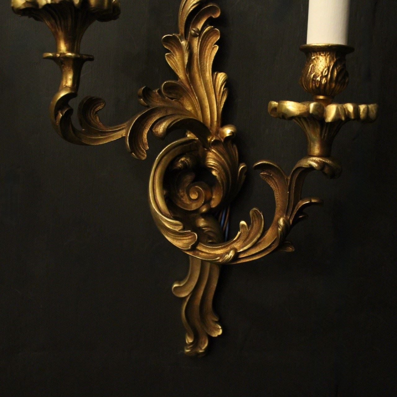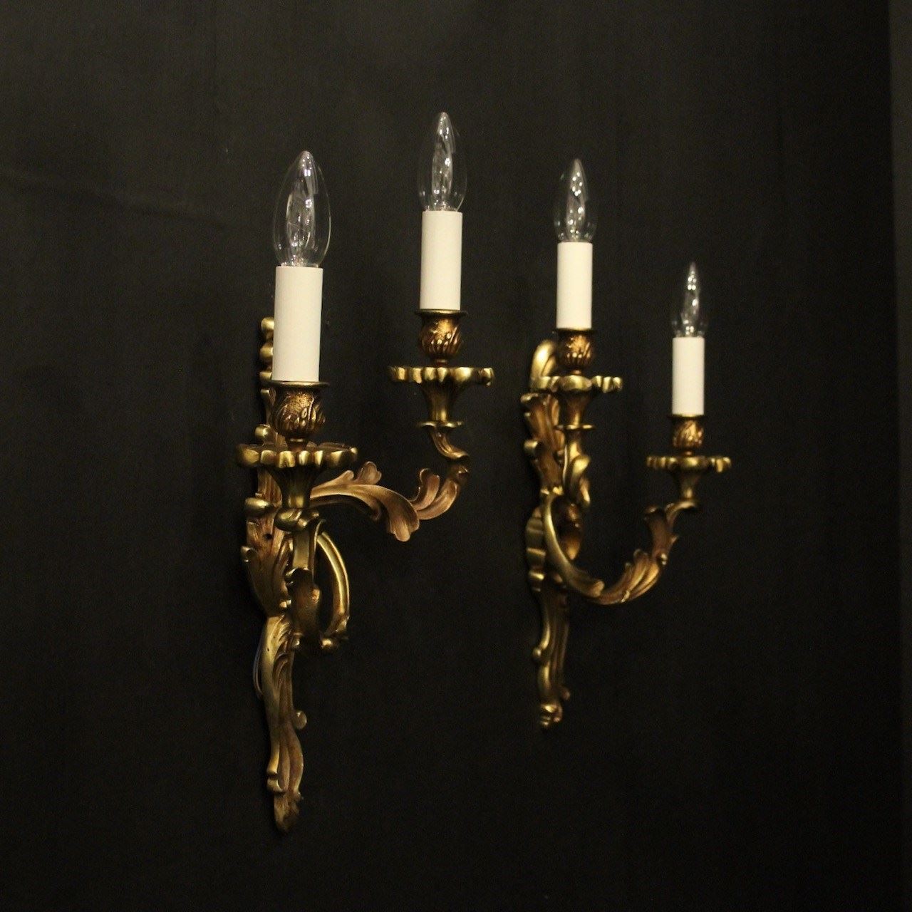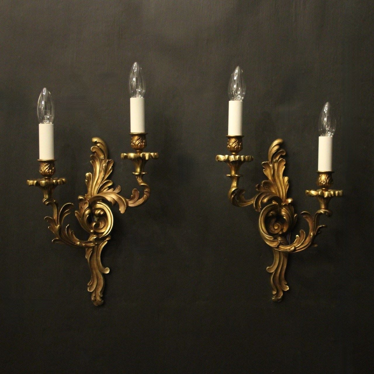 A French pair of gilded bronze twin arm opposing antique wall lights, the tiered leaf clad scrolling arms with leaf bobeche drip pans and bulbous candle sconces, issuing from an opposing leaf backplate, nice scale and well cast. Fully rewired and PAT tested. All our wall lights come with aged brass screws for fixing and spare bulbs.