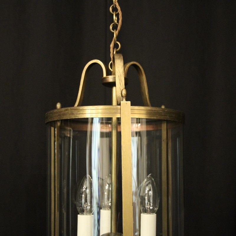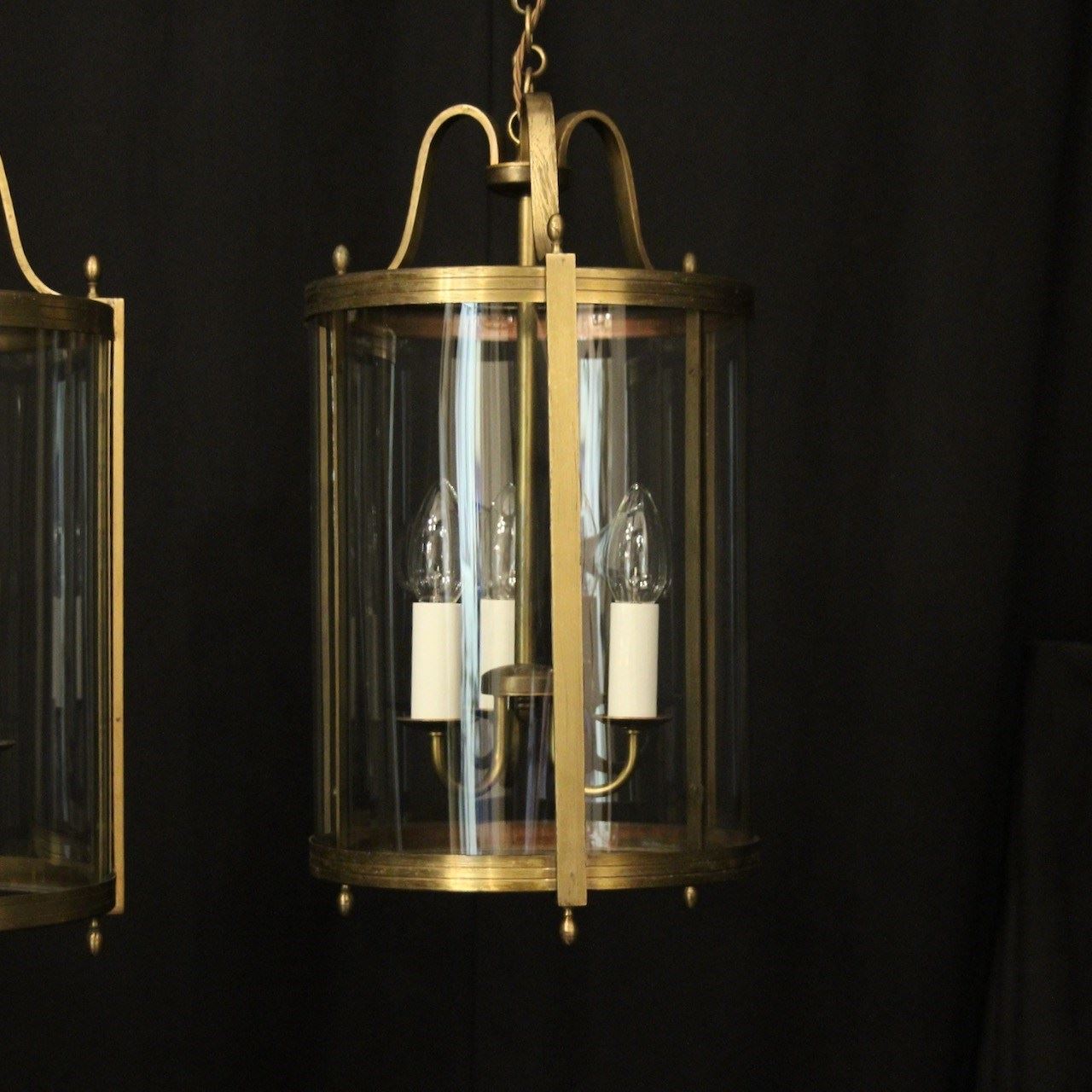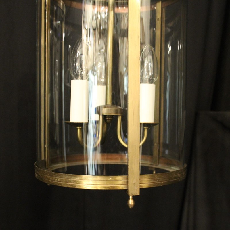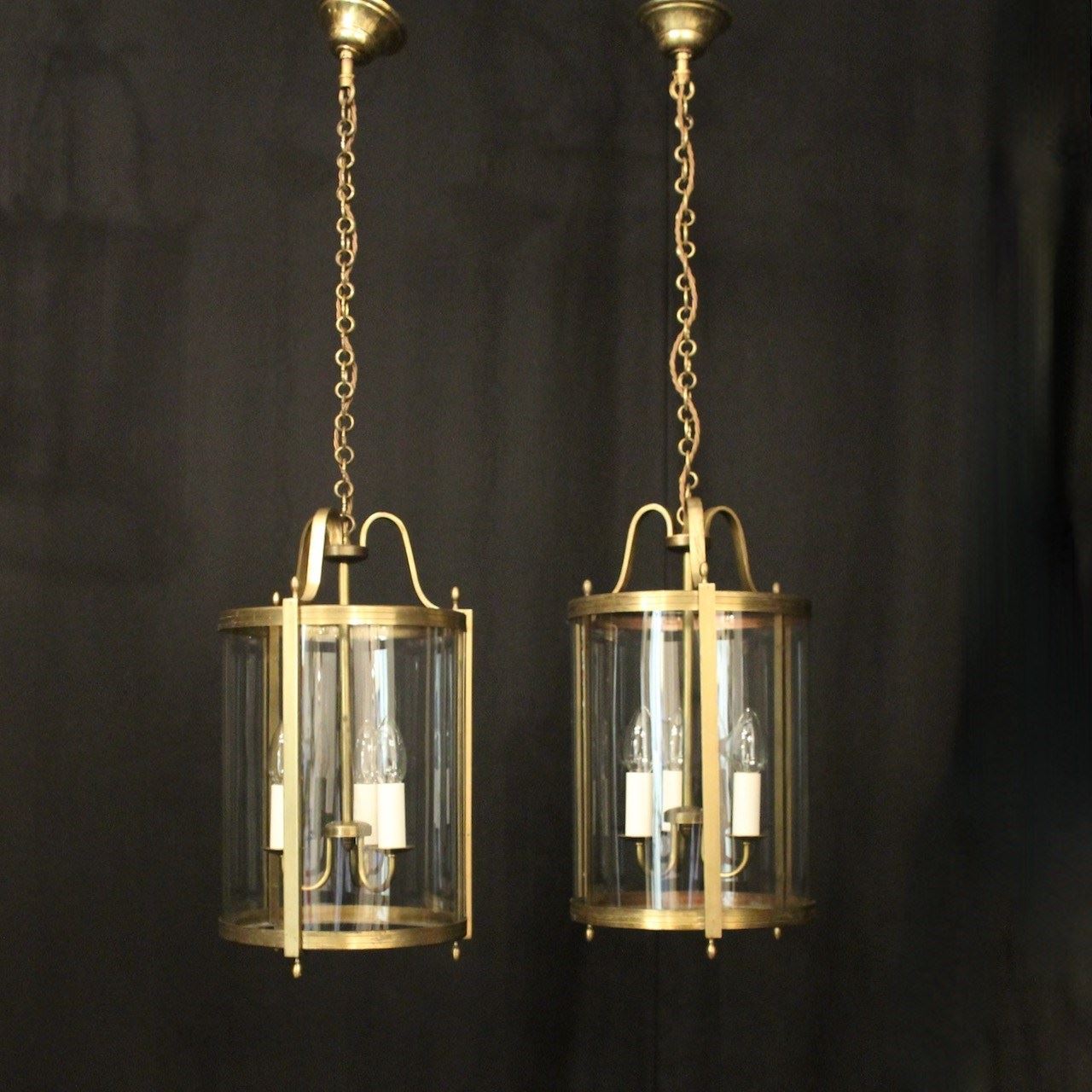 A French pair of gilded brass triple light antique hall lanterns, the three light fittings with circular bobeche drip pans, surrounded by three sectional convex glass panels and held within a decorative scrolling framework with reeded banding and scrolling canopy. Having the original chain and ceiling rose. Fully rewired and PAT tested. All our lanterns come with bulbs and ceiling fixings.