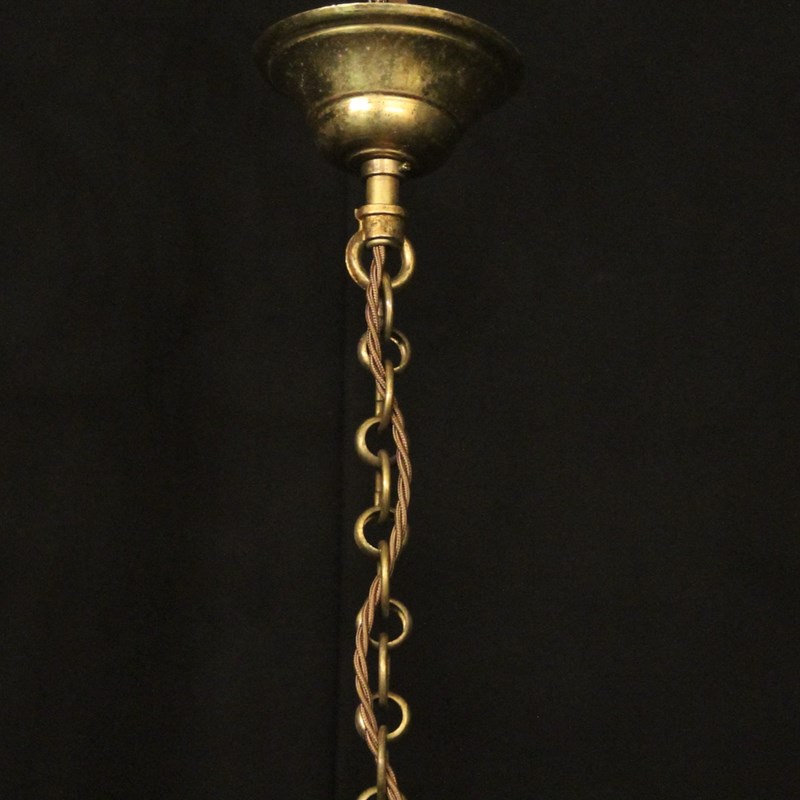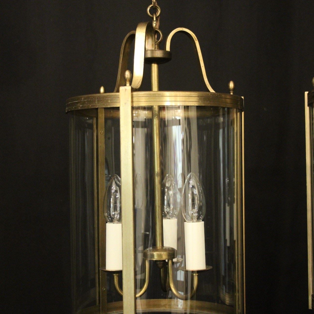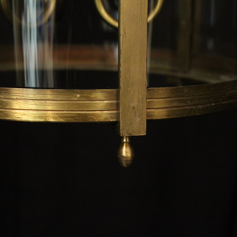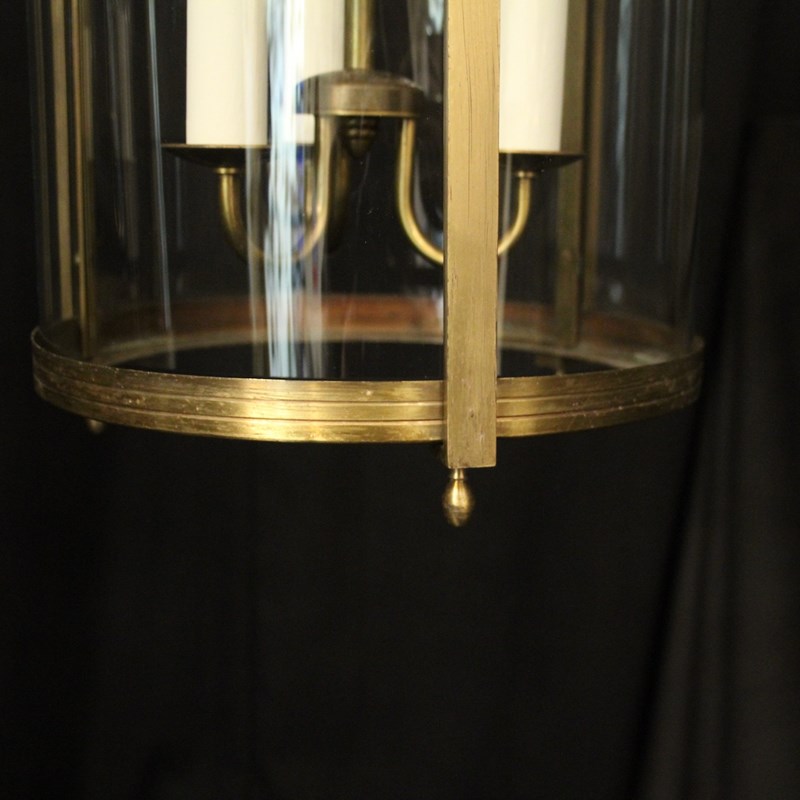A French pair of gilded brass triple light antique hall lanterns, the three light fittings with circular bobeche drip pans, surrounded by three sectional convex glass panels and held within a decorative scrolling framework with reeded banding and scrolling canopy. Having the original chain and ceiling rose. Fully rewired and PAT tested. All our lanterns come with bulbs and ceiling fixings.