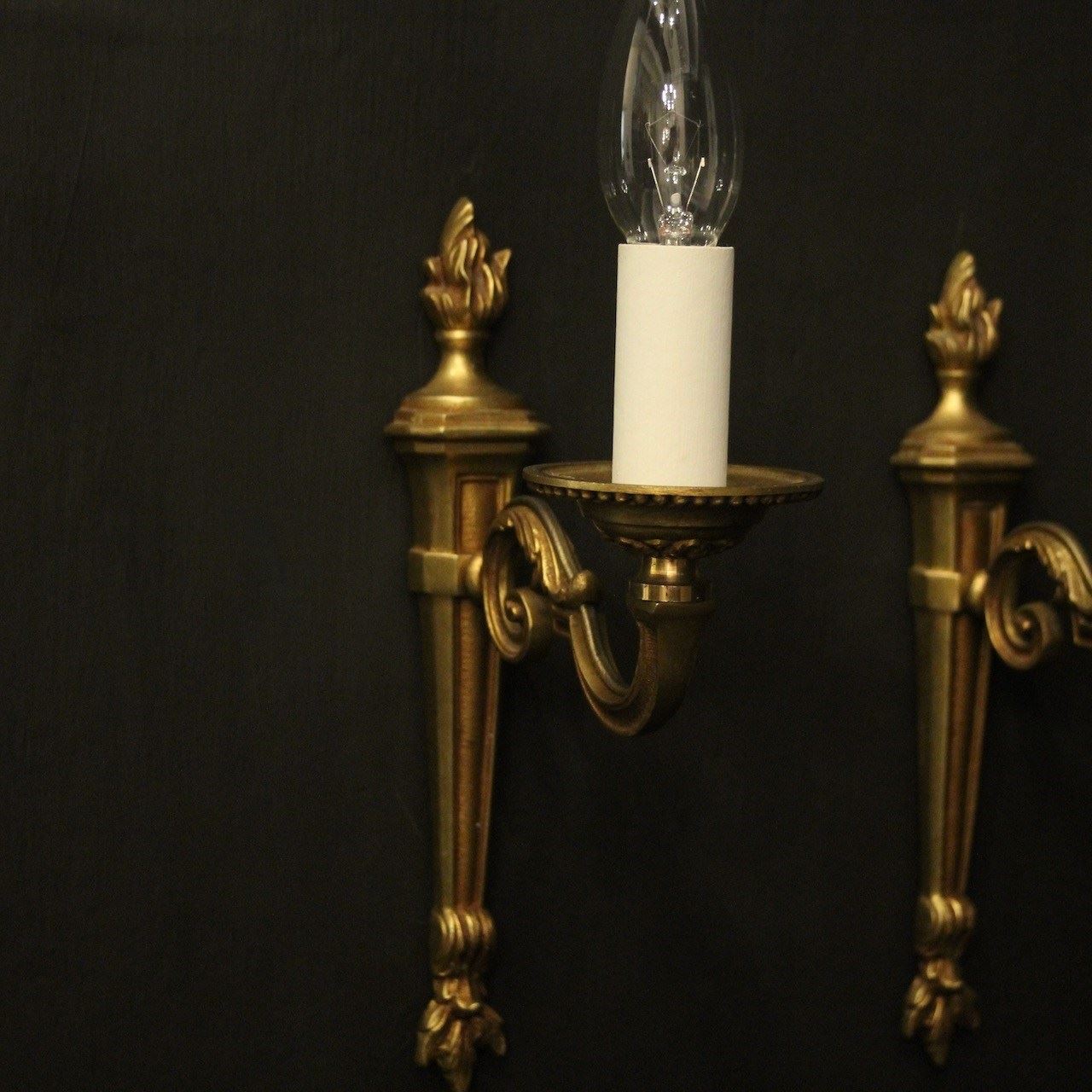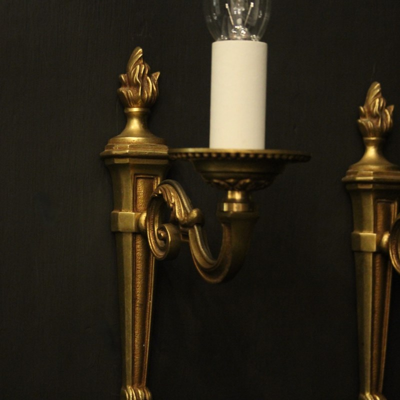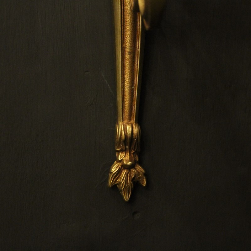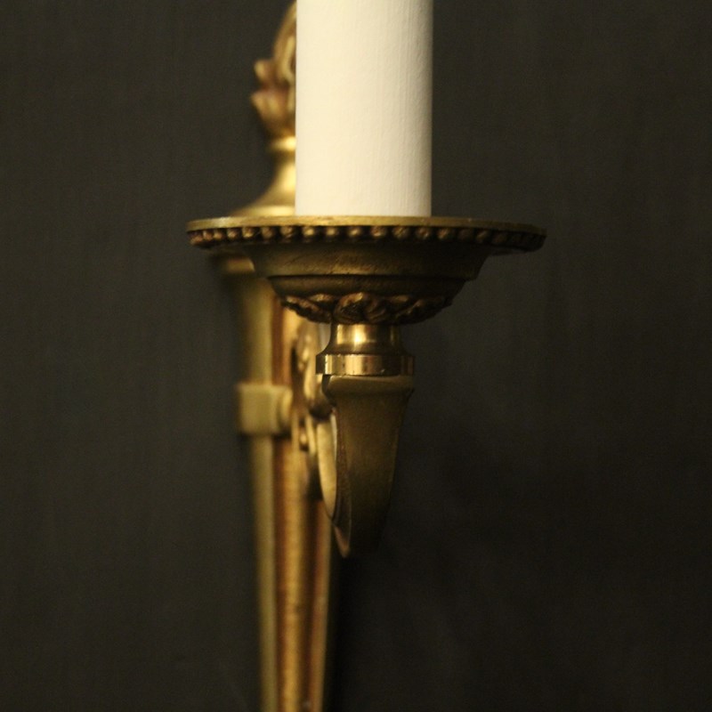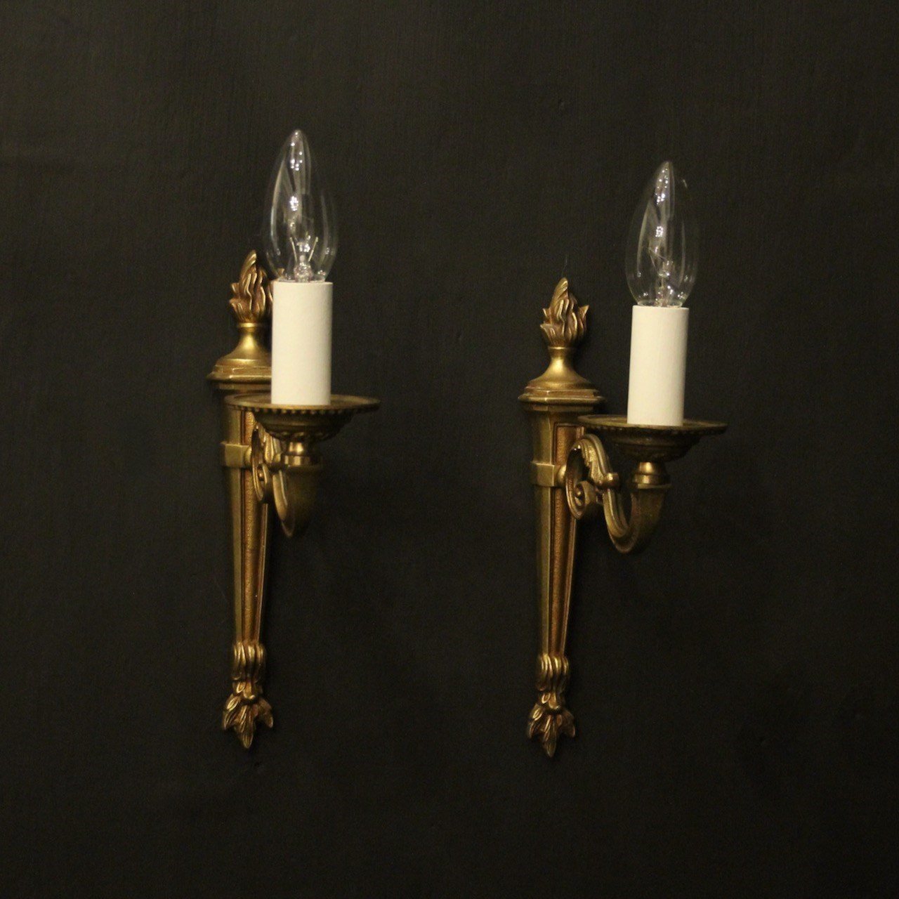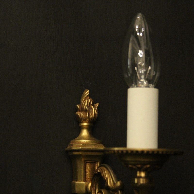 A French pair of gilded brass single arm antique wall lights, the scrolling arms with circular leaf bobeche drip pans, issuing from a reeded tapering backplate with flame finial, nice original patination. Fully rewired and PAT tested. All our wall lights come with aged brass screws for fixing and spare bulbs.