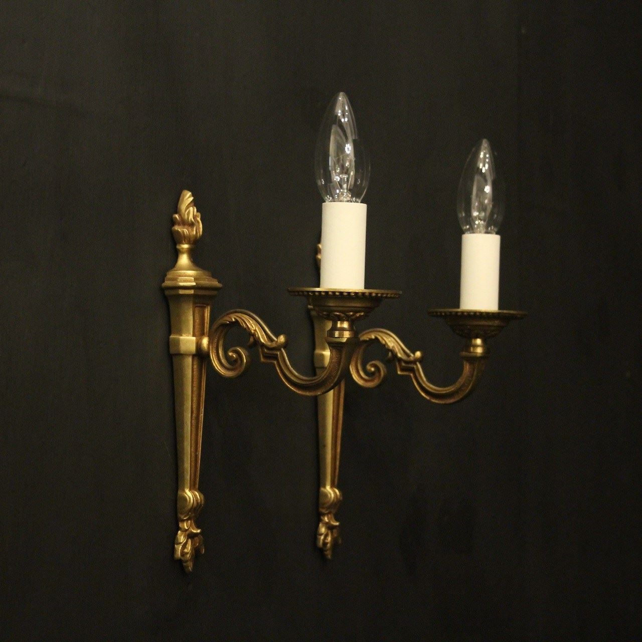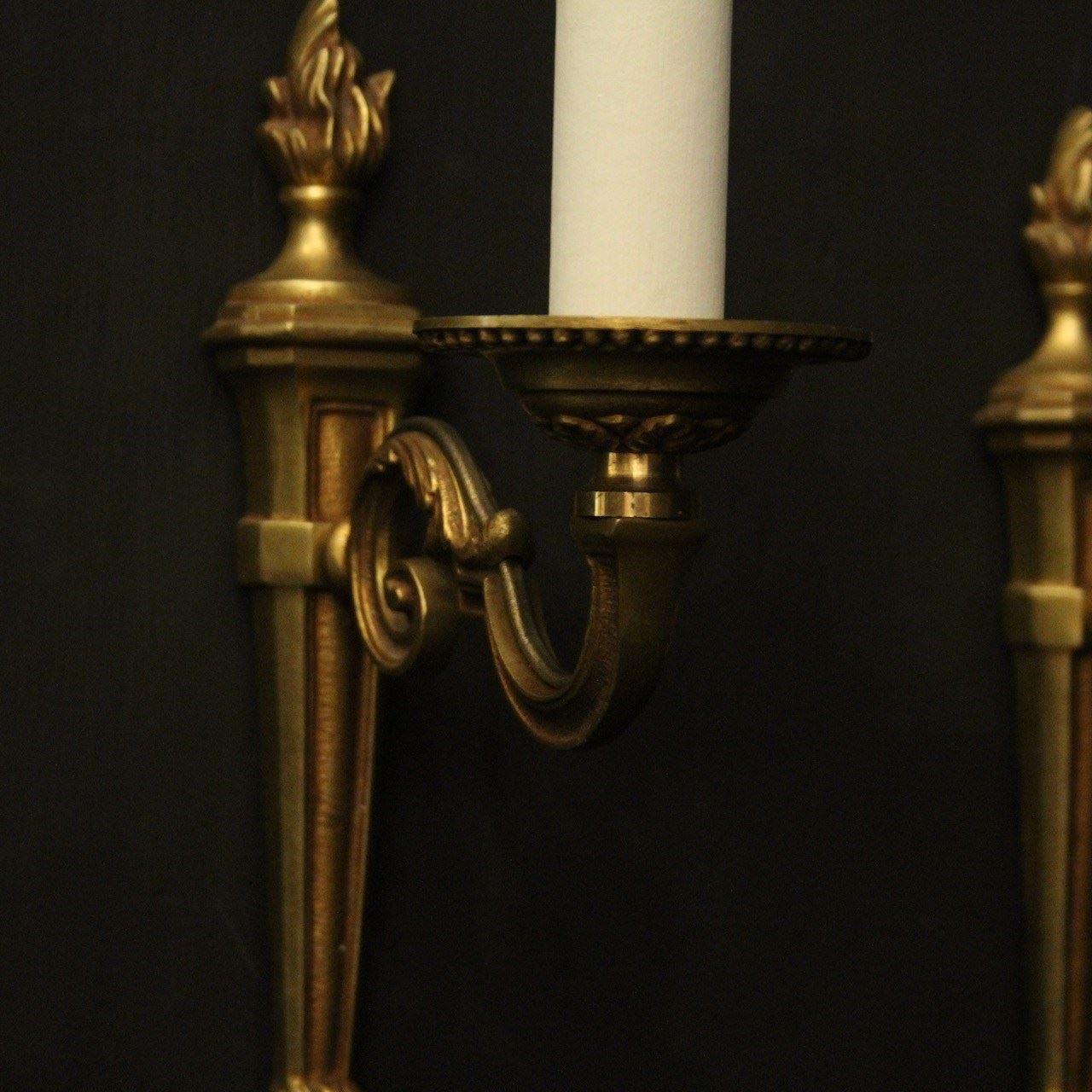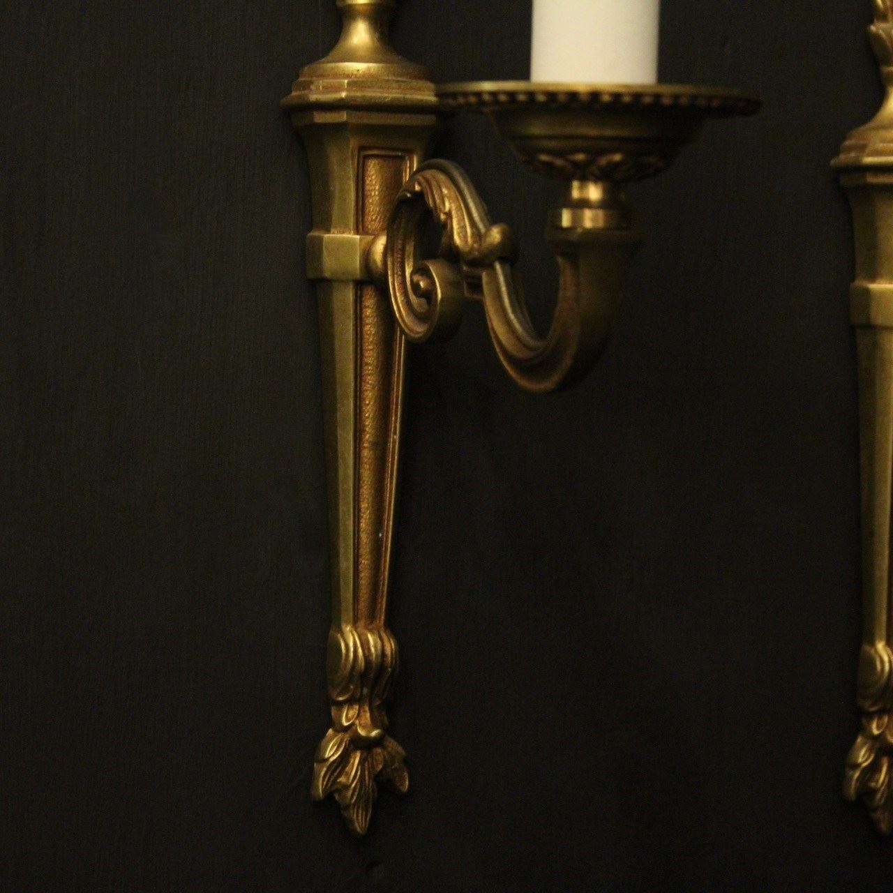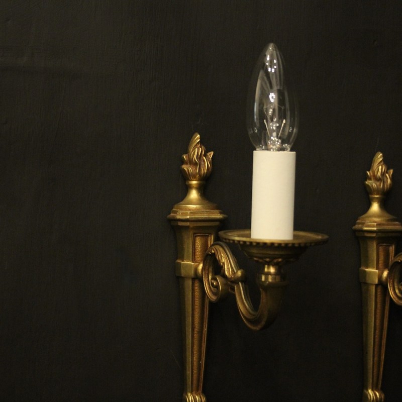 A French pair of gilded brass single arm antique wall lights, the scrolling arms with circular leaf bobeche drip pans, issuing from a reeded tapering backplate with flame finial, nice original patination. Fully rewired and PAT tested. All our wall lights come with aged brass screws for fixing and spare bulbs.