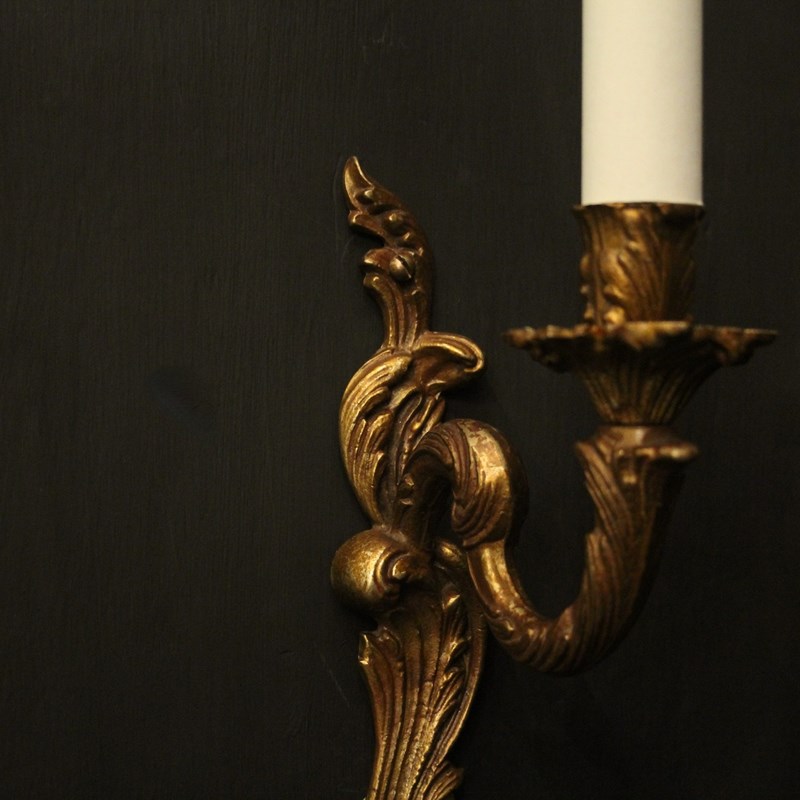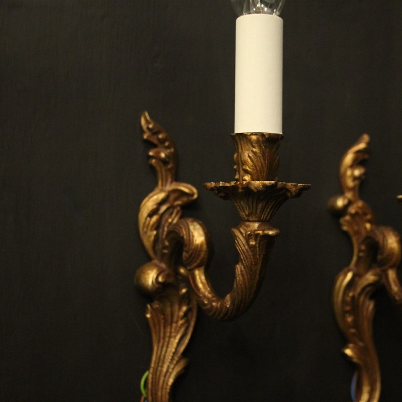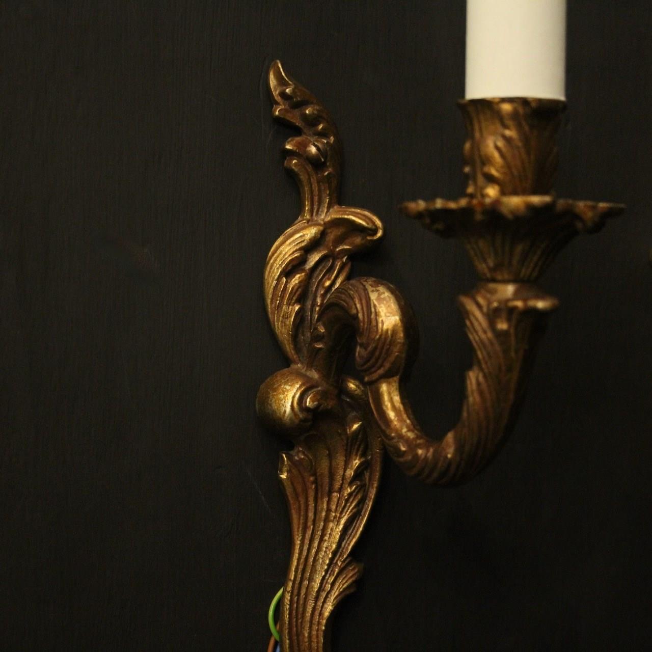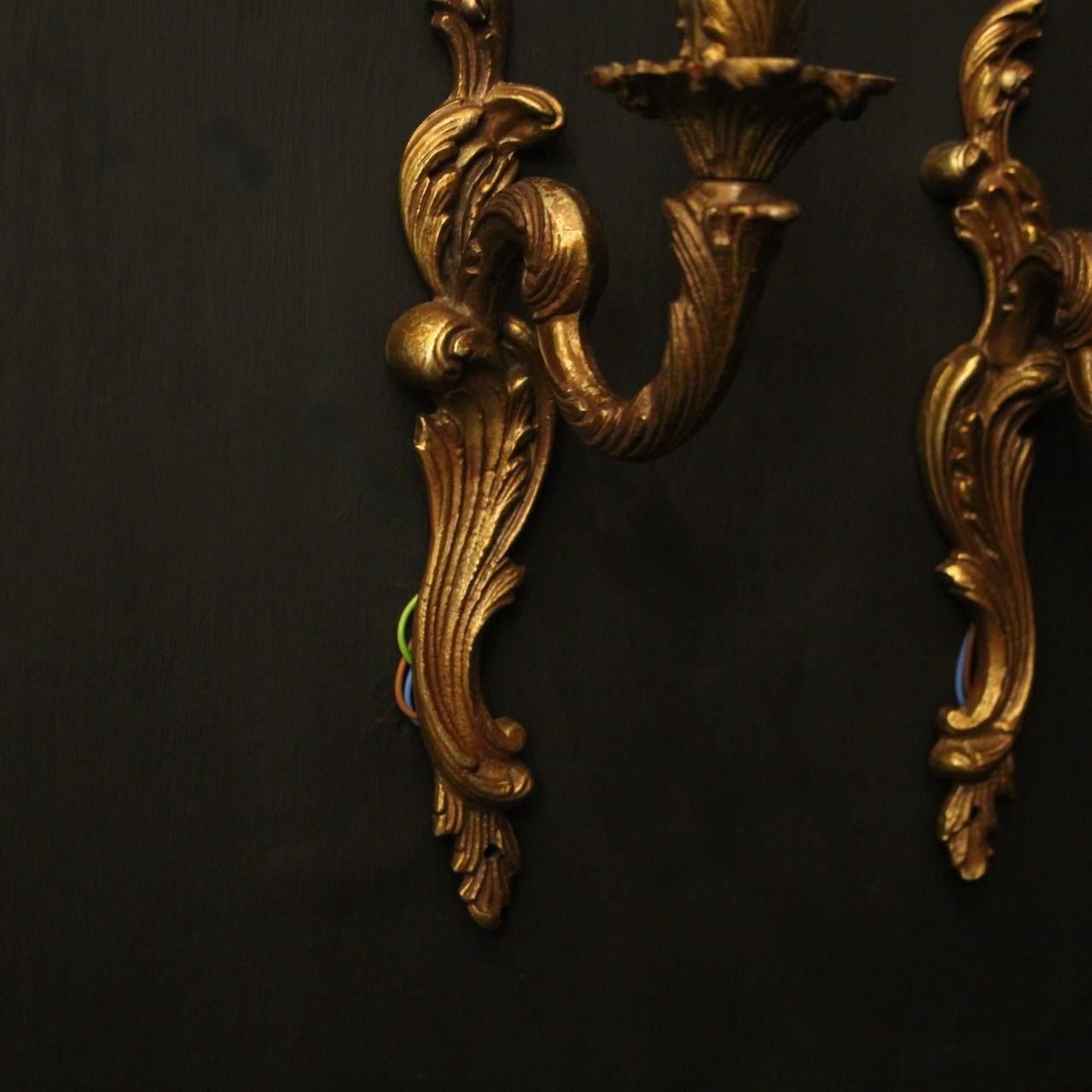 A French pair of gilded brass single arm wall lights, the leaf clad scrolling arms with leaf bobeche drip pans, issuing from an opposing leaf backplate. Fully rewired and PAT tested. All our wall lights come with aged brass screws for fixing and spare bulbs.
