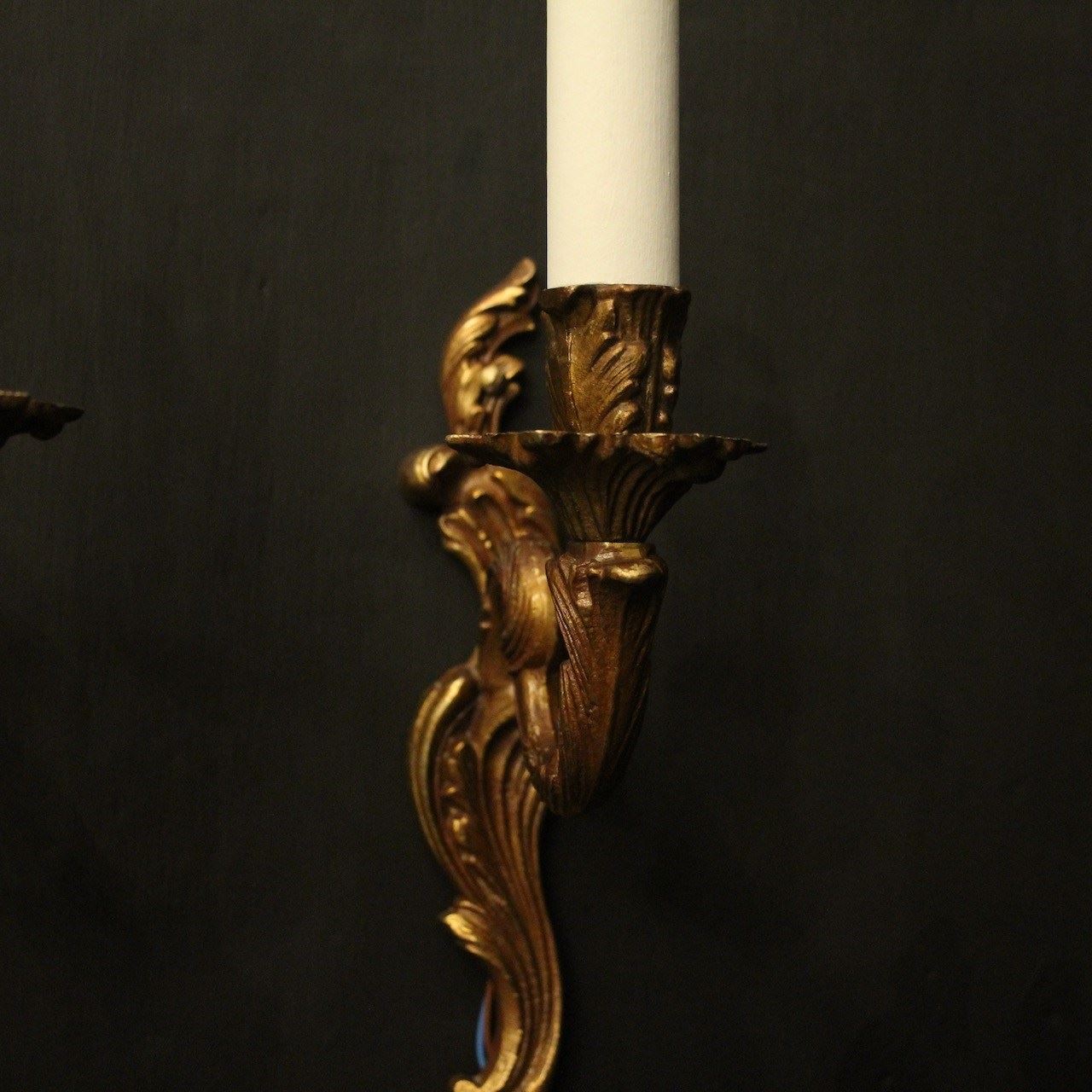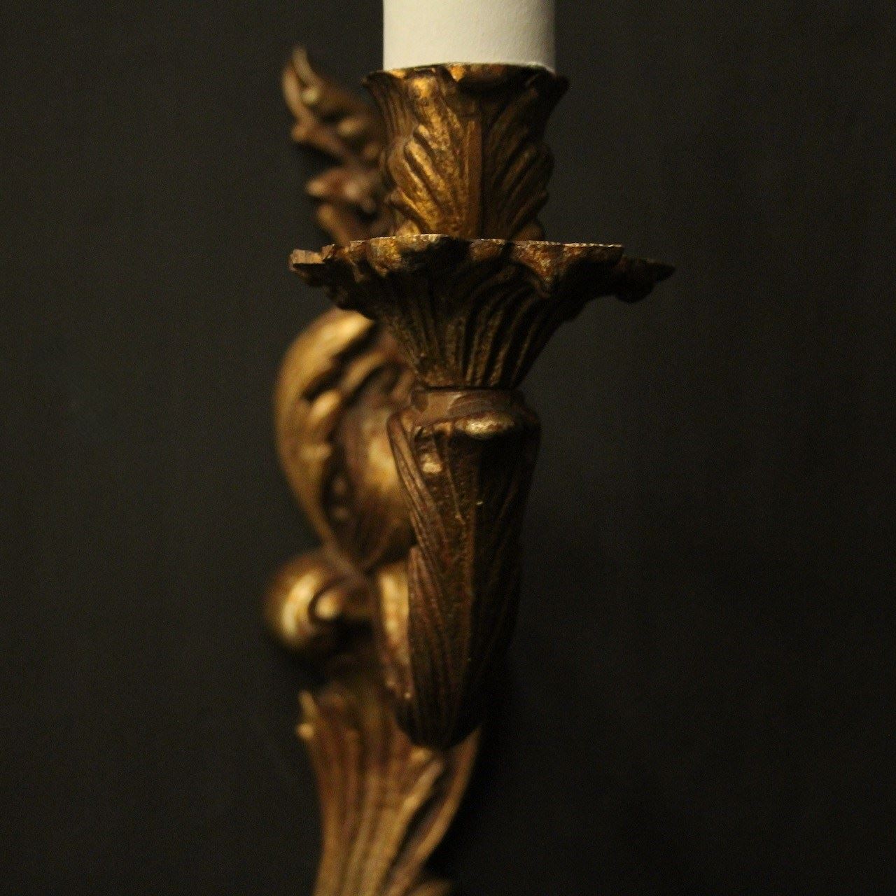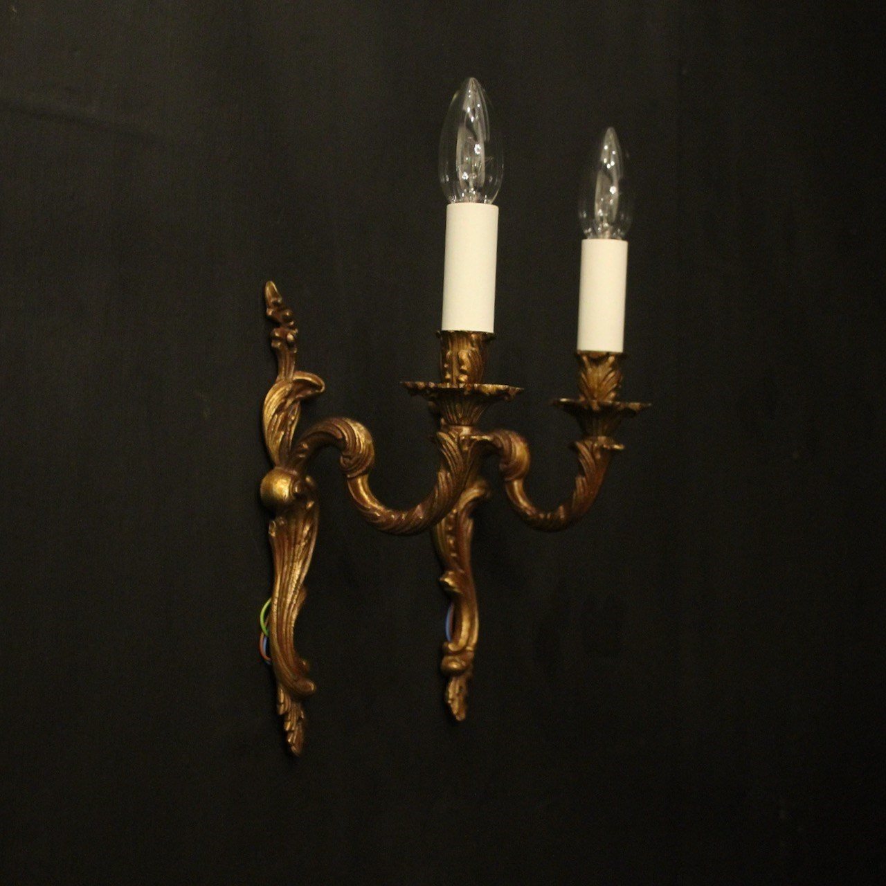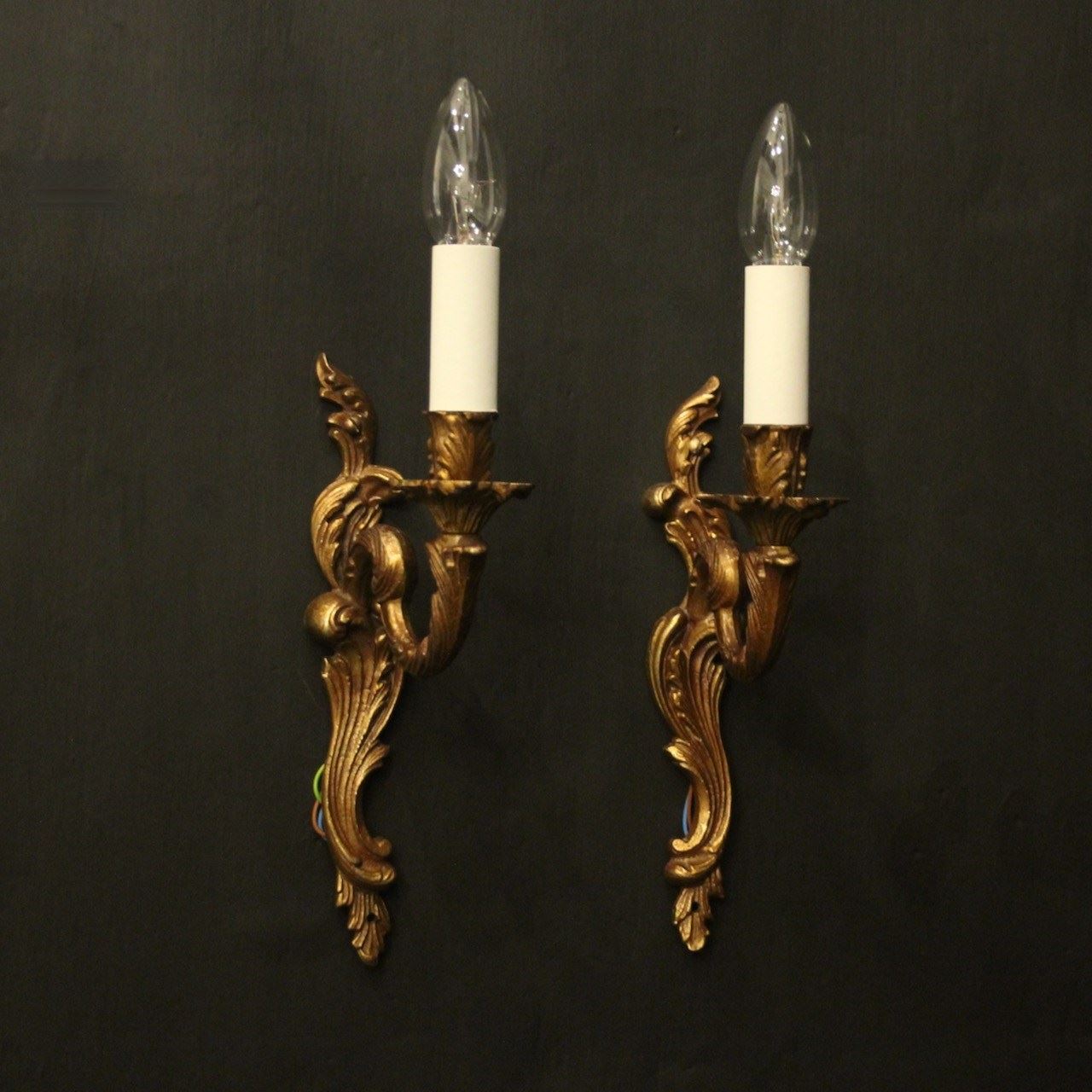 A French pair of gilded brass single arm wall lights, the leaf clad scrolling arms with leaf bobeche drip pans, issuing from an opposing leaf backplate. Fully rewired and PAT tested. All our wall lights come with aged brass screws for fixing and spare bulbs.