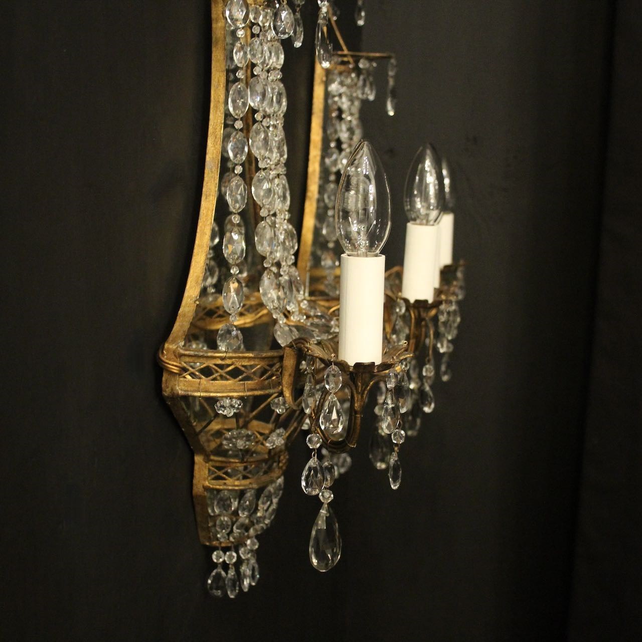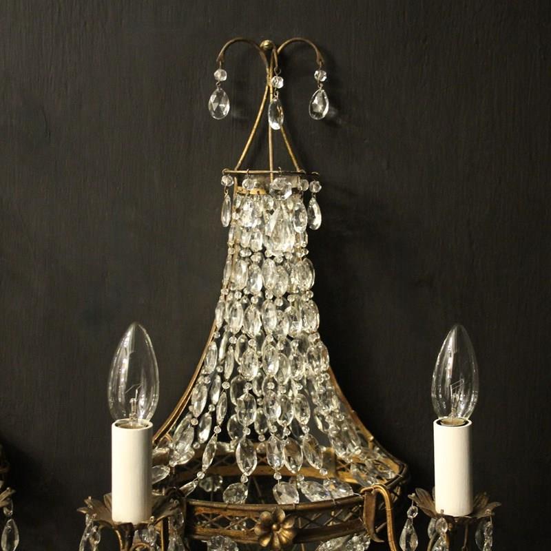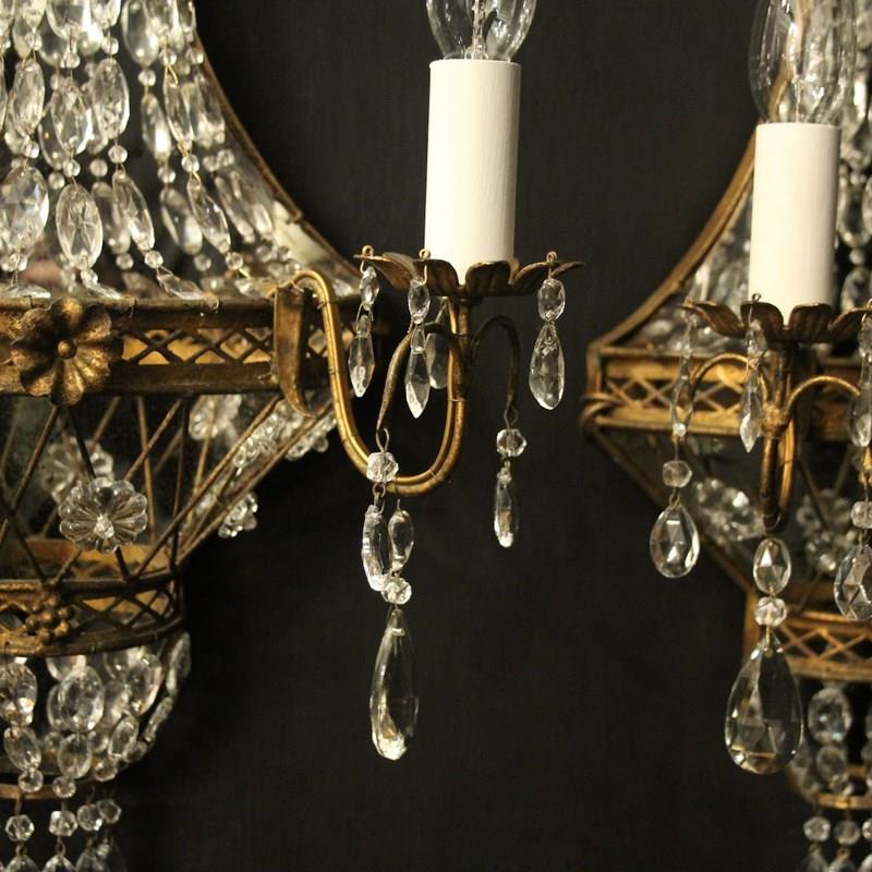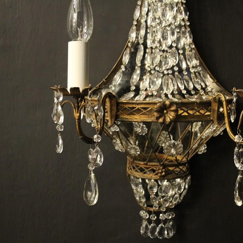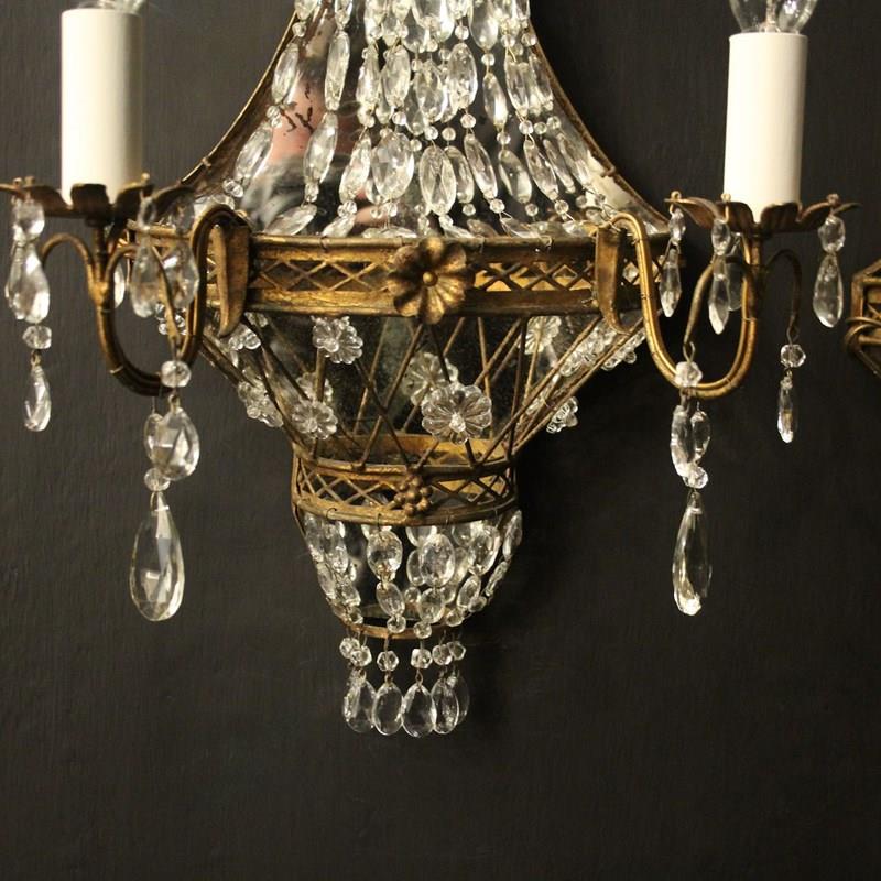 A pretty French pair of gilded toleware and crystal twin arm girandole wall lights, the metal scrolling arms with leaf bobeche drip pans, issuing from a lattice work pierced band with floral centre and mirrored backplate with wirework canopy, decorated overall with swaged crystal faceted pendants, nice original gilded patination with original mirrors- small crack in one mirror. Fully rewired and PAT tested. All our wall lights come with aged brass screws for fixing and spare bulbs.