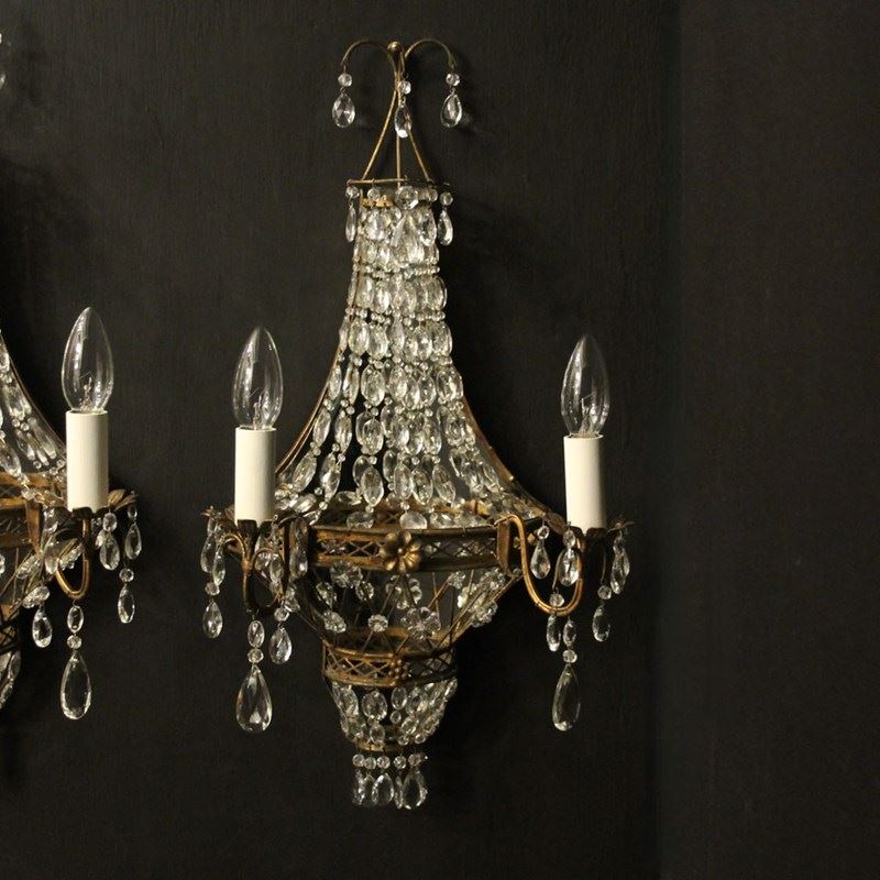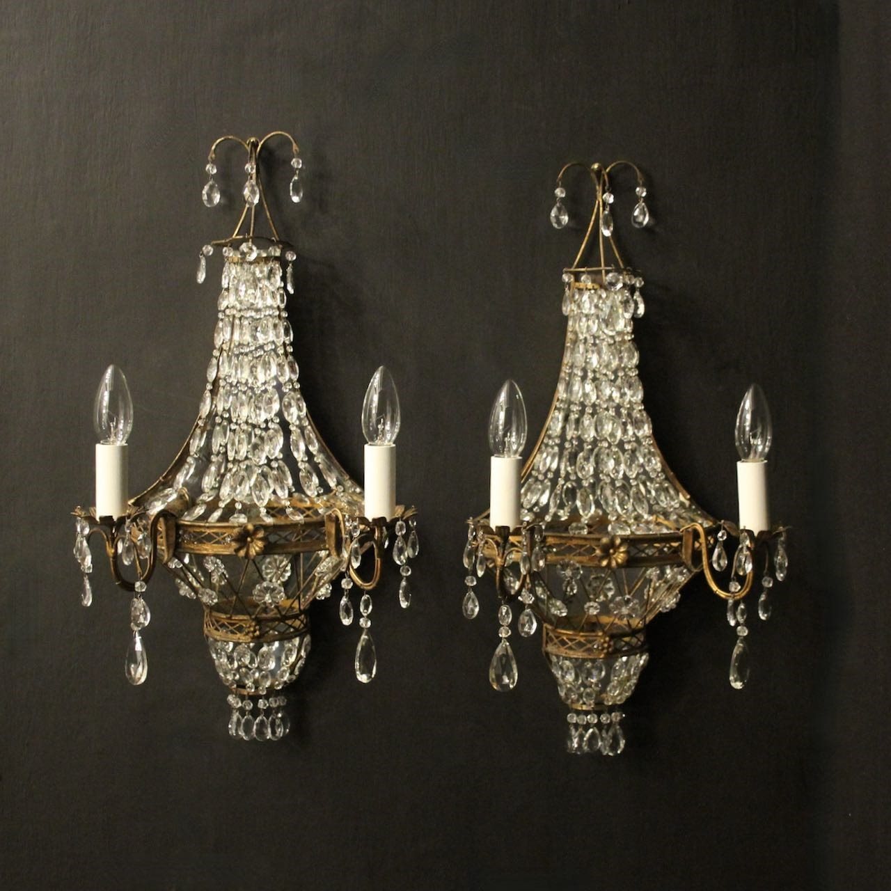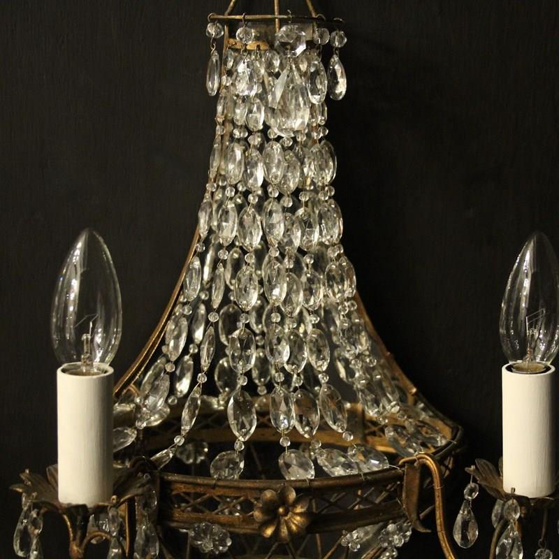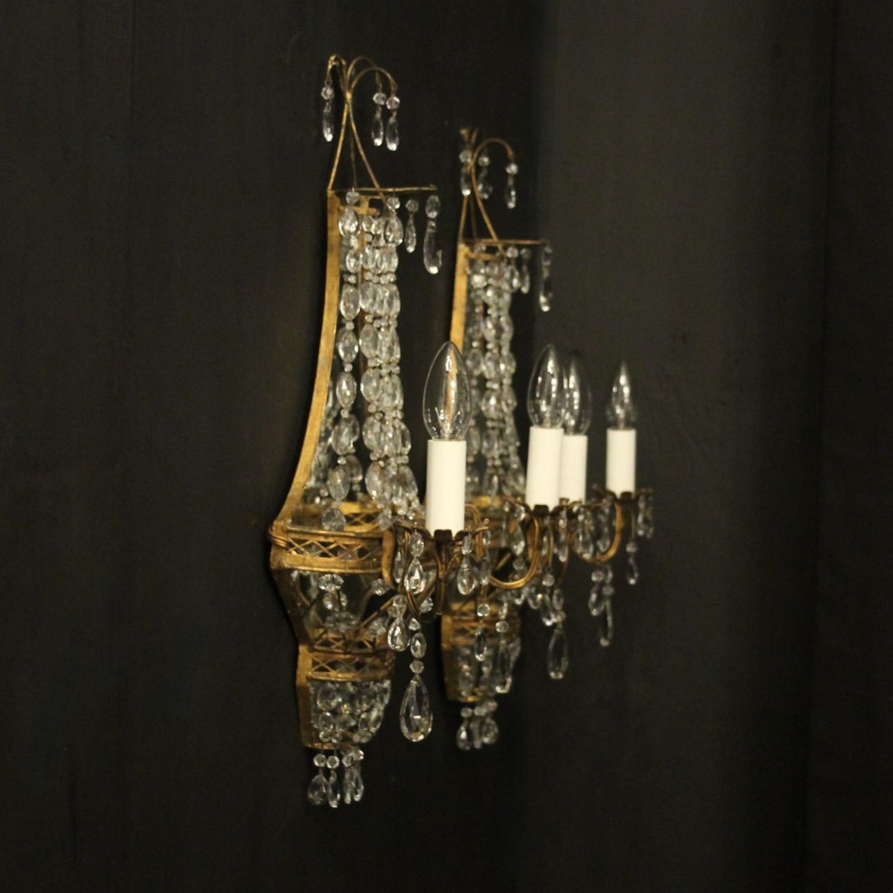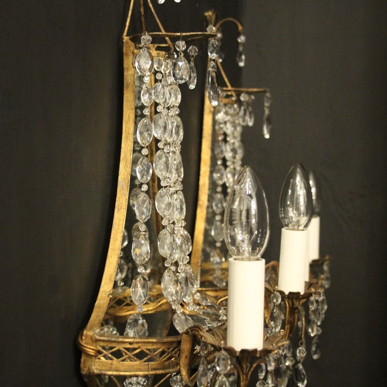 A pretty French pair of gilded toleware and crystal twin arm girandole wall lights, the metal scrolling arms with leaf bobeche drip pans, issuing from a lattice work pierced band with floral centre and mirrored backplate with wirework canopy, decorated overall with swaged crystal faceted pendants, nice original gilded patination with original mirrors- small crack in one mirror. Fully rewired and PAT tested. All our wall lights come with aged brass screws for fixing and spare bulbs.