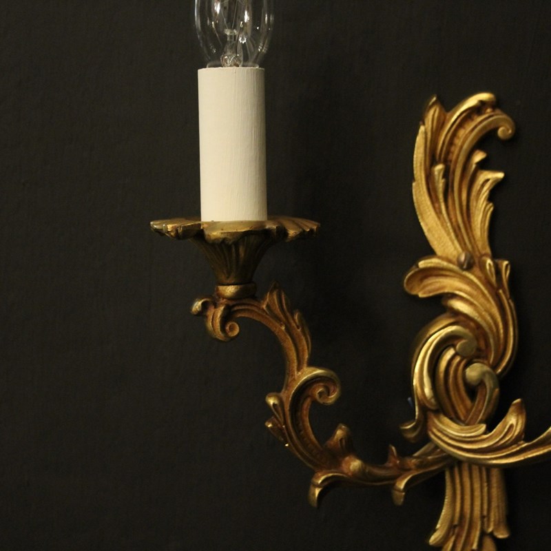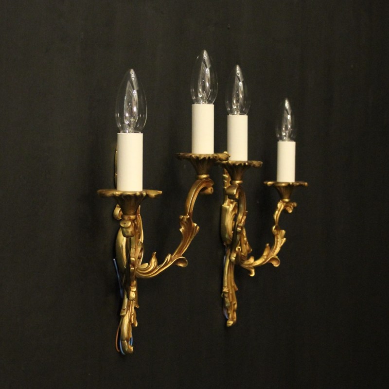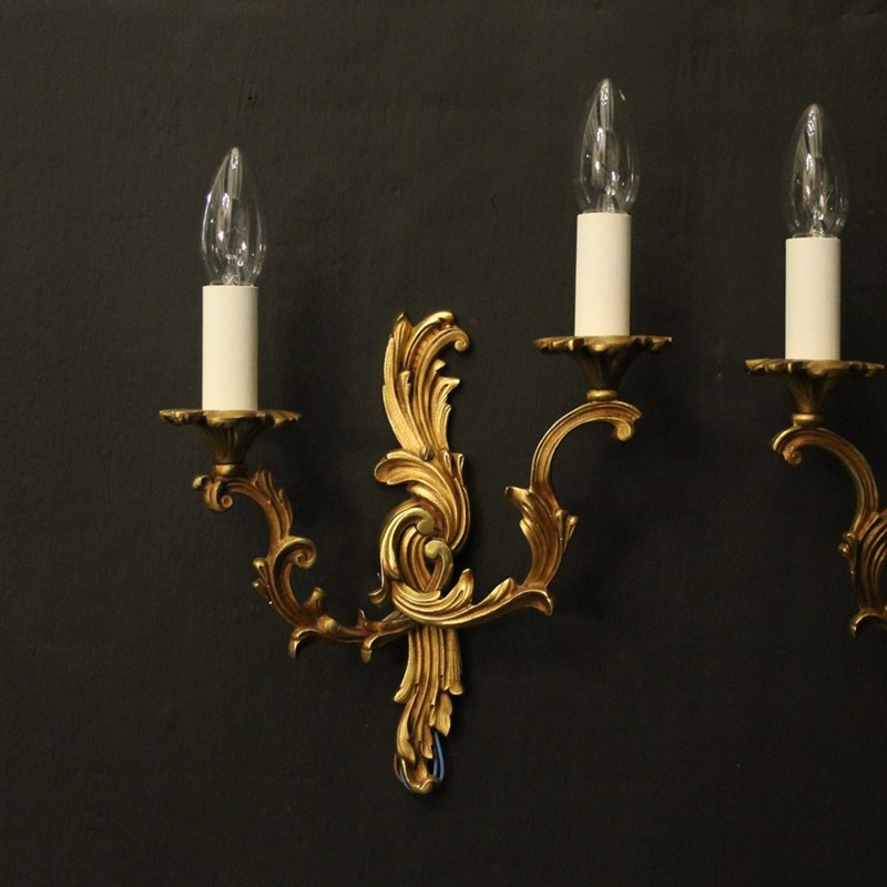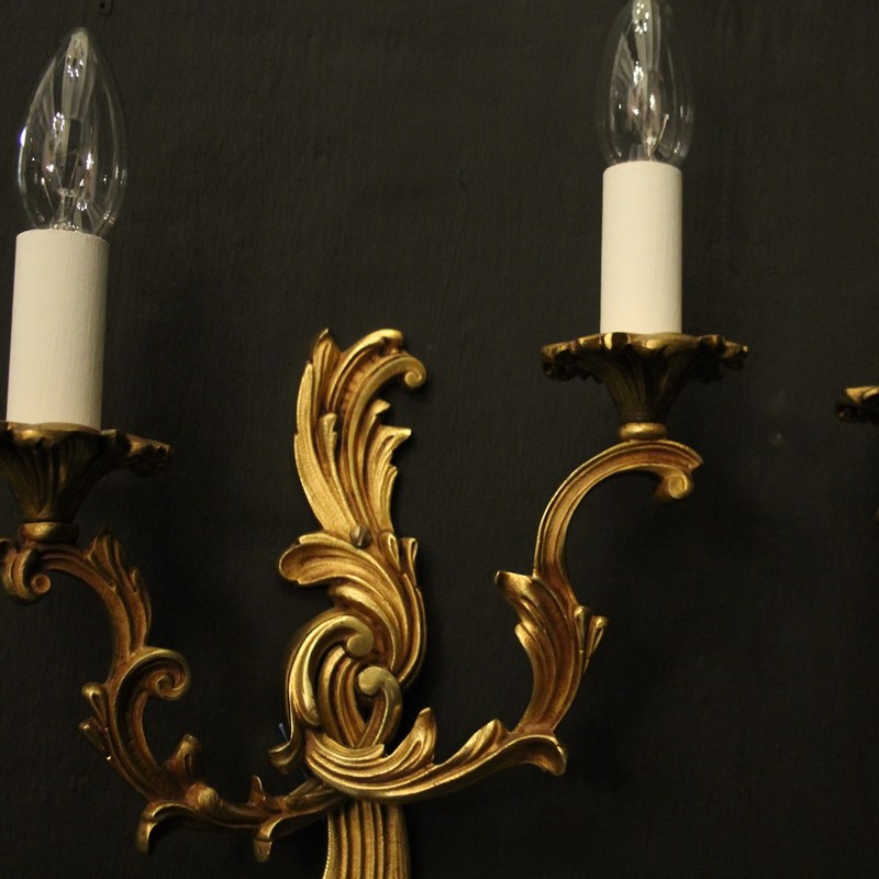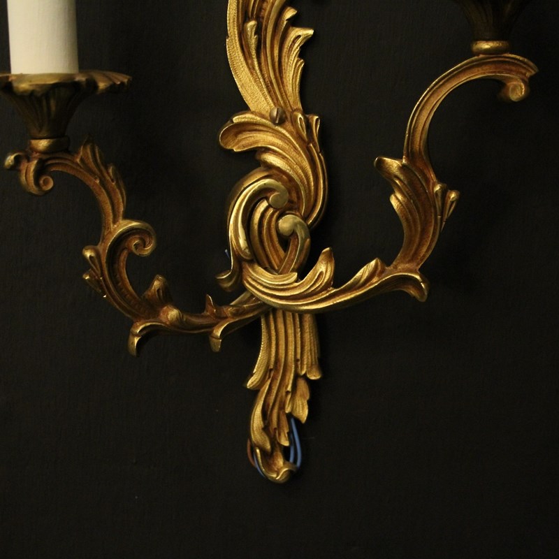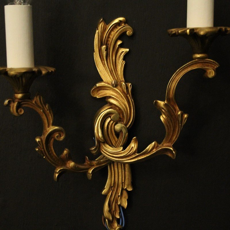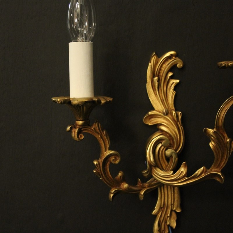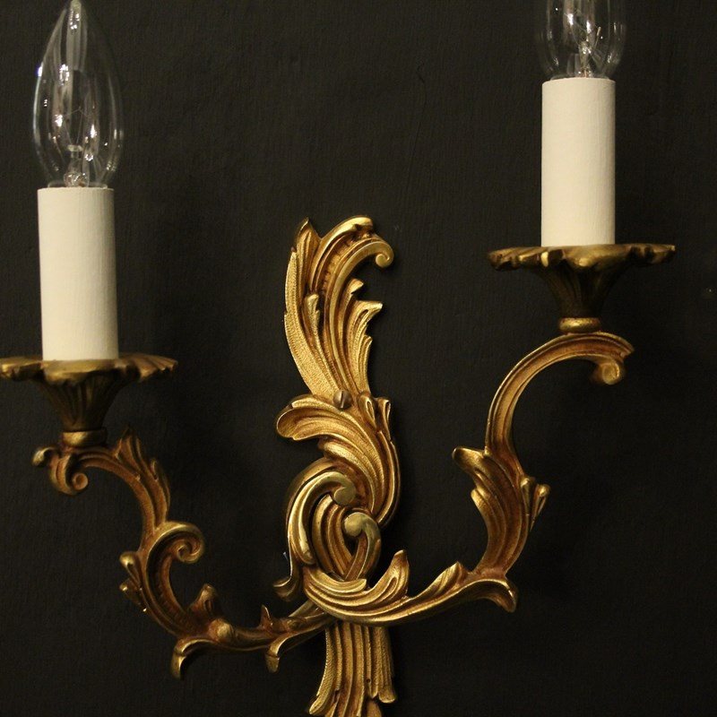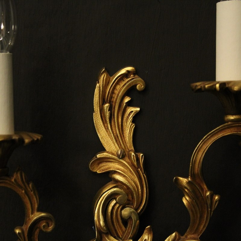 A French pair of gilded brass twin arm antique wall lights, the leaf clad scrolling arms with leaf bobeche drip pans, issuing from an opposing leaf backplate, nice original gilded patination. Fully rewired and PAT tested. All our wall lights come with aged brass screws for fixing and spare bulbs.