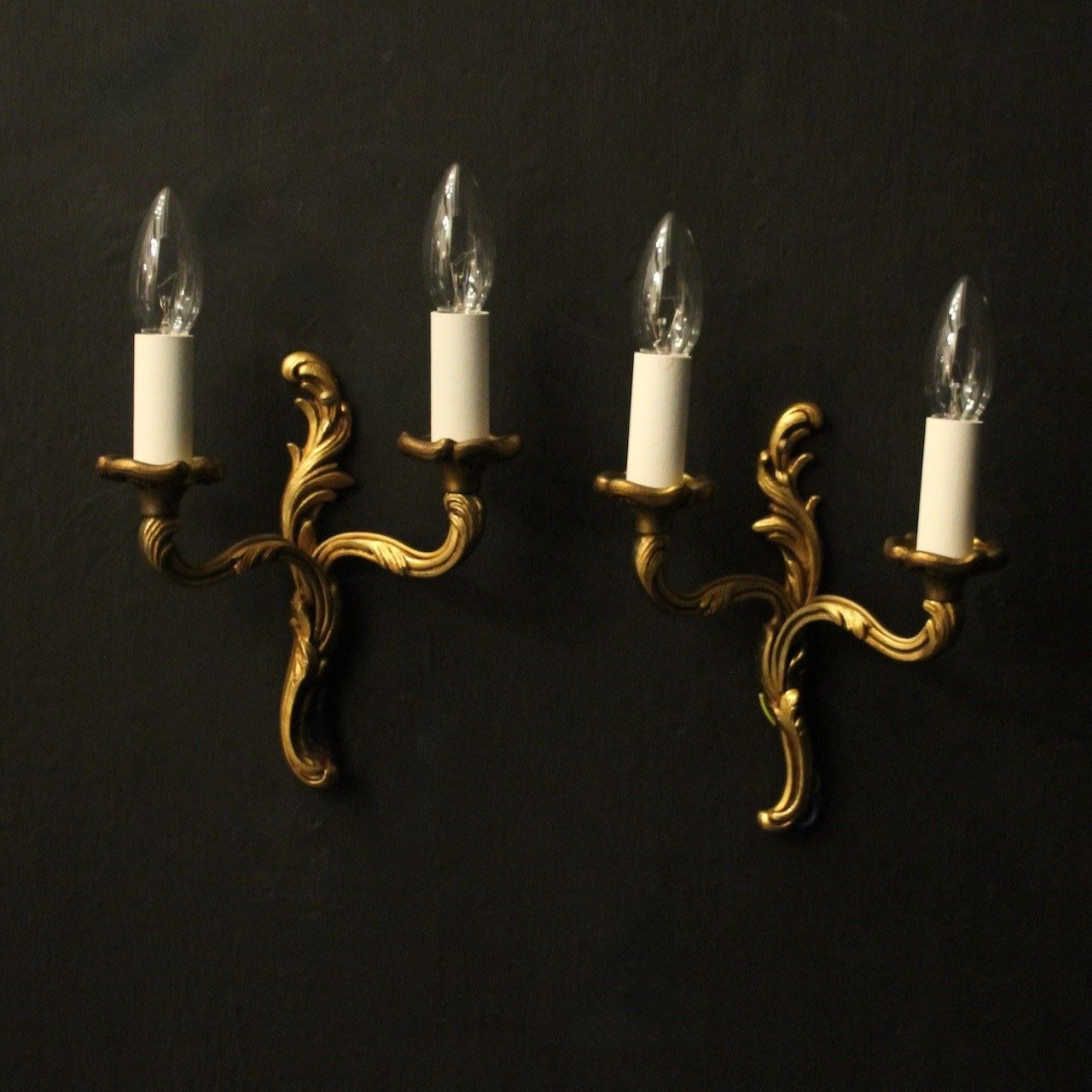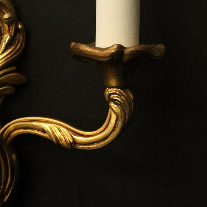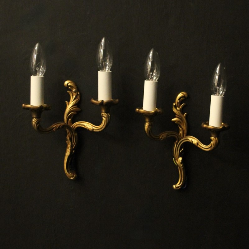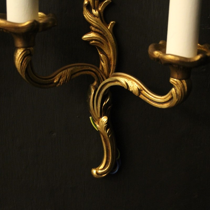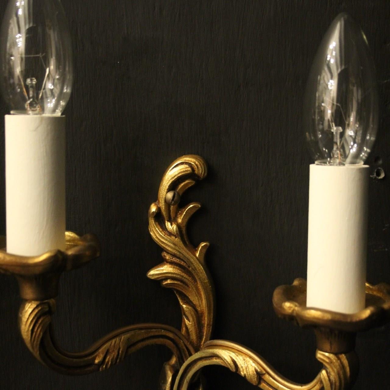 A French small pair of gilded brass twin arm opposing antique wall lights by Lucian Gau, the leaf clad scrolling arms with leaf bobeche drip pans, issuing from an opposing leaf backplate. Fully rewired and PAT tested. All our wall lights come with aged brass screws or brackets for fixing and spare bulbs. Matching a set of 4 we have OKA05111