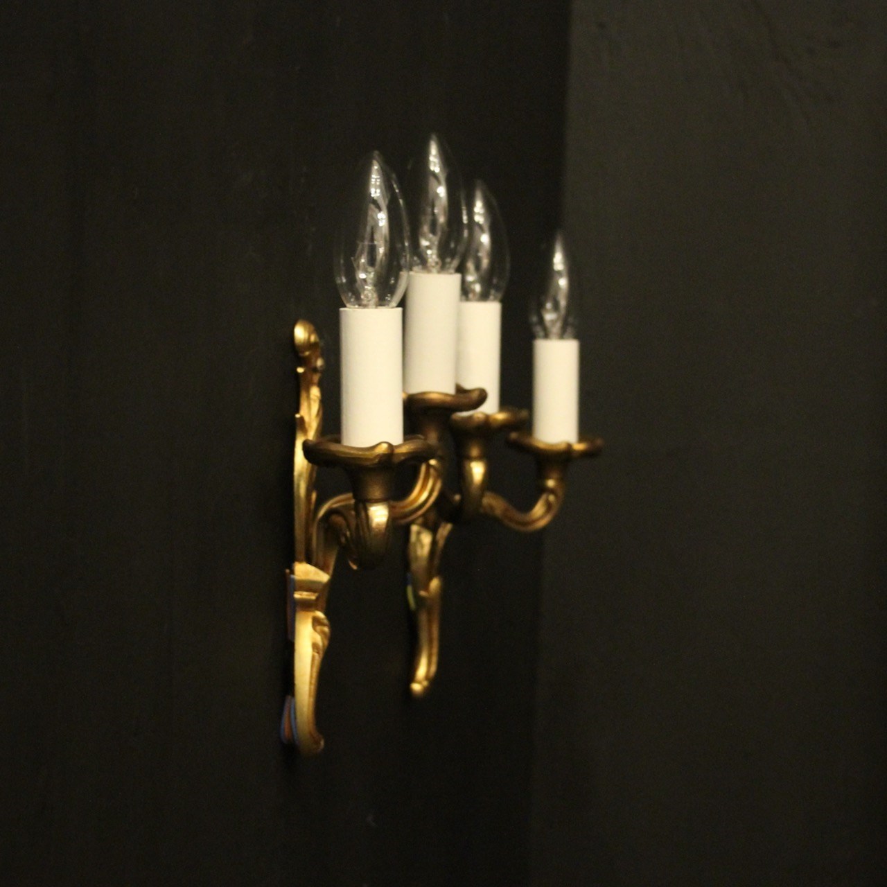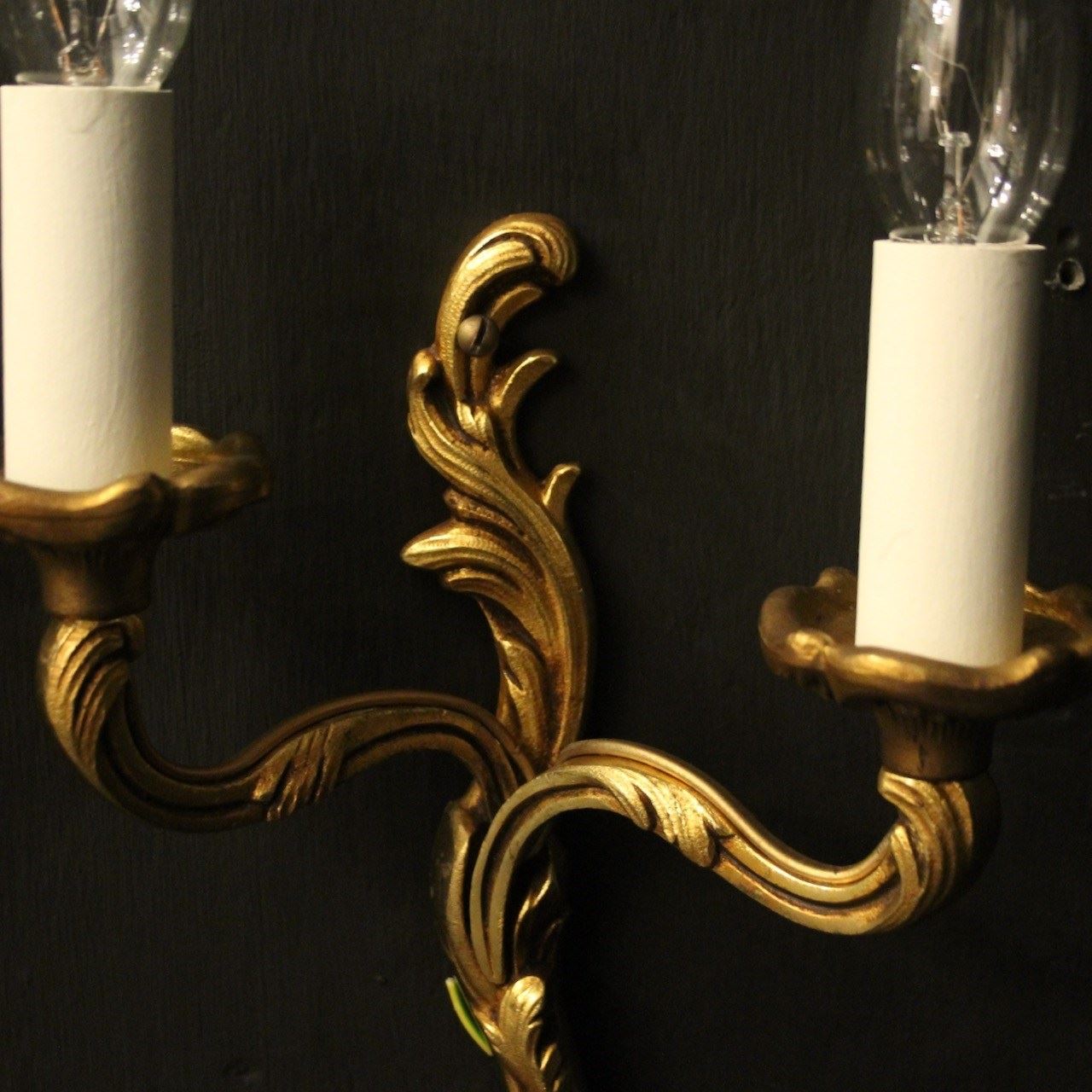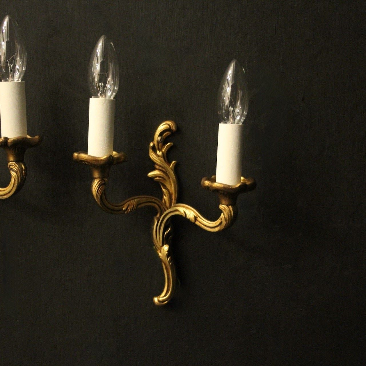 A French small pair of gilded brass twin arm opposing antique wall lights by Lucian Gau, the leaf clad scrolling arms with leaf bobeche drip pans, issuing from an opposing leaf backplate. Fully rewired and PAT tested. All our wall lights come with aged brass screws or brackets for fixing and spare bulbs. Matching a set of 4 we have OKA05111