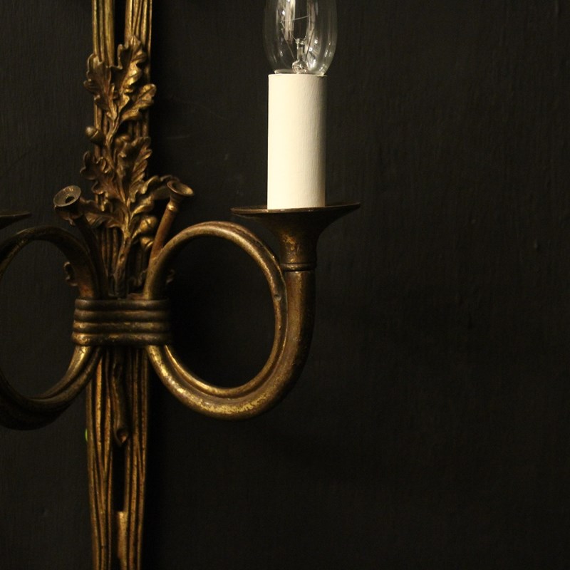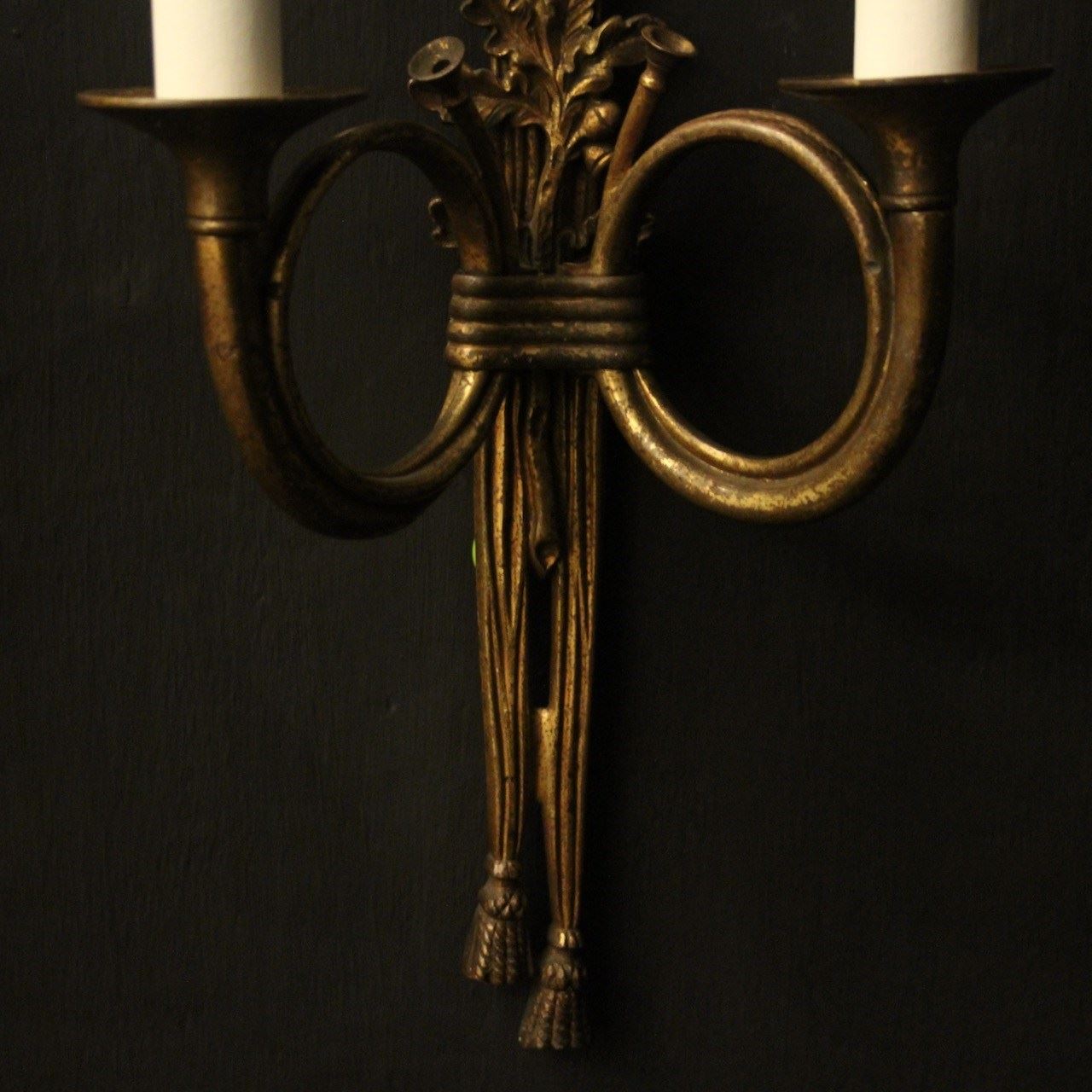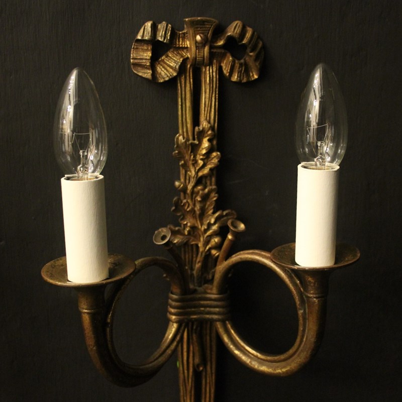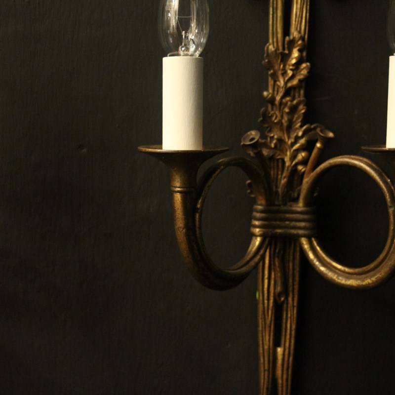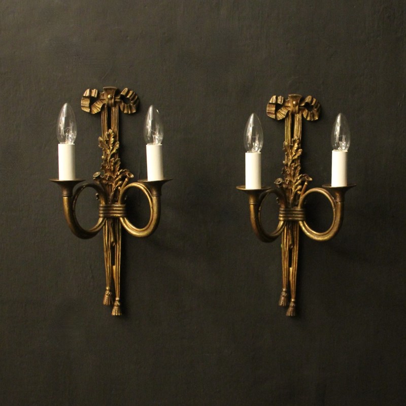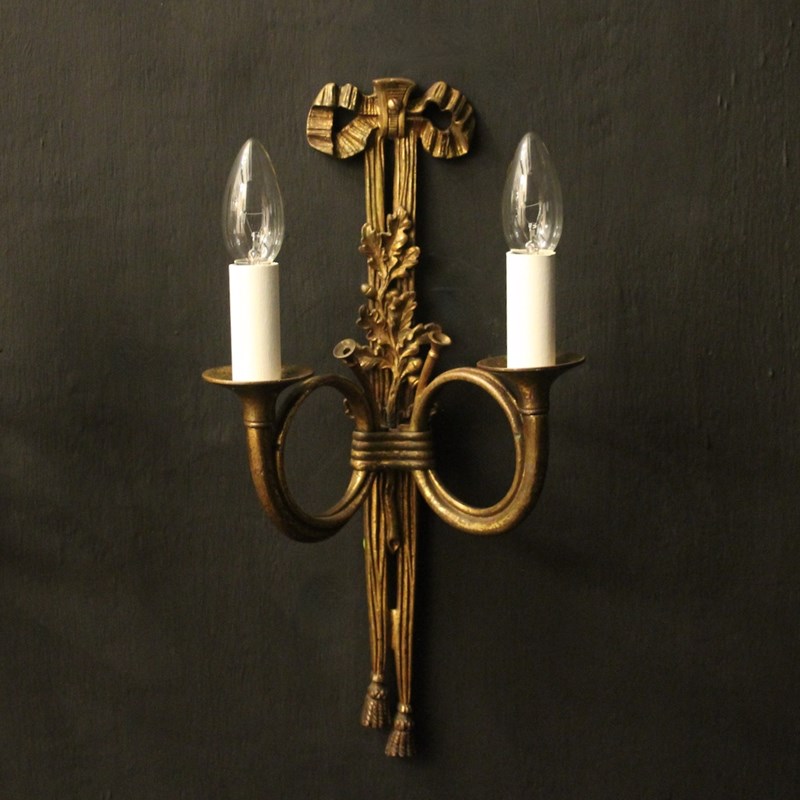 A French pair of 'Maison Baguès' bronze Hunting twin arm antique wall lights, the two scrolling French horns with trumpet bobeche drip pans issuing from a ribbon and tassel backplate, topped with a pierced ribbon finial, lovely original patination from a well know French lighting designer. Fully rewired and PAT tested. All our wall lights come with aged brass screws for fixing and spare bulbs.