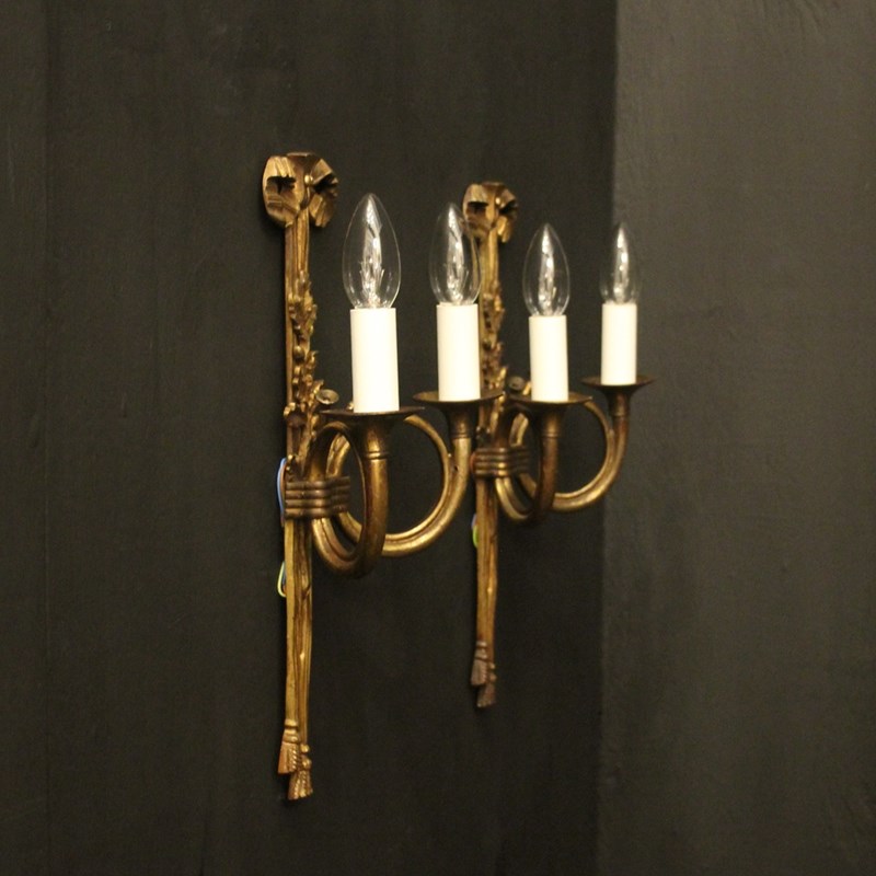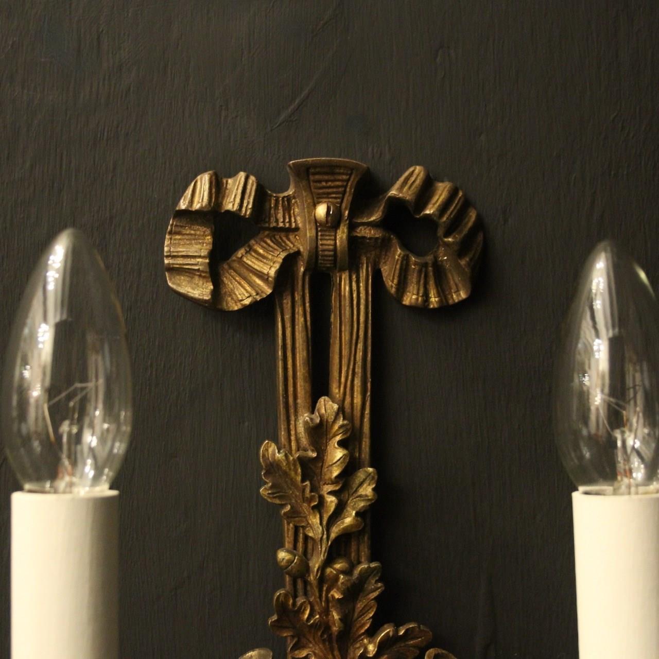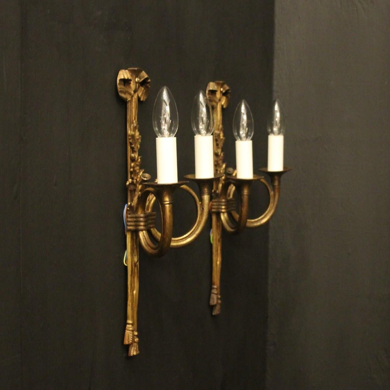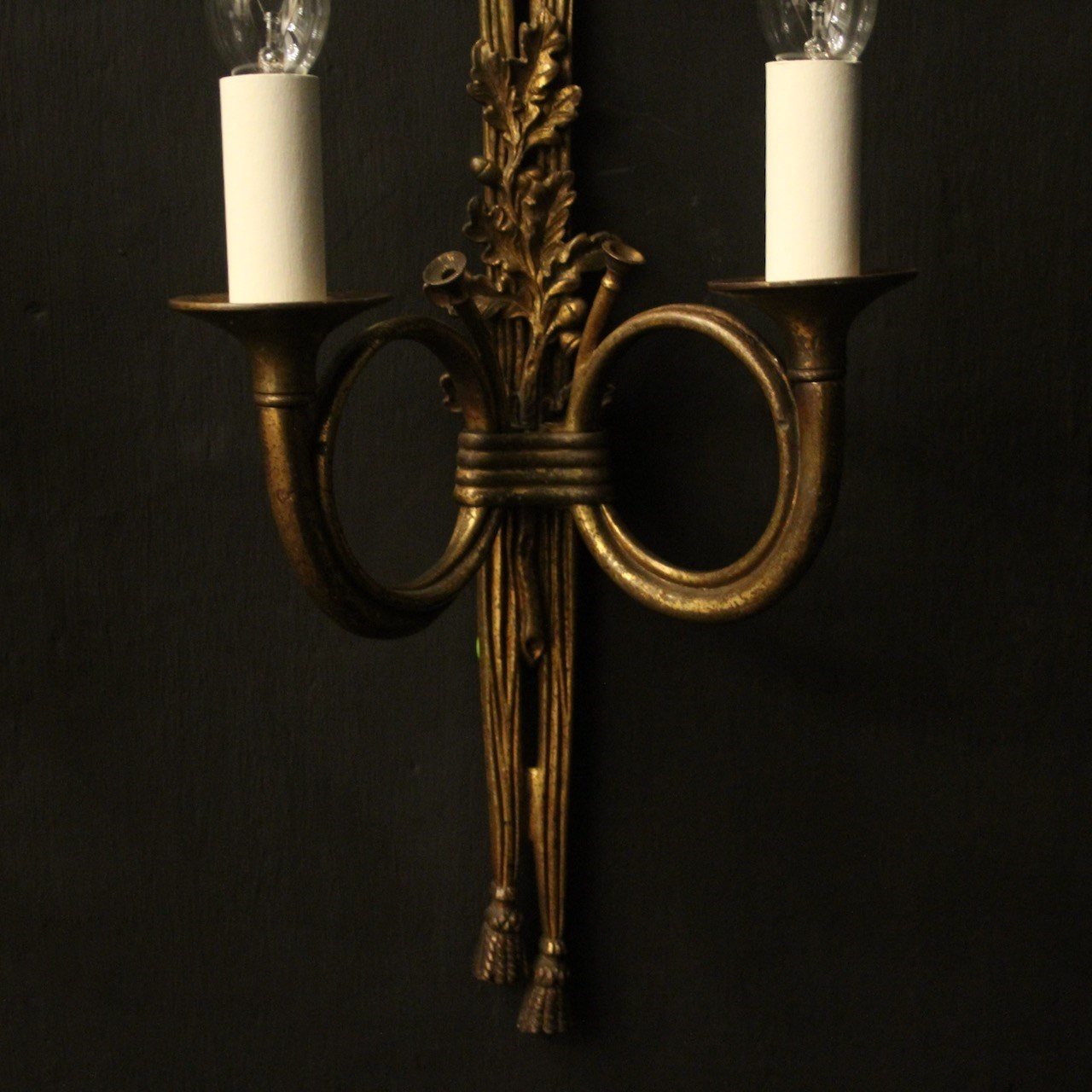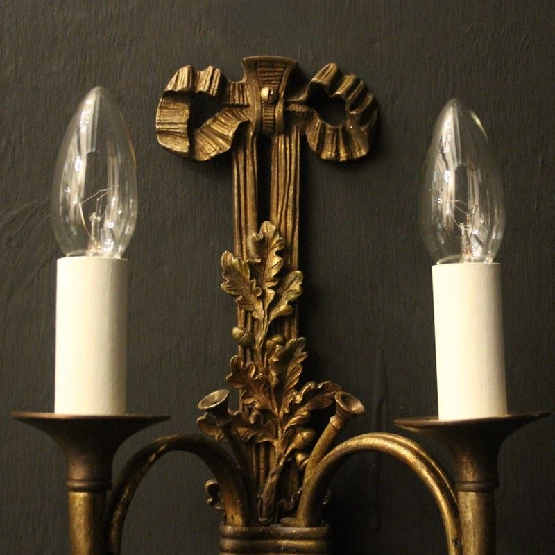 A French pair of 'Maison Baguès' bronze Hunting twin arm antique wall lights, the two scrolling French horns with trumpet bobeche drip pans issuing from a ribbon and tassel backplate, topped with a pierced ribbon finial, lovely original patination from a well know French lighting designer. Fully rewired and PAT tested. All our wall lights come with aged brass screws for fixing and spare bulbs.