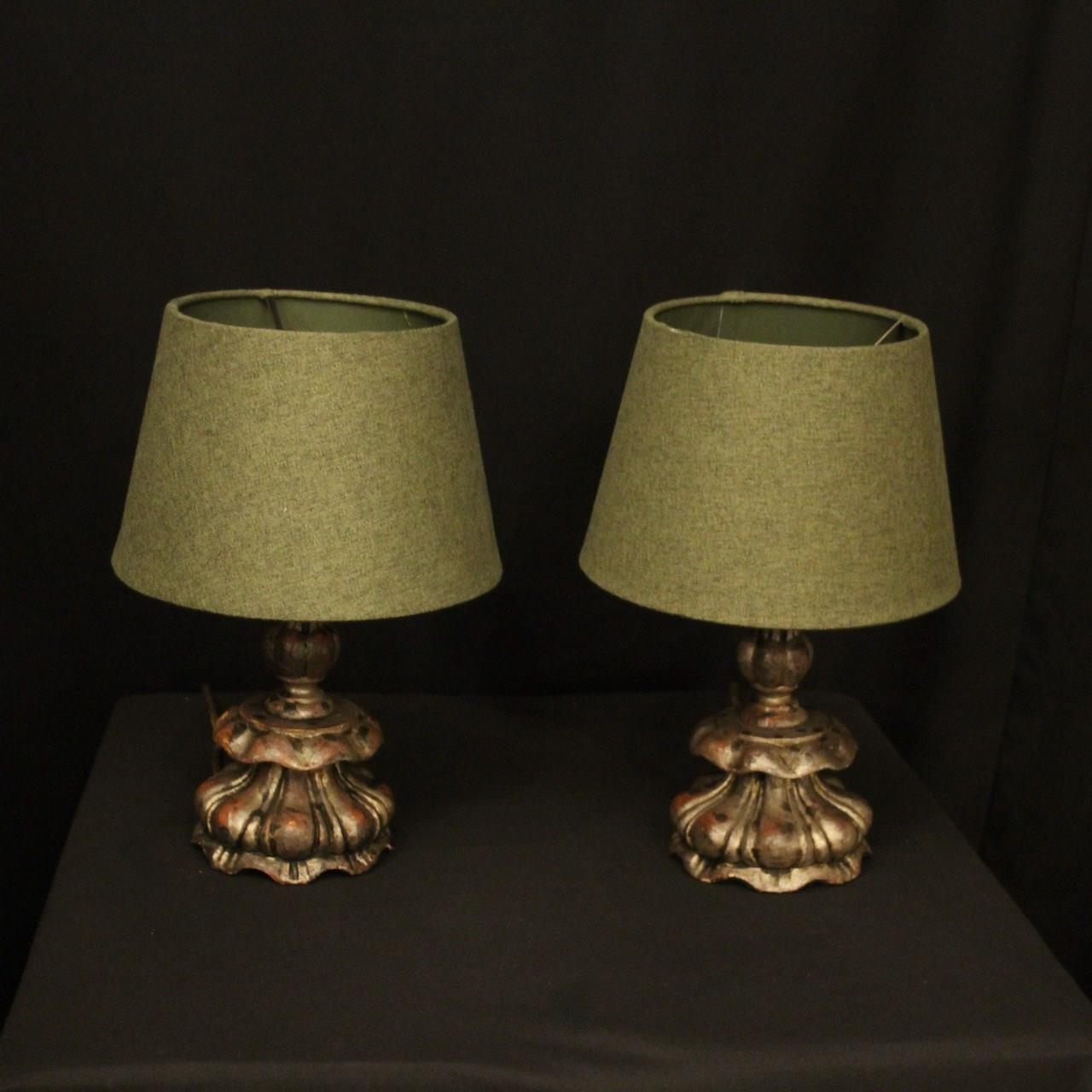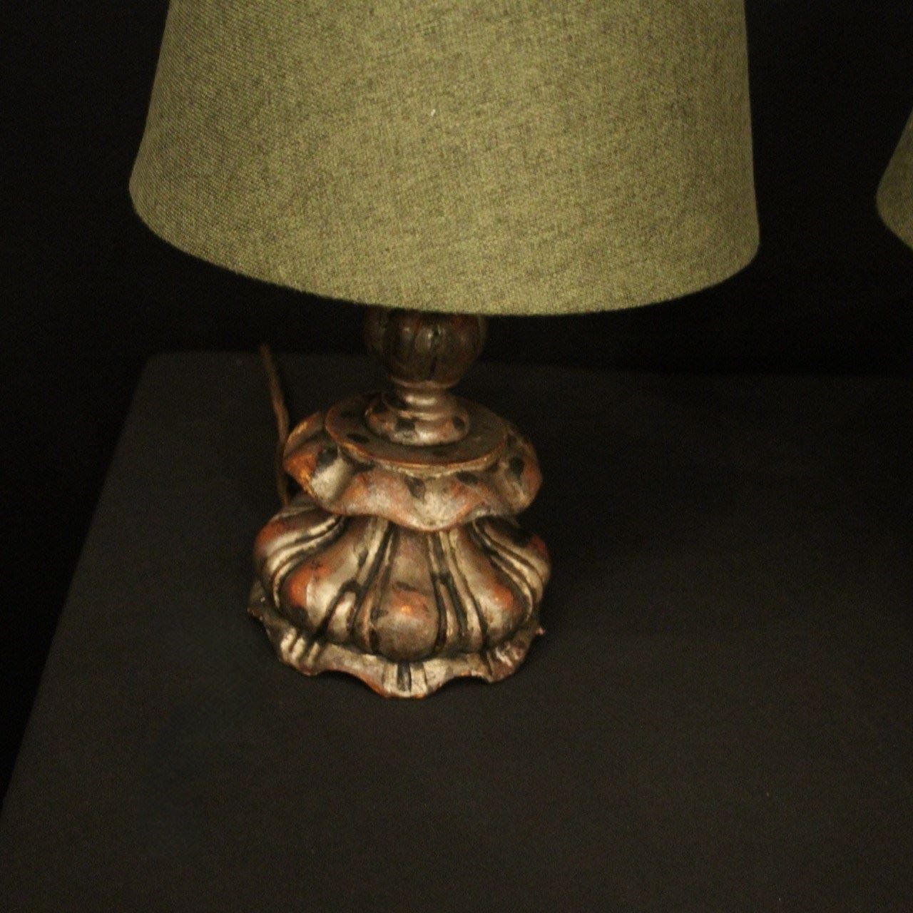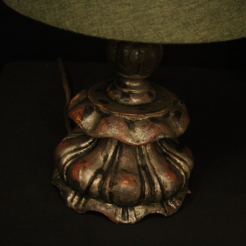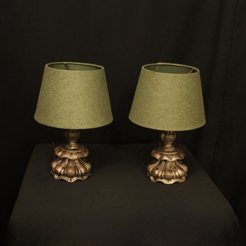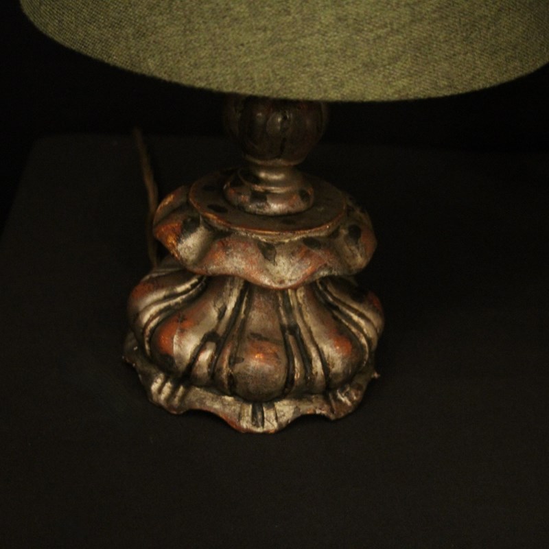 A French pair of silver giltwood single light table lamps, the bulbous reeded centre with circular scalloped reeded base. Nice original patination. Fully rewired and PAT tested. Comes with Green linen shades.