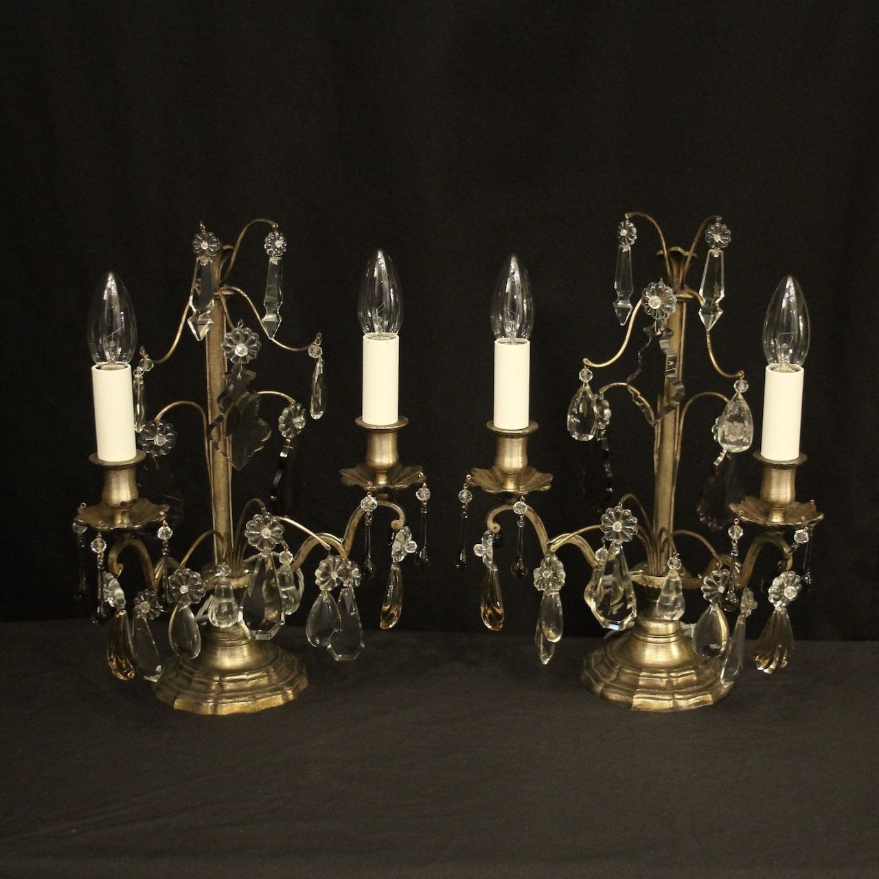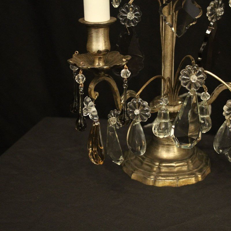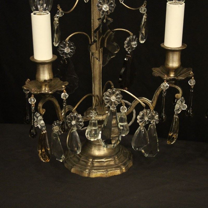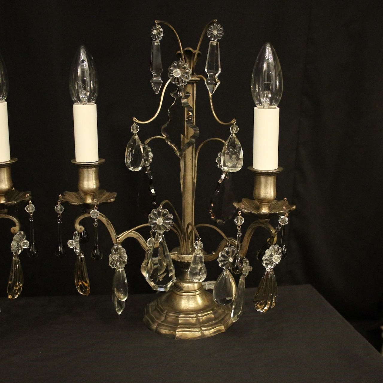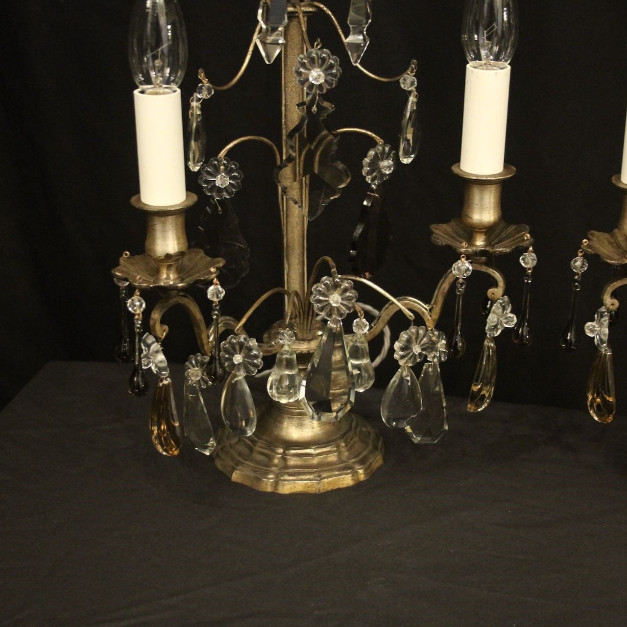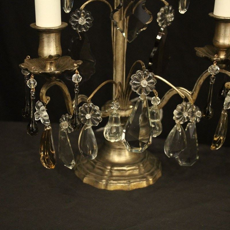 A pretty pair of French silvered brass twin light candelabra, the square gauge scrolling arms with floral bobeche drip pans and bulbous candle sconces, issuing from a central column with wirework canopy and decorated overall with faceted clear, smoked and Amethyst crystal pendants, lovely original patination. Fully rewired and PAT tested. All our lighting come with spare bulbs.