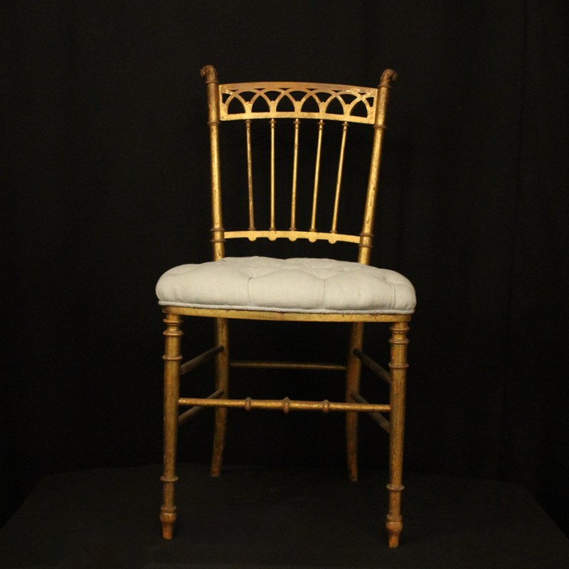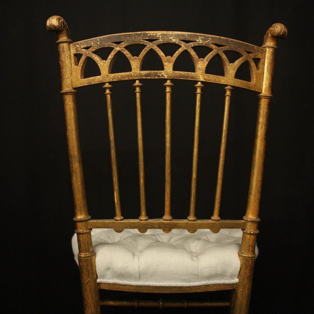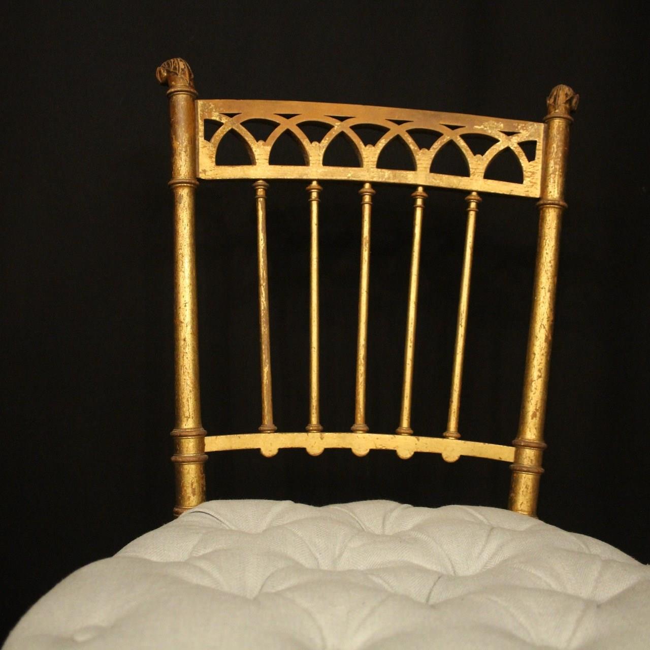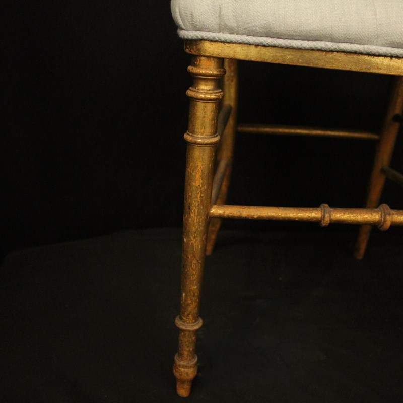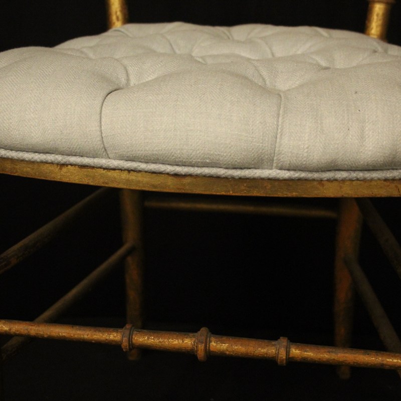 A French pair of giltwood simulated faux bamboo chairs. The spindle backs with pierced top rail and scrolling leaf finals. They would work in a bedroom or as side chairs. Newly recovered in French grey/blue linen.