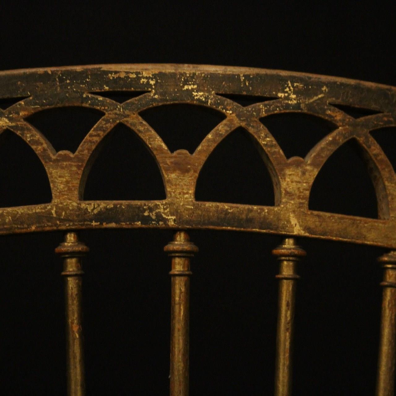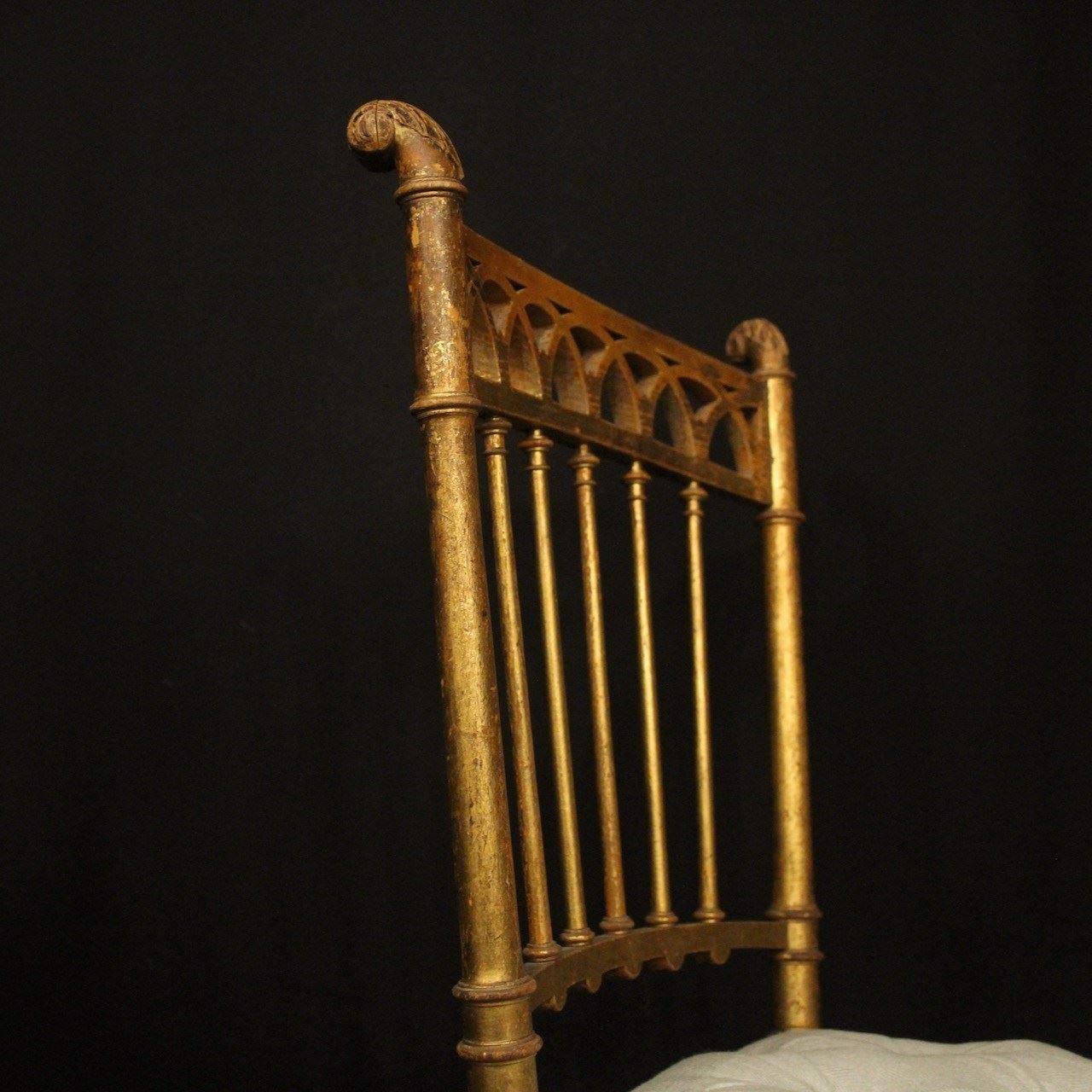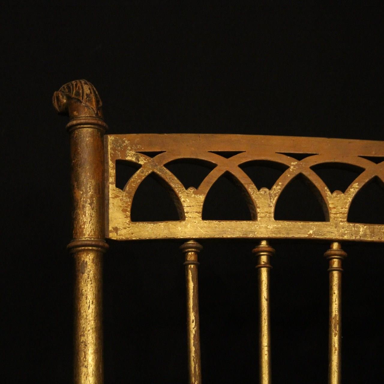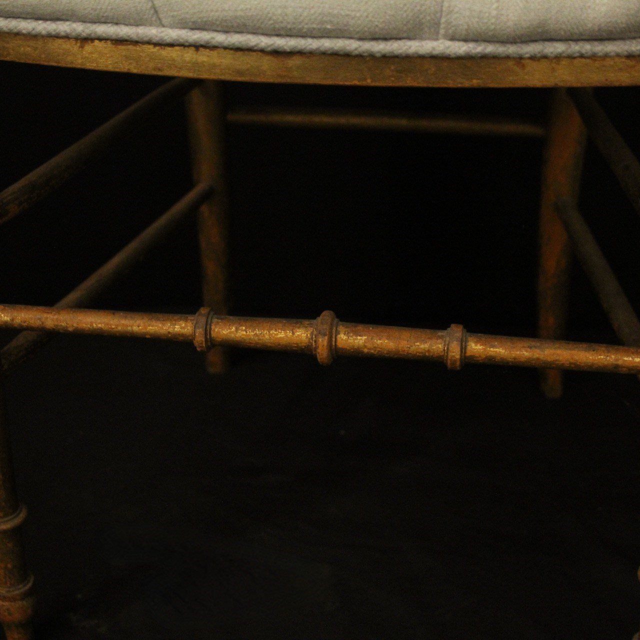 A French pair of giltwood simulated faux bamboo chairs. The spindle backs with pierced top rail and scrolling leaf finals. They would work in a bedroom or as side chairs. Newly recovered in French grey/blue linen.