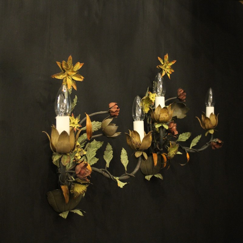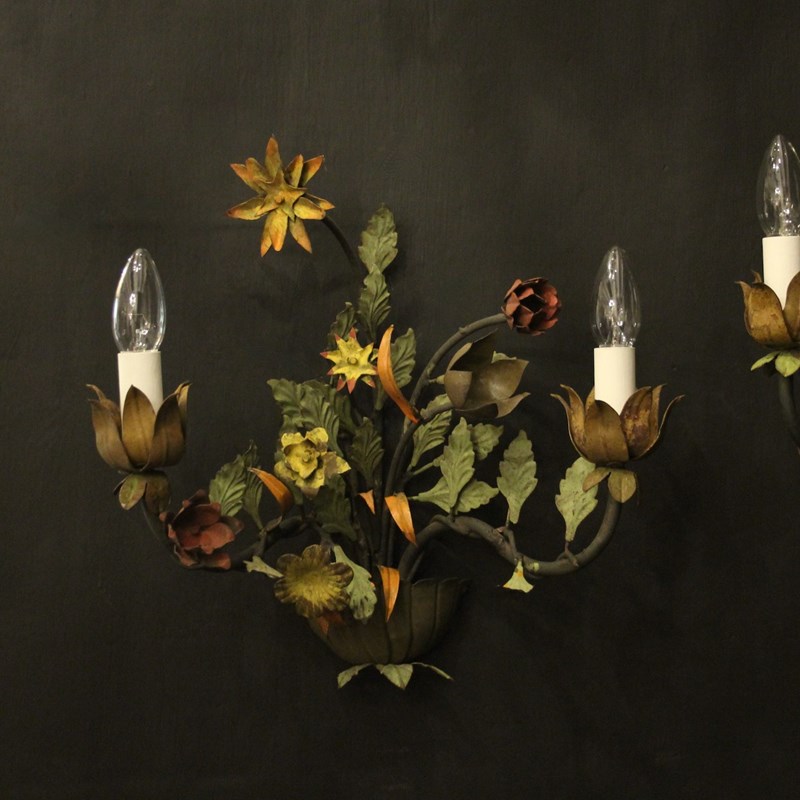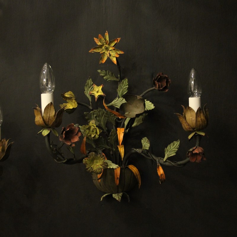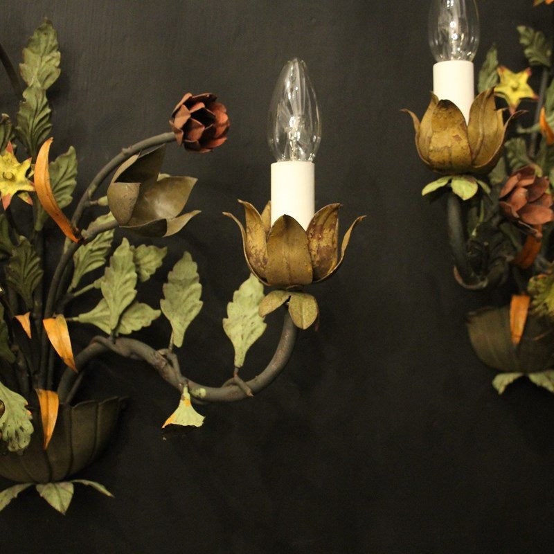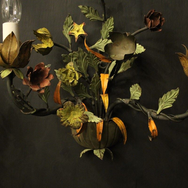 A decorative French pair of twin arm Toleware and polychrome wall lights, the scrolling arms with ornate leaf candle sconces, issuing from an elaborate leaf and flower polychrome coloured backplate, very decorative, great size and lovely original patination. Fully rewired and PAT tested. All our wall lights come with aged brass screws for fixing and spare bulbs.