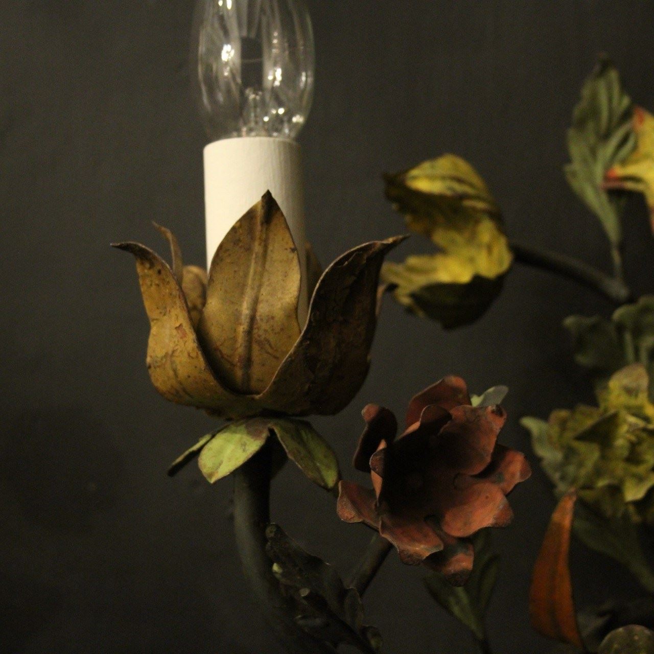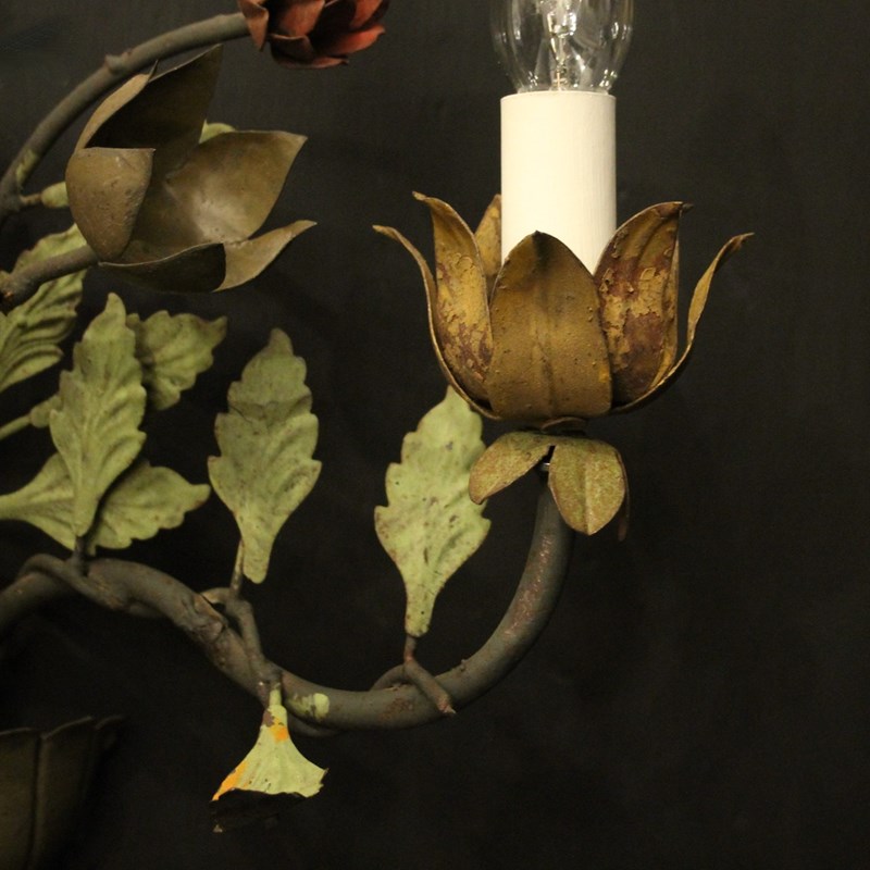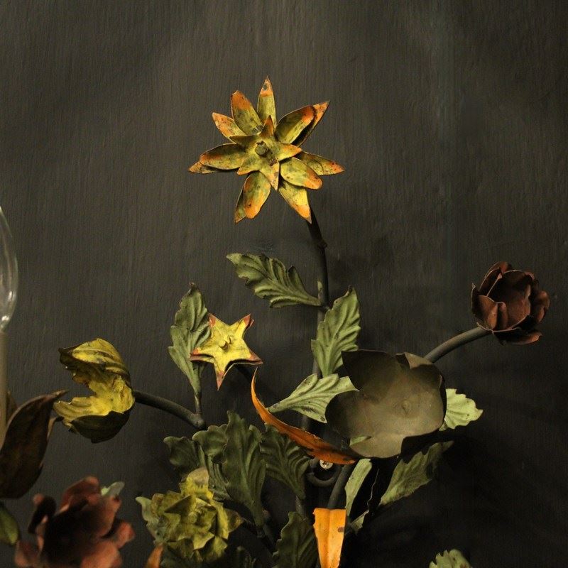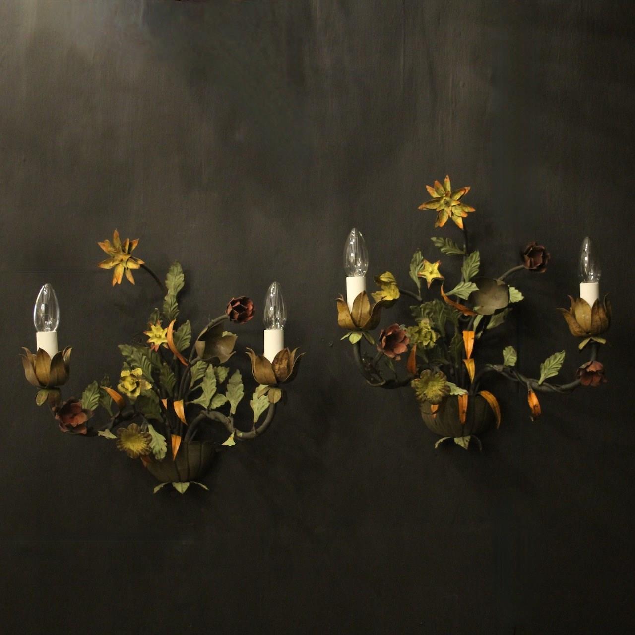 A decorative French pair of twin arm Toleware and polychrome wall lights, the scrolling arms with ornate leaf candle sconces, issuing from an elaborate leaf and flower polychrome coloured backplate, very decorative, great size and lovely original patination. Fully rewired and PAT tested. All our wall lights come with aged brass screws for fixing and spare bulbs.