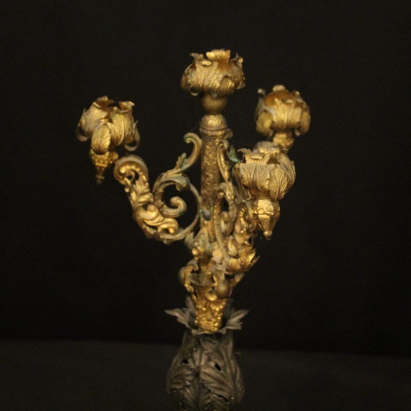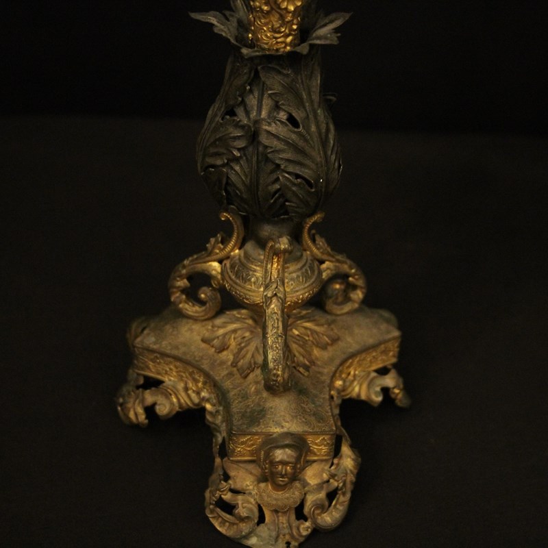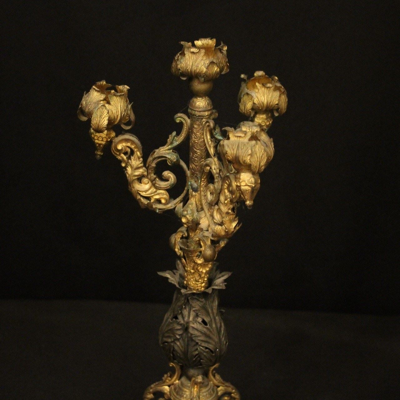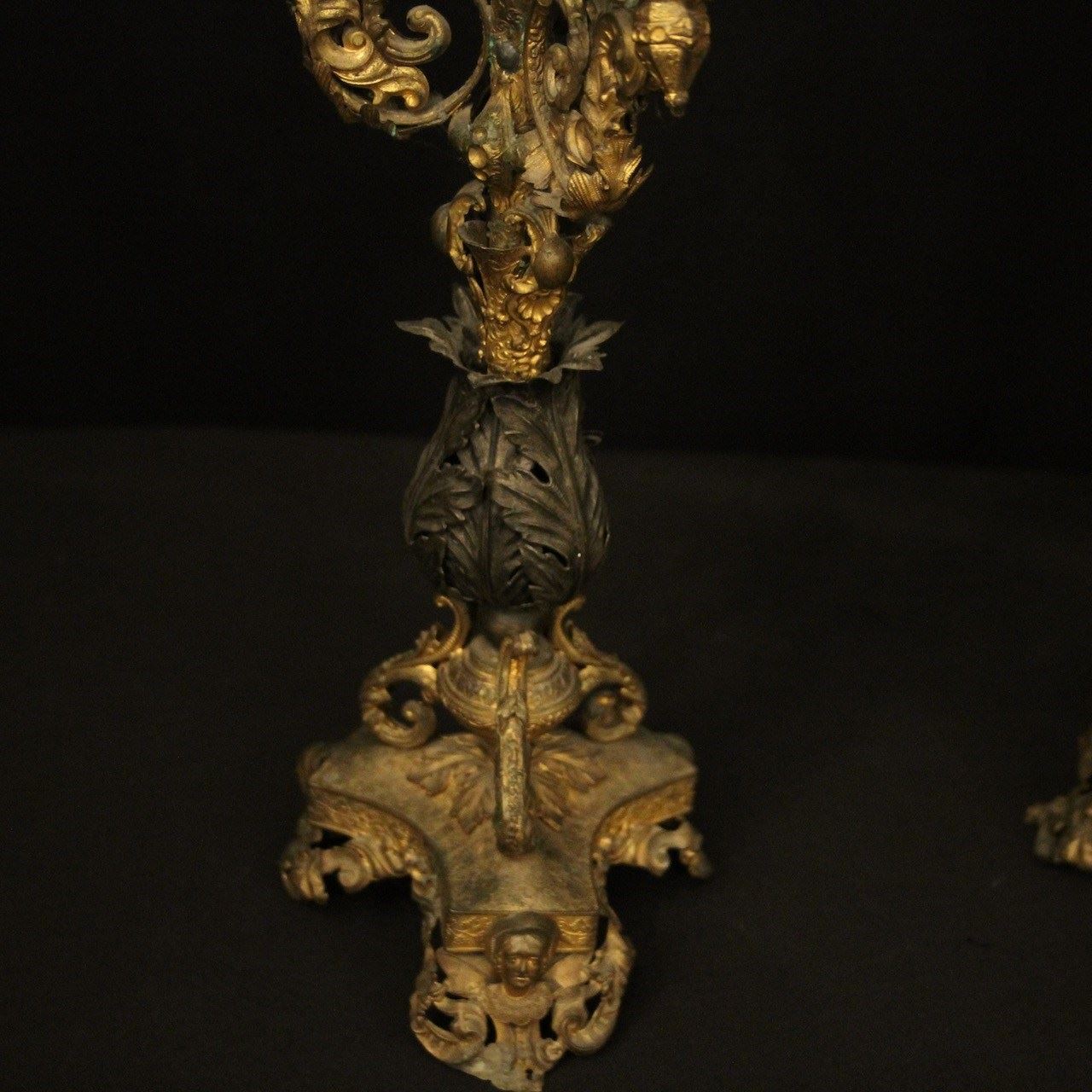 A nice French pair of gilded repousse brass and bronze triple light antique candelabra, the three leaf scrolling arms with leaf bobeche drip pans and candle sconces, issuing from a repousse bronze and brass column with tripart base with ornate heads, nice original gilded patination. For candle use only.