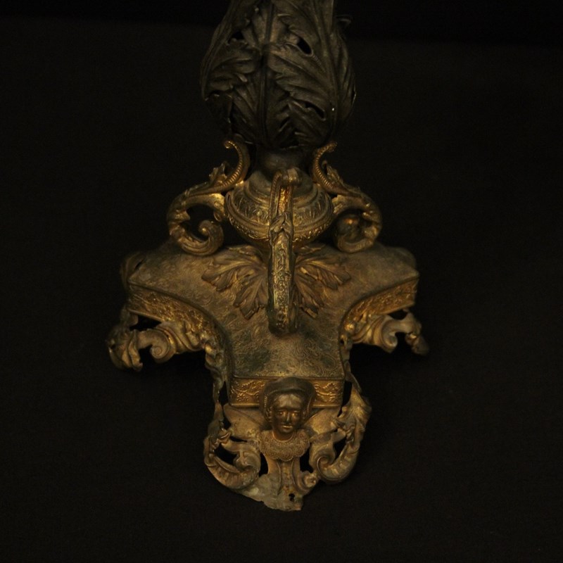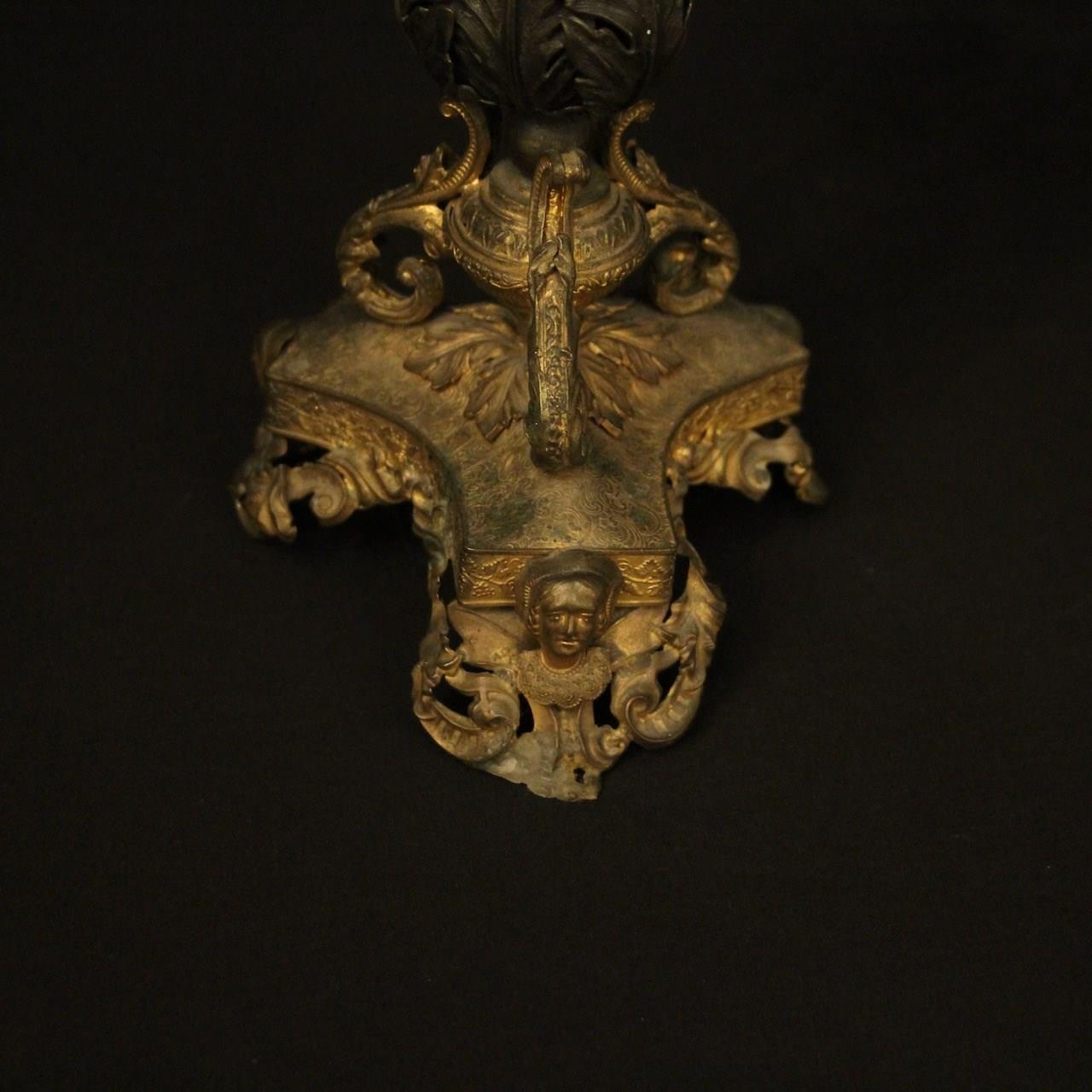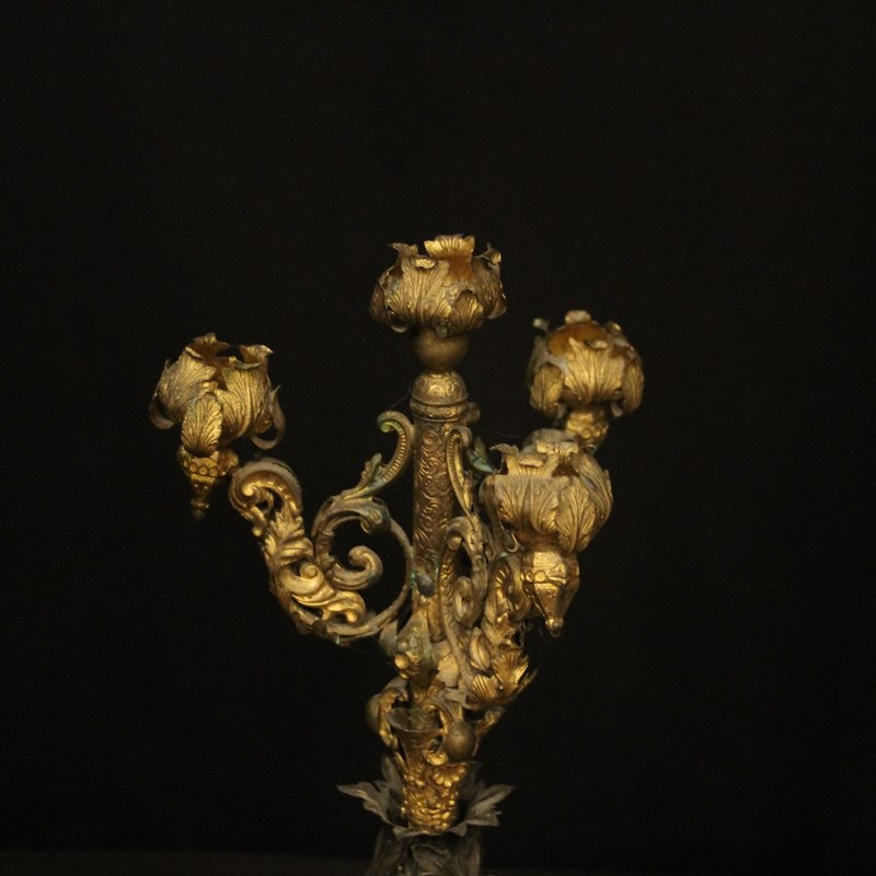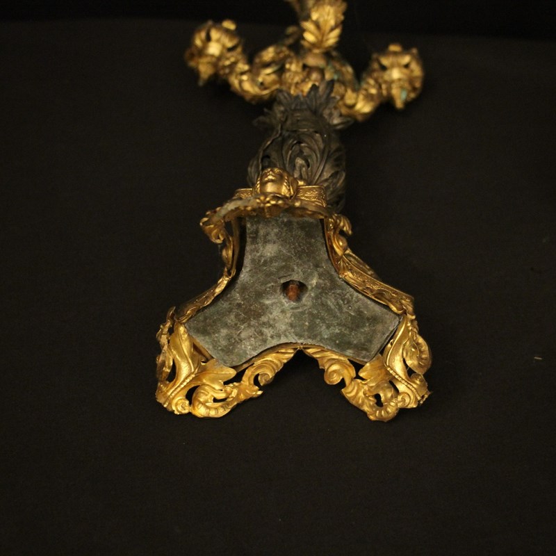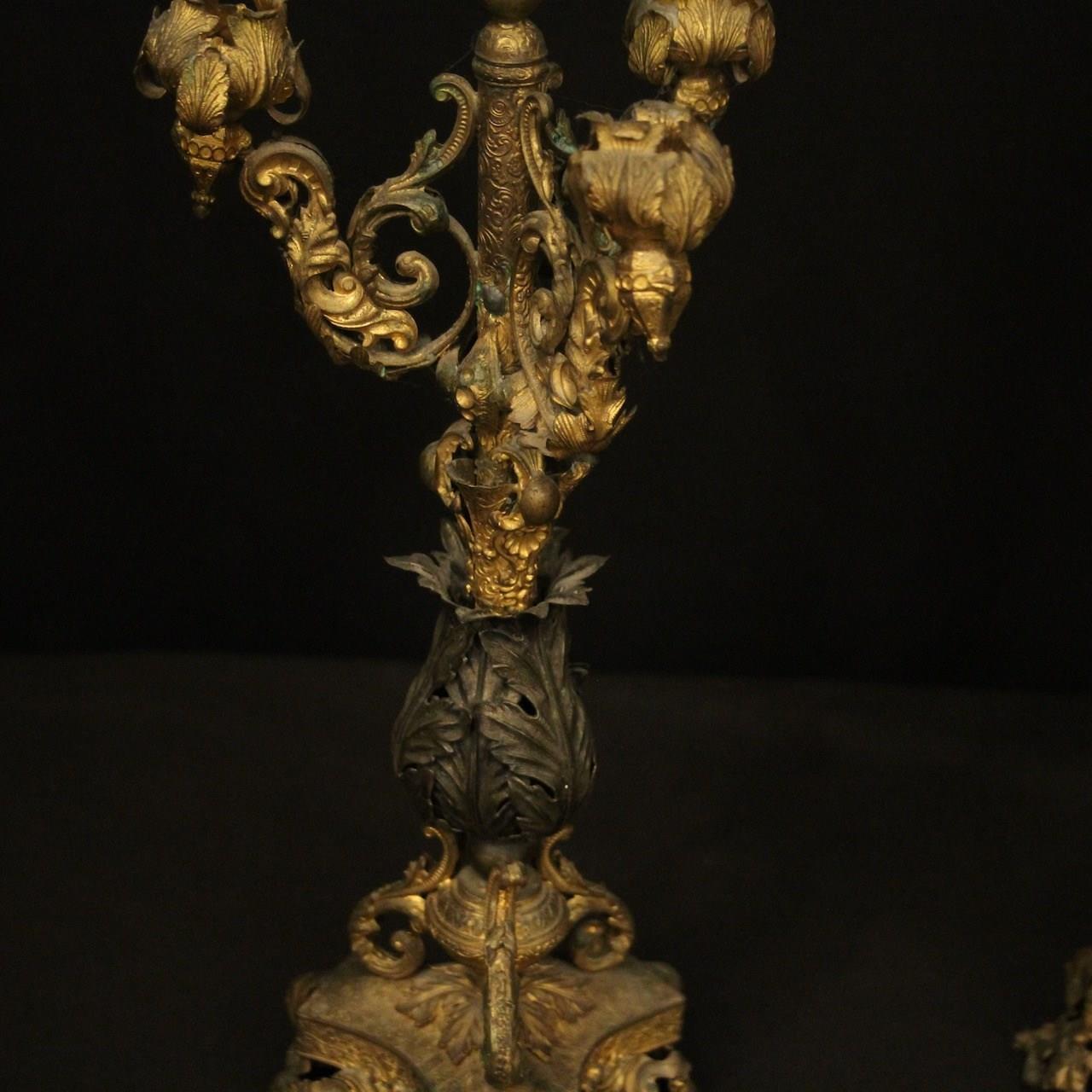 A nice French pair of gilded repousse brass and bronze triple light antique candelabra, the three leaf scrolling arms with leaf bobeche drip pans and candle sconces, issuing from a repousse bronze and brass column with tripart base with ornate heads, nice original gilded patination. For candle use only.