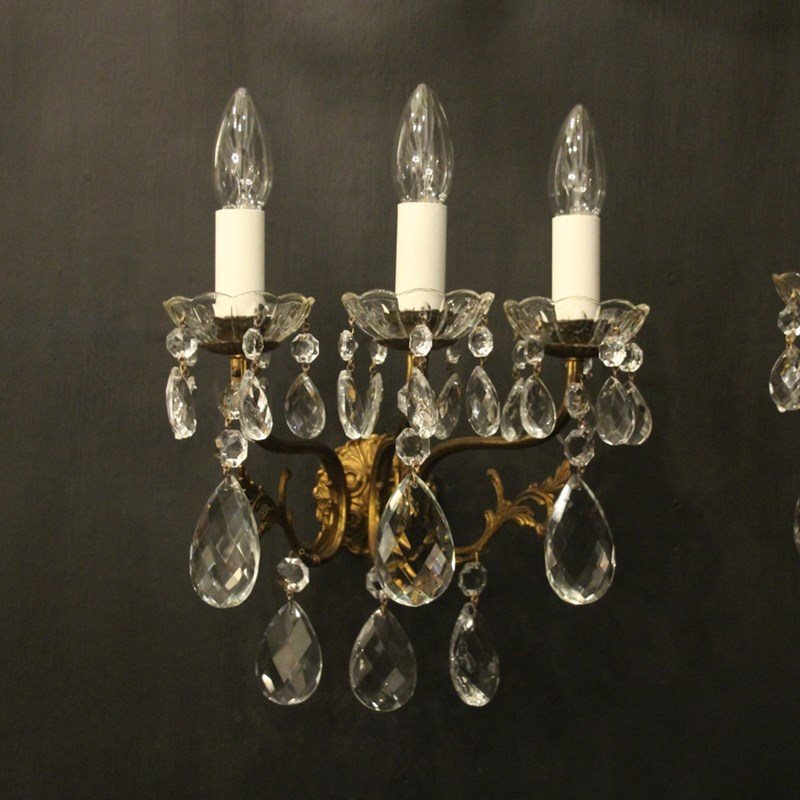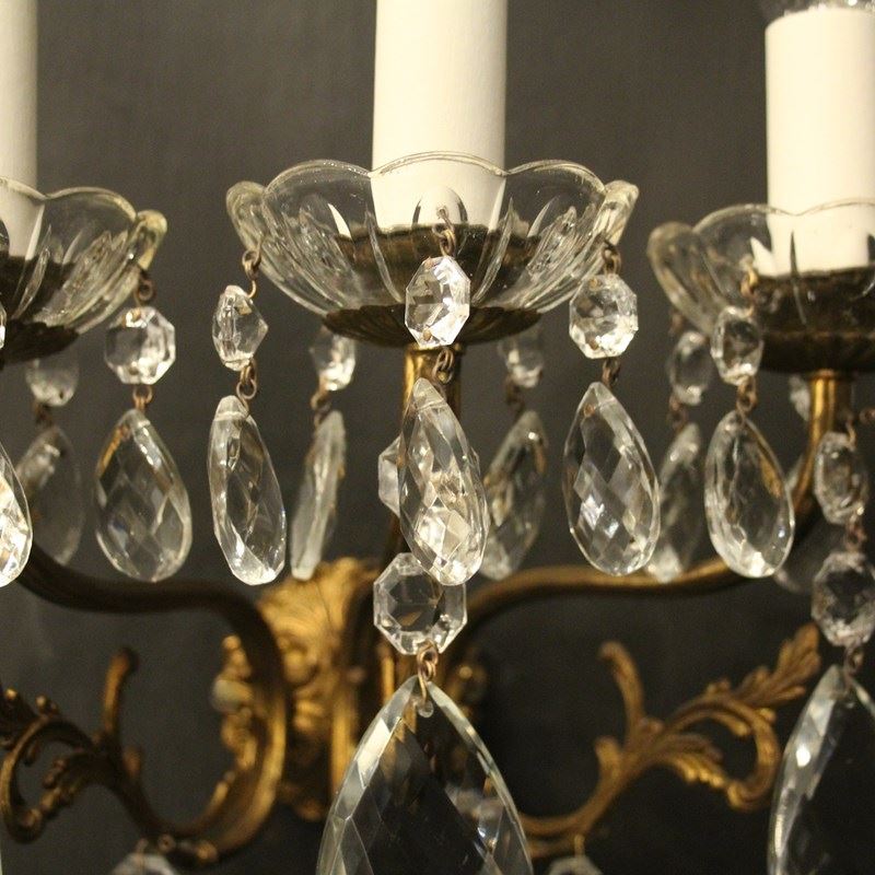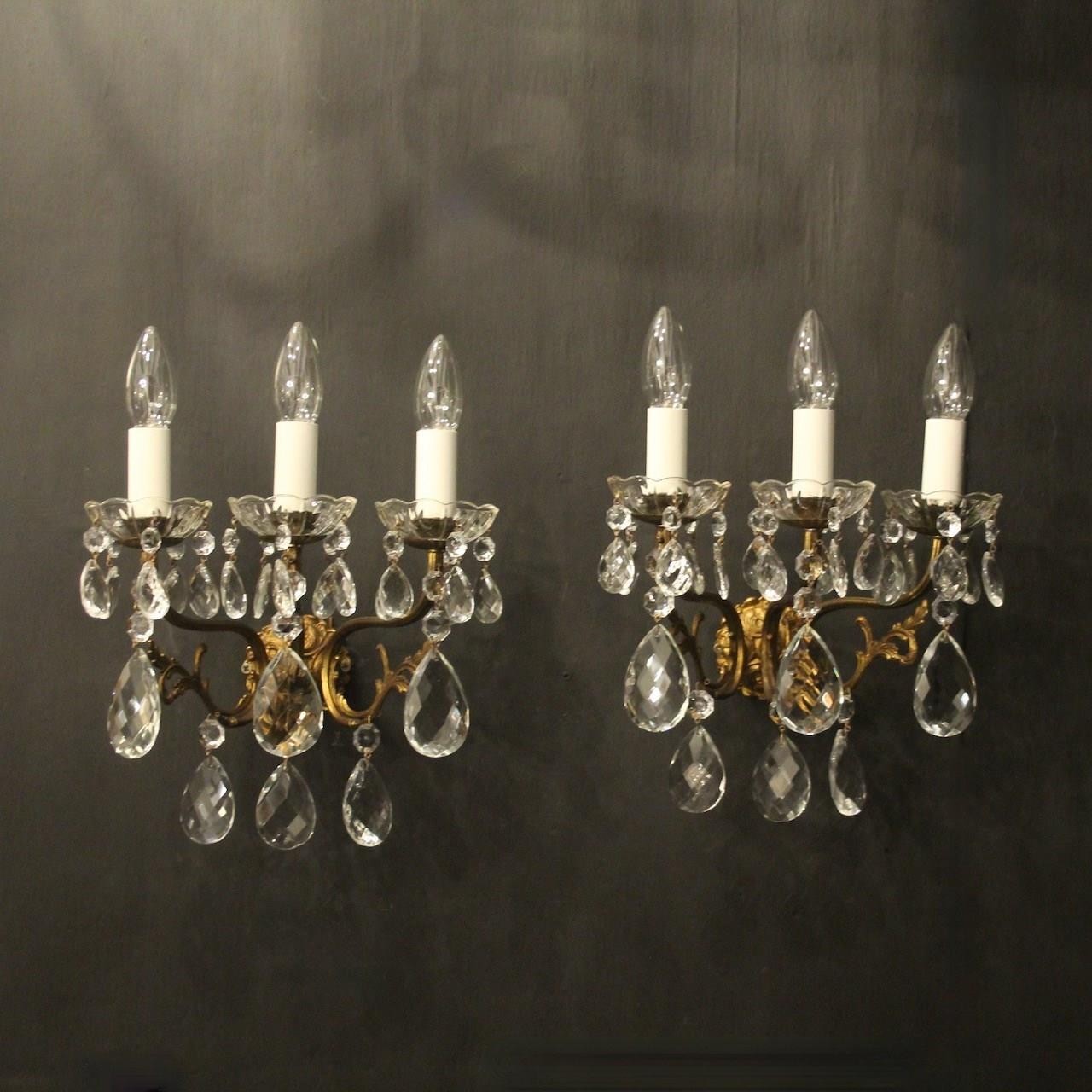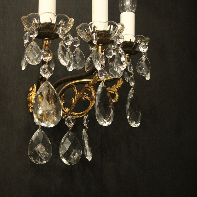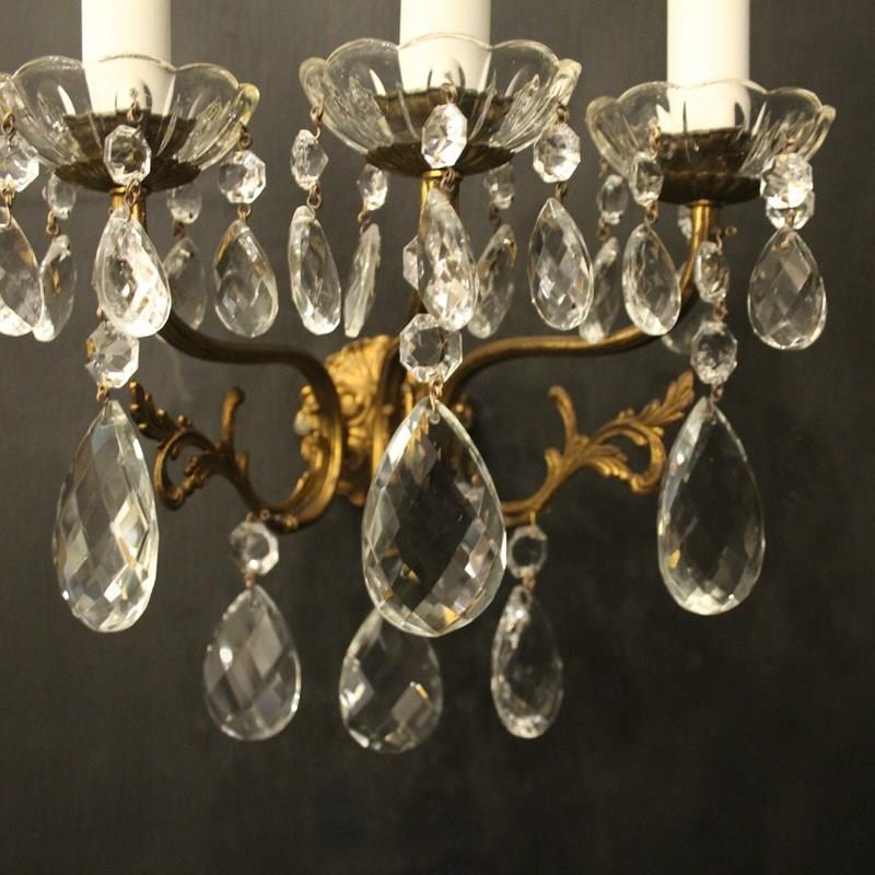 A French pair of gilded brass and crystal triple arm antique wall lights, the leaf scrolling arms with glass bobeche drip pans, issuing from a circular leaf foliated backplate and decorated overall with crystal faceted pendants. Fully rewired and PAT tested. All our wall lights come with aged brass screws for fixing and spare bulbs.