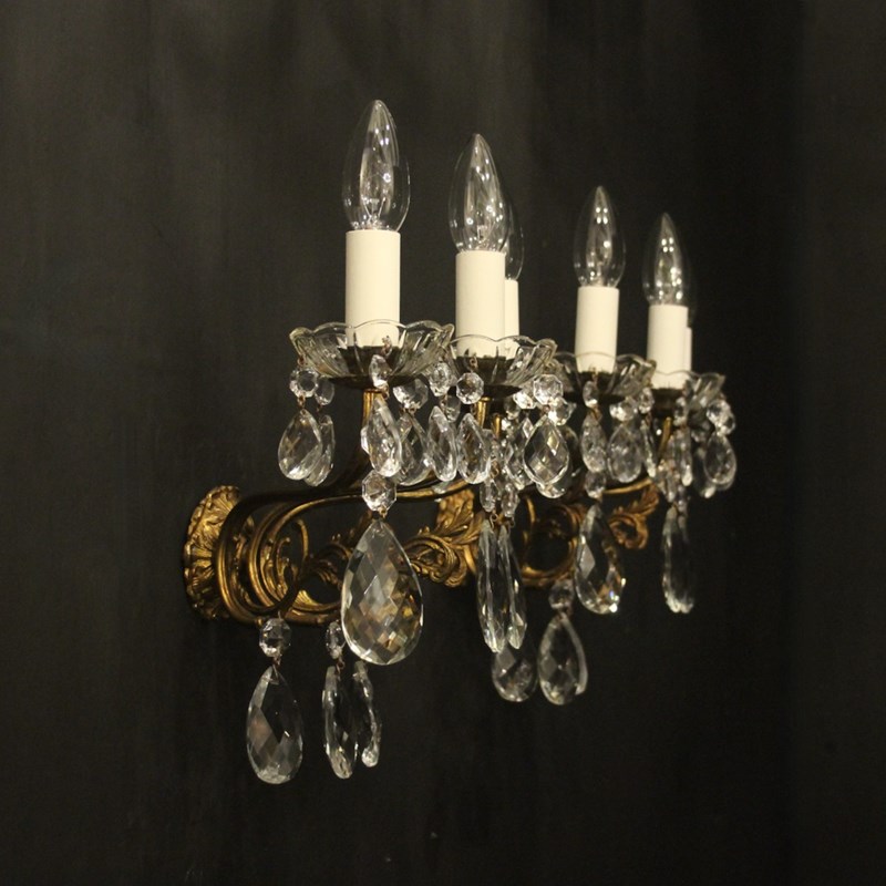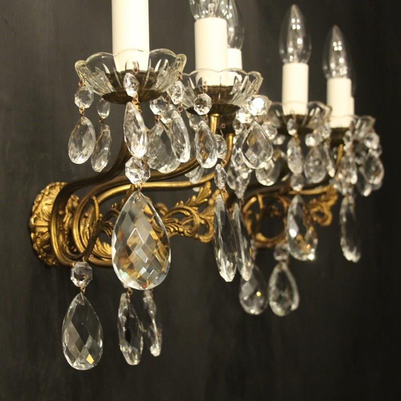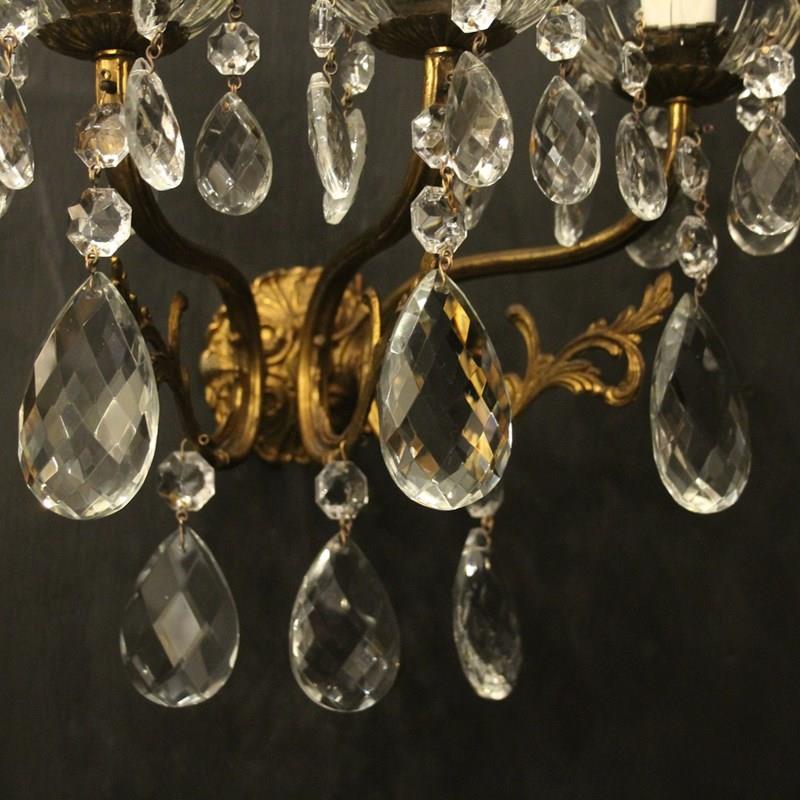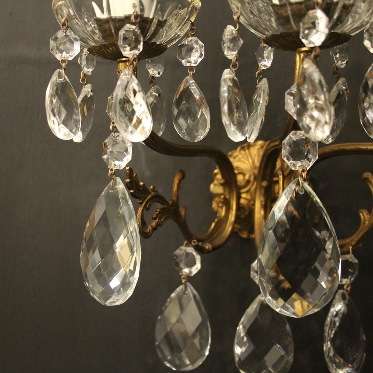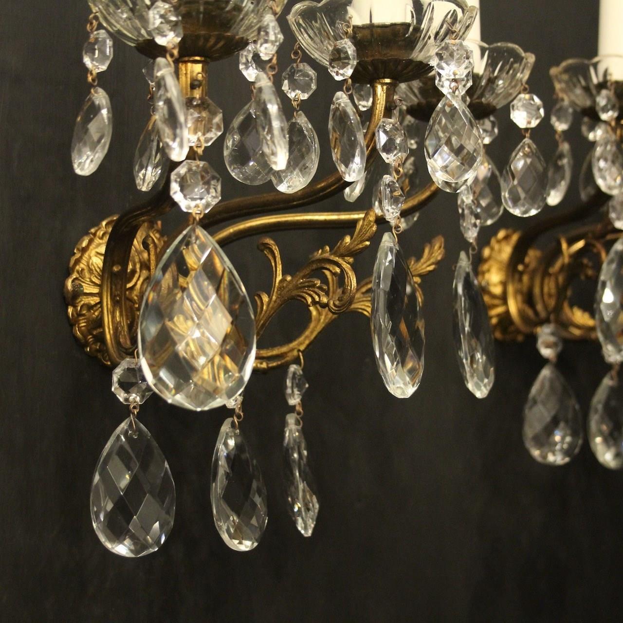 A French pair of gilded brass and crystal triple arm antique wall lights, the leaf scrolling arms with glass bobeche drip pans, issuing from a circular leaf foliated backplate and decorated overall with crystal faceted pendants. Fully rewired and PAT tested. All our wall lights come with aged brass screws for fixing and spare bulbs.