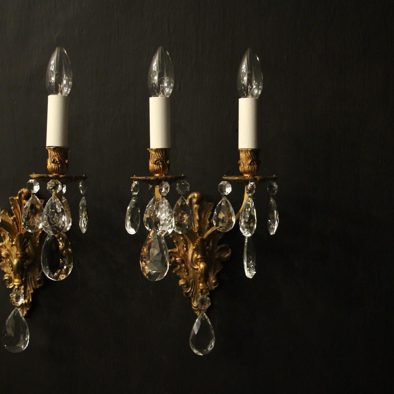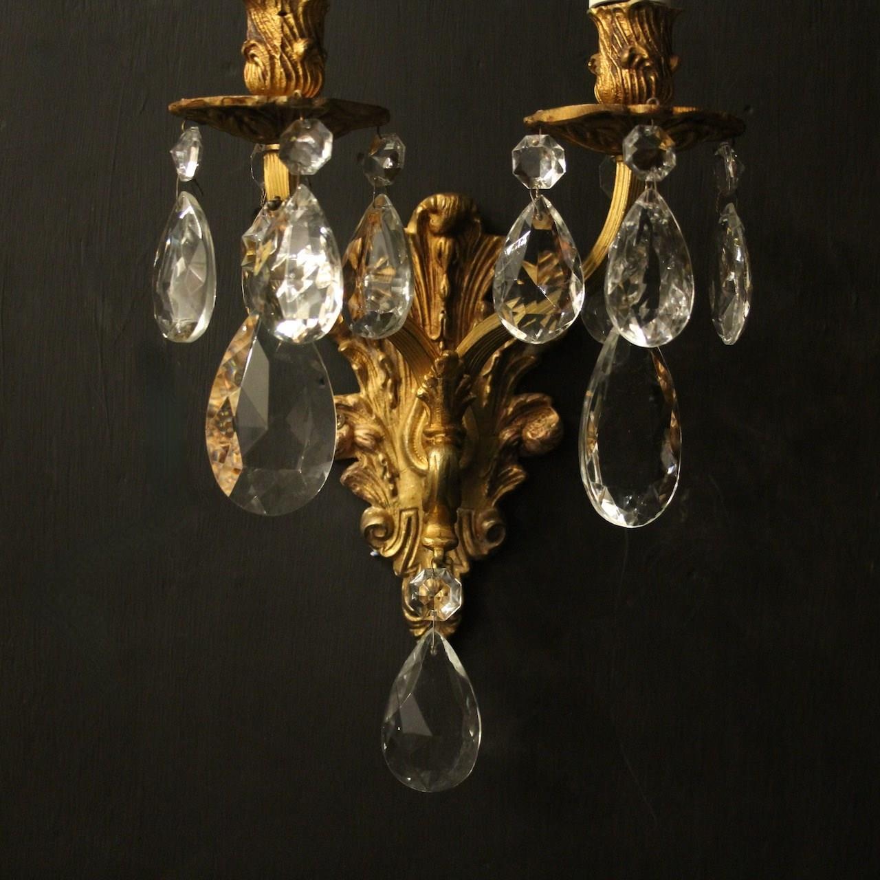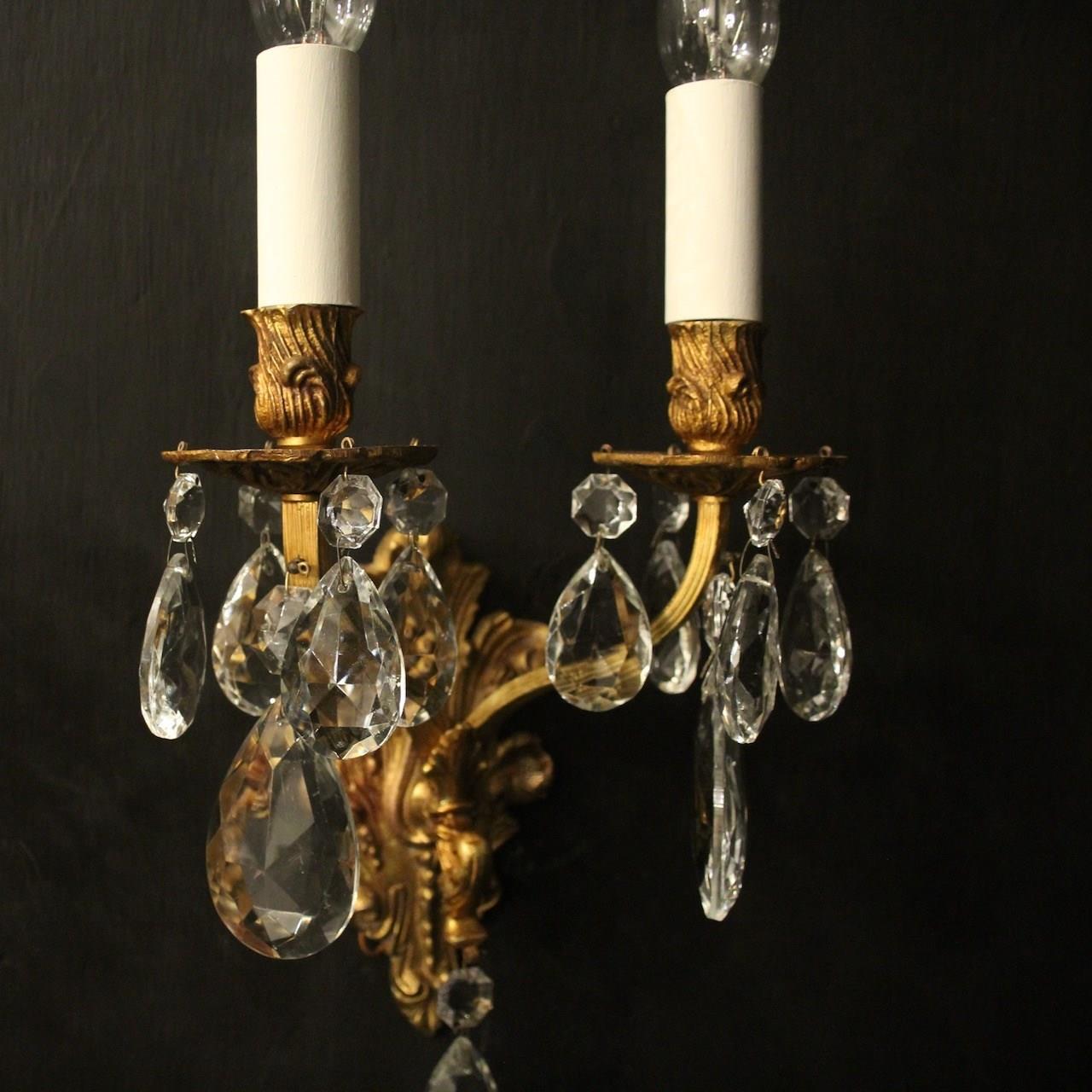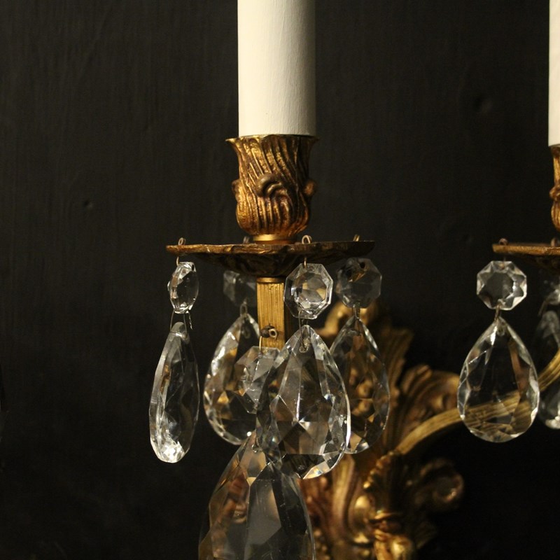 A French pair of gilded bronze and crystal twin arm antique wall lights, the reeded scrolling arms with leaf bobeche drip pans and bulbous leaf candle sconces, issuing from a foliated cartouche shaped backplate and decorated overall with crystal faceted pendants, nice original gilded patination. Fully rewired and PAT tested. All our wall lights come with aged brass screws for fixing and spare bulbs.