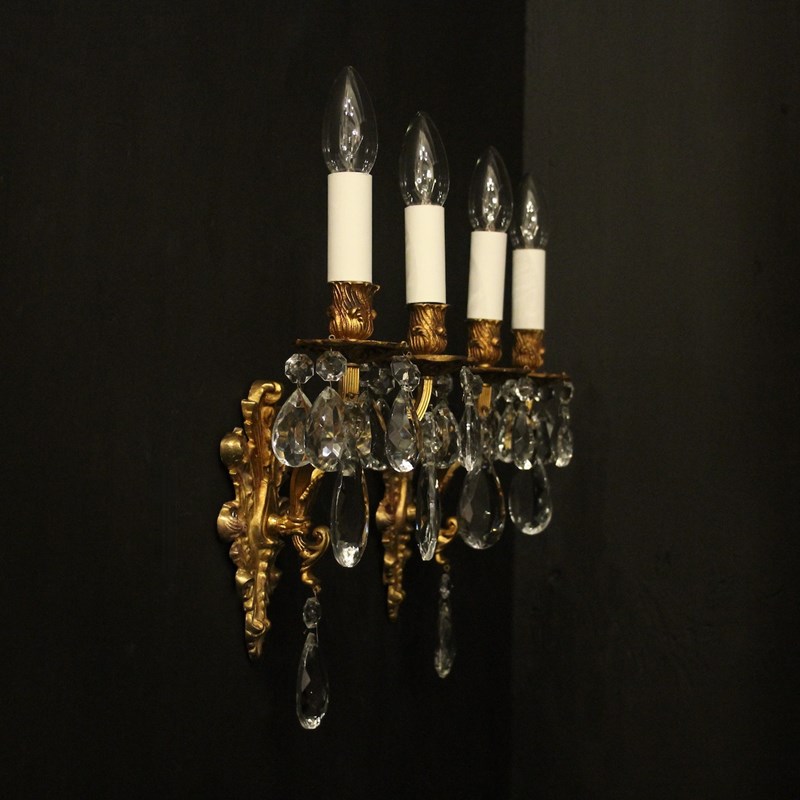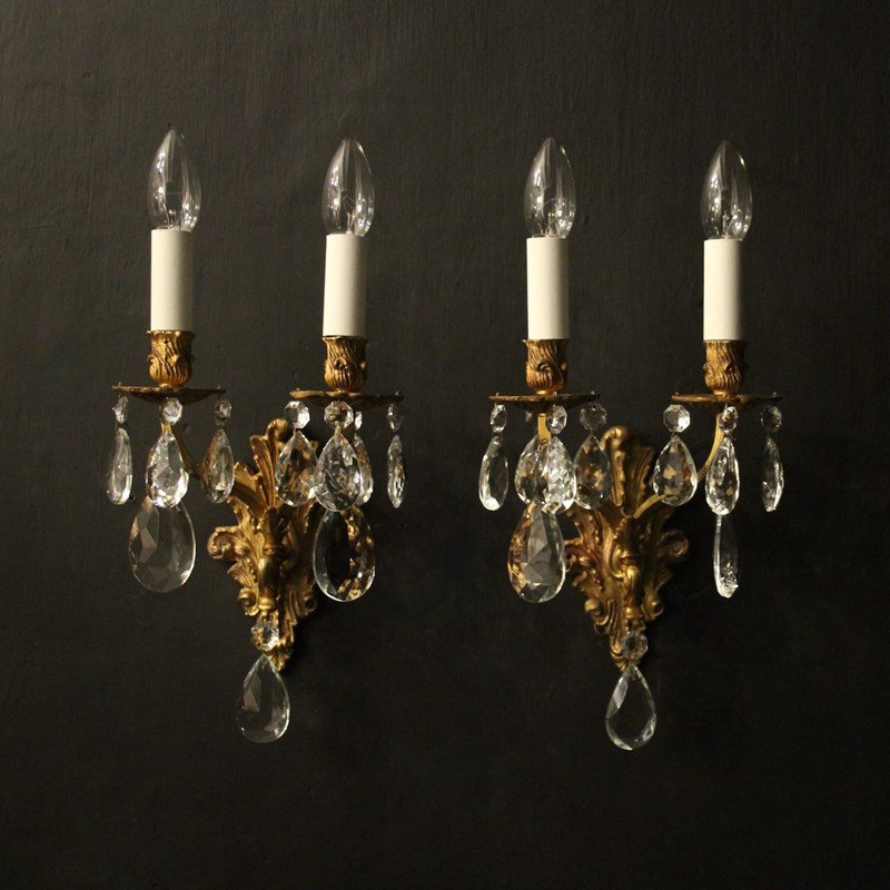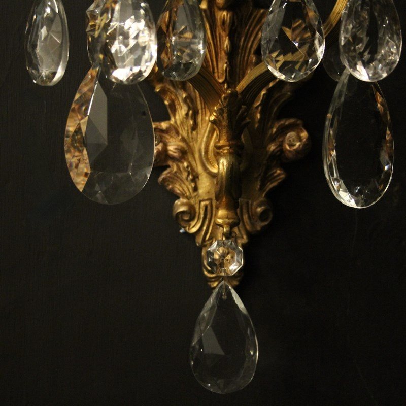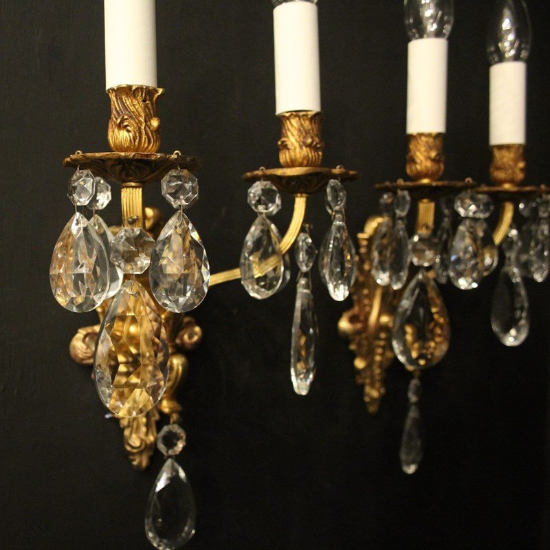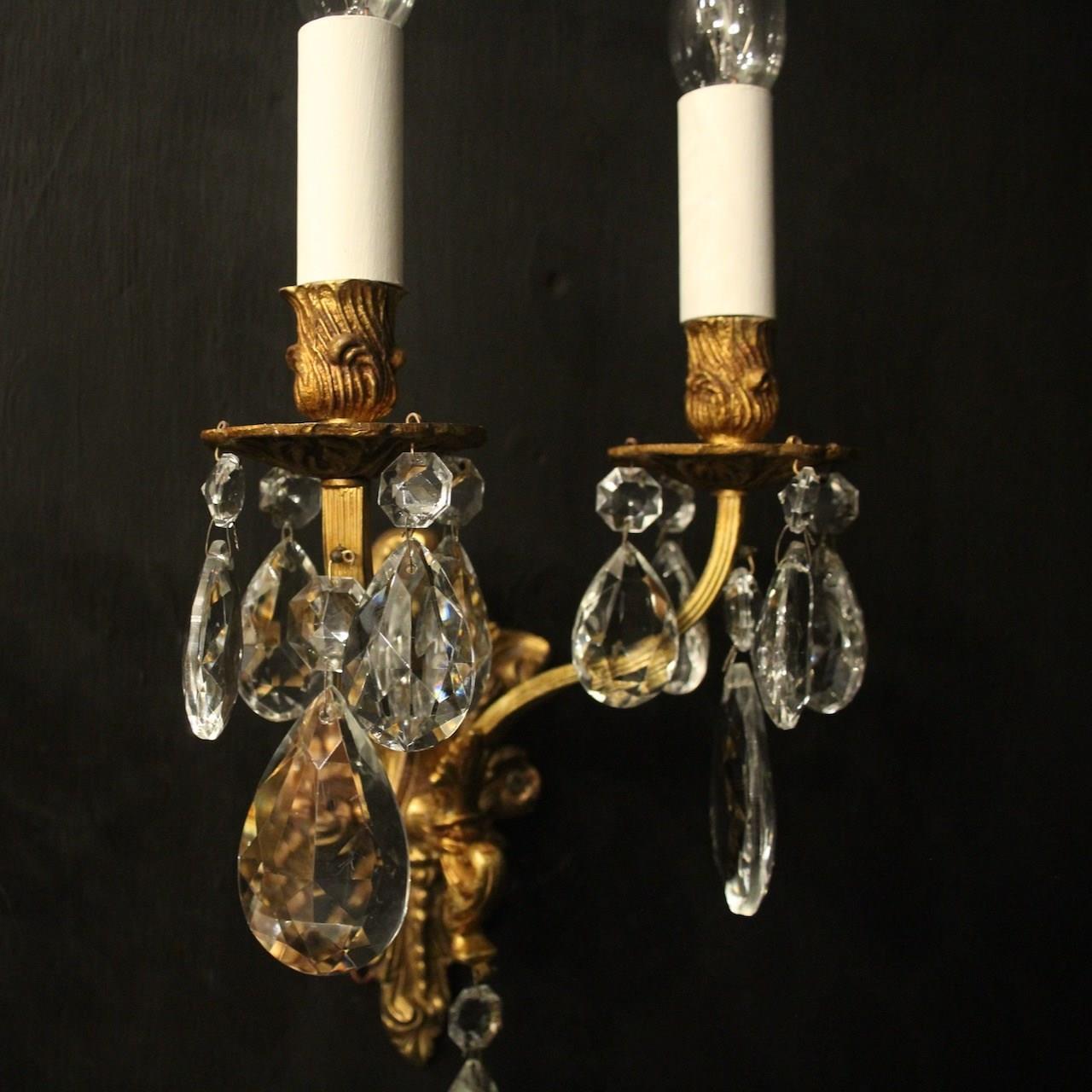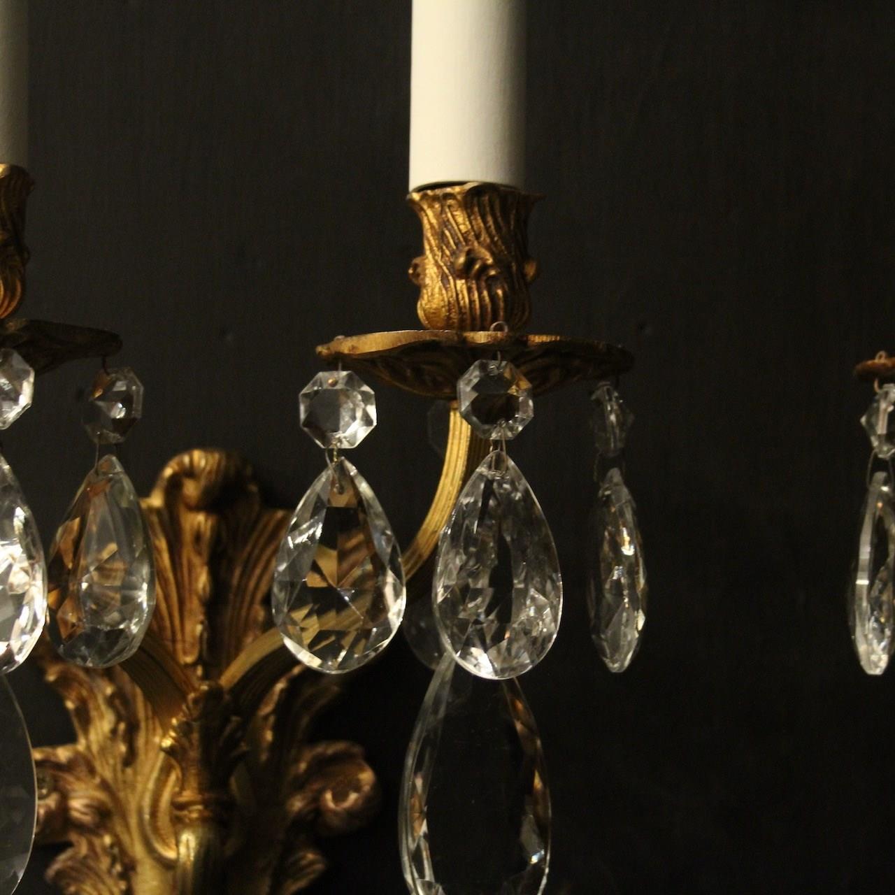 A French pair of gilded bronze and crystal twin arm antique wall lights, the reeded scrolling arms with leaf bobeche drip pans and bulbous leaf candle sconces, issuing from a foliated cartouche shaped backplate and decorated overall with crystal faceted pendants, nice original gilded patination. Fully rewired and PAT tested. All our wall lights come with aged brass screws for fixing and spare bulbs.