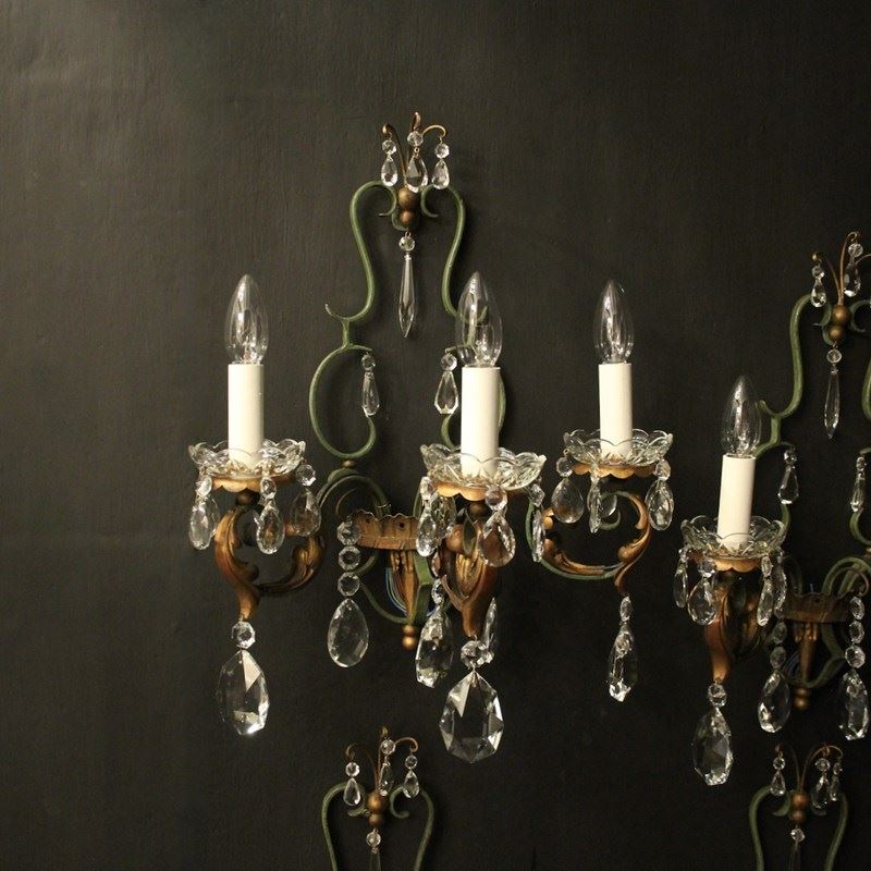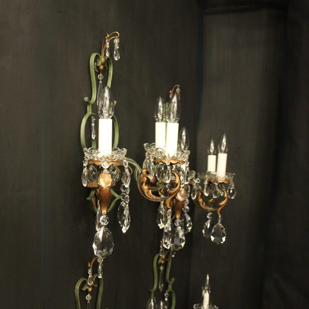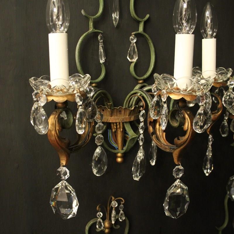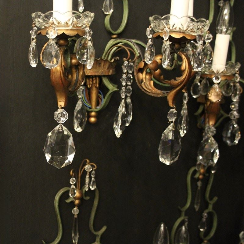 A lovely set of 4 French polychrome wrought iron triple arm antique wall lights, the ornate gilded toleware leaf scrolling arms with leaf and glass bobeche drip pans, issuing from an open green and gilt wrought iron shield backplate, decorated overall with faceted crystal pendants, great scale and very decorative with original gilded and green painted patination. Fully rewired and PAT tested. All our wall lights come with aged brass screws or brackets for fixing and spare bulbs.