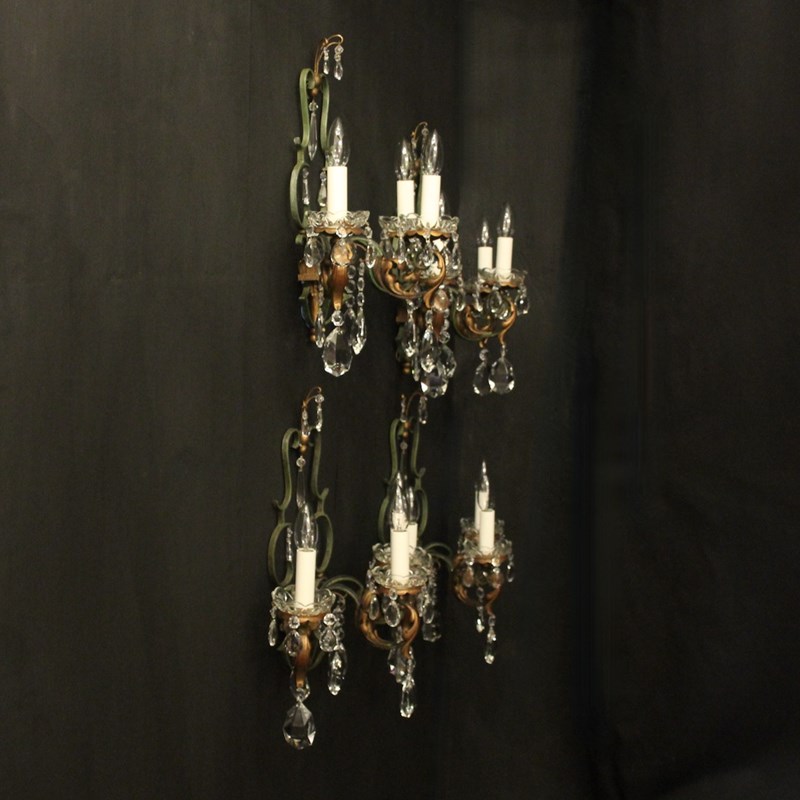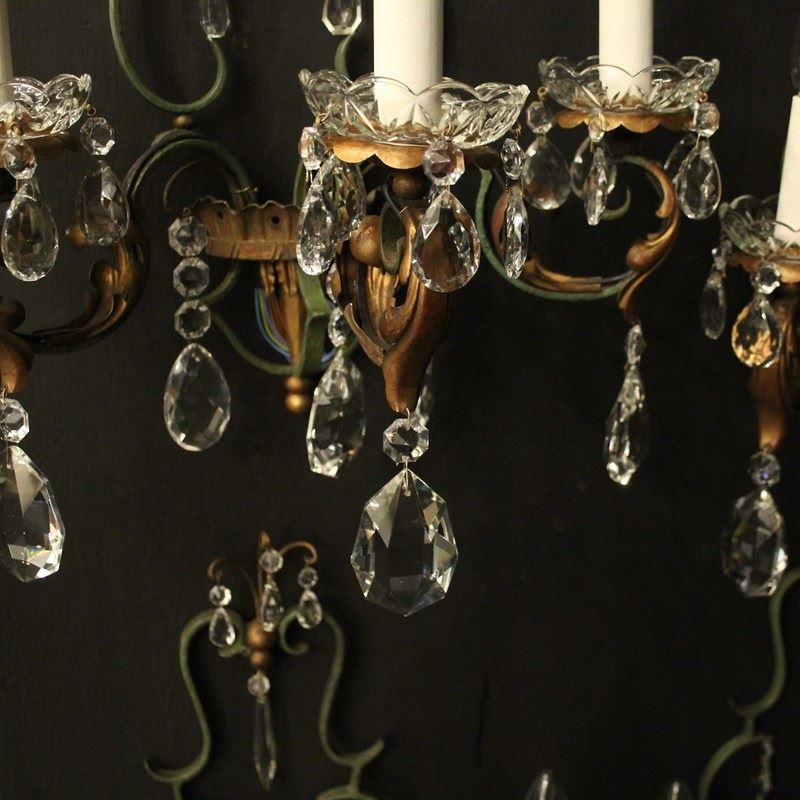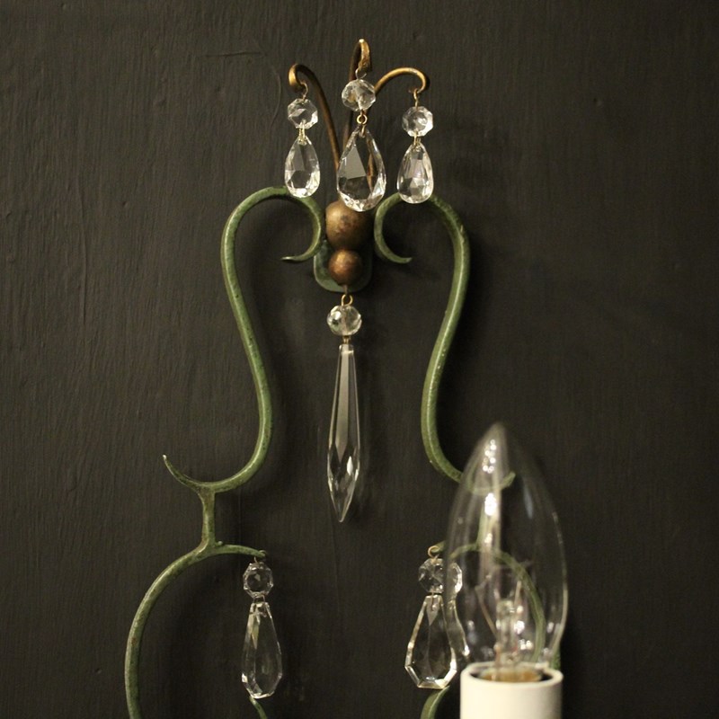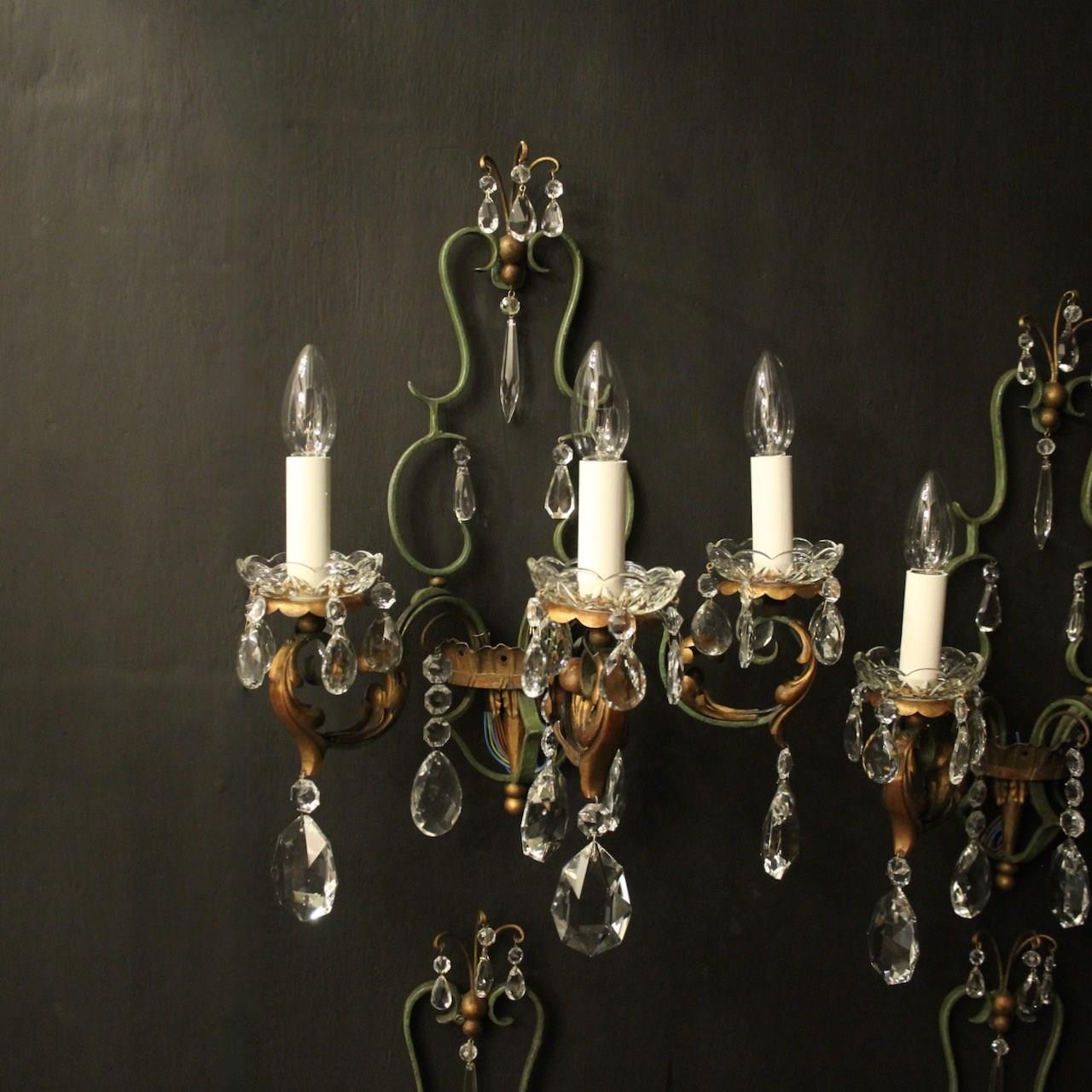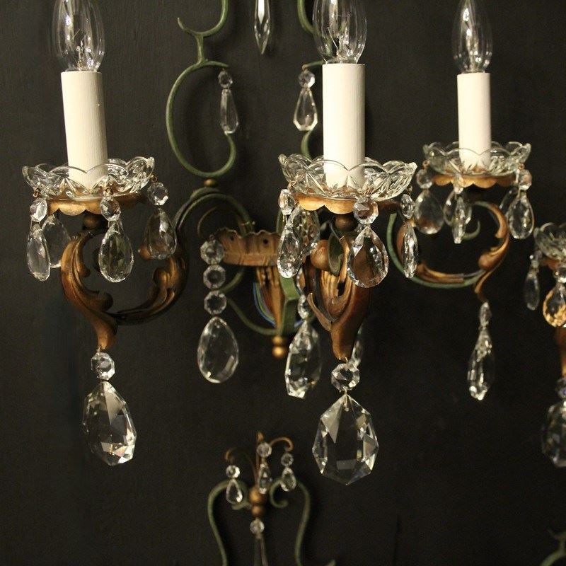 A lovely set of 4 French polychrome wrought iron triple arm antique wall lights, the ornate gilded toleware leaf scrolling arms with leaf and glass bobeche drip pans, issuing from an open green and gilt wrought iron shield backplate, decorated overall with faceted crystal pendants, great scale and very decorative with original gilded and green painted patination. Fully rewired and PAT tested. All our wall lights come with aged brass screws or brackets for fixing and spare bulbs.