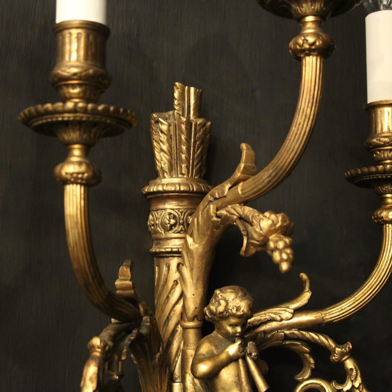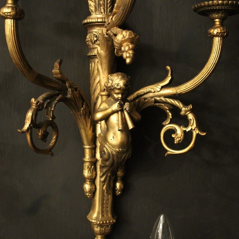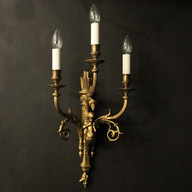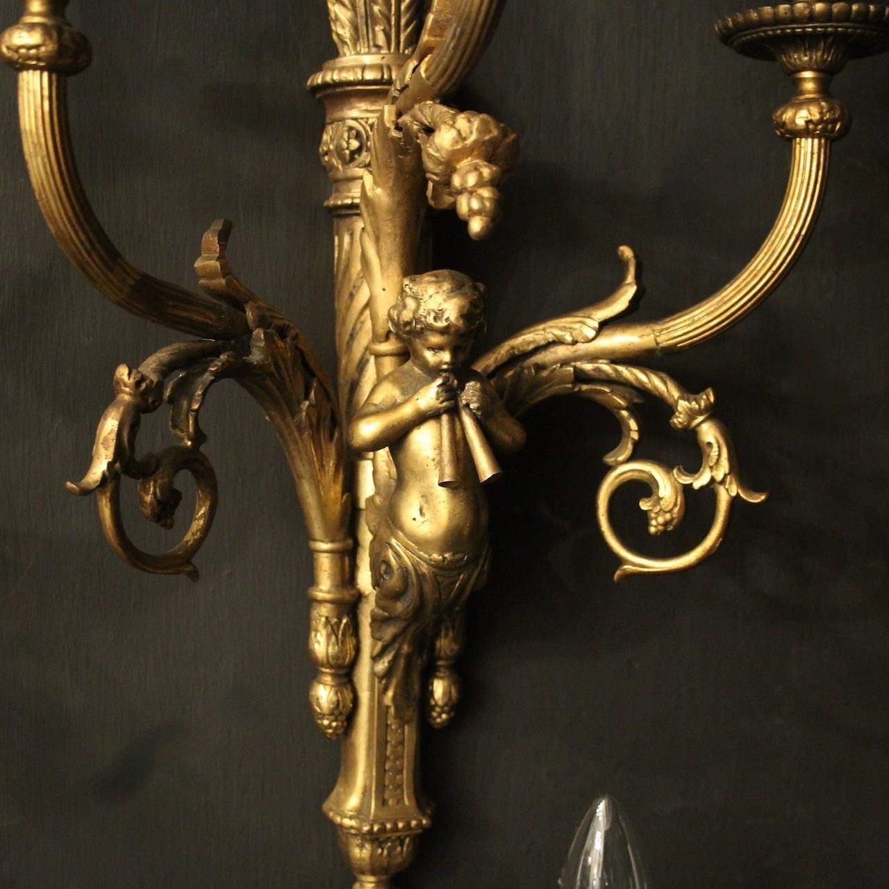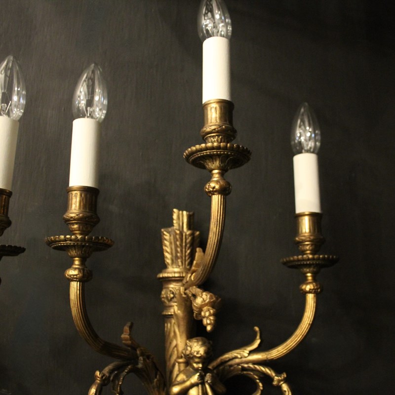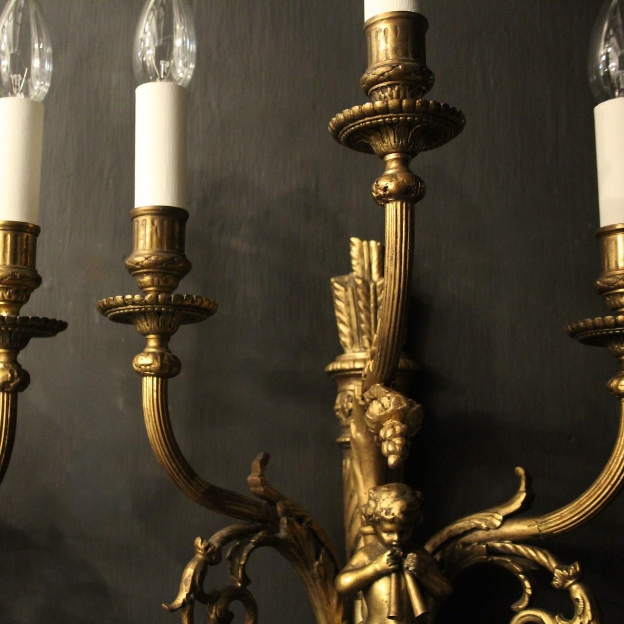 A French set of 4 gilded brass triple arm antique wall lights, the tiered reeded scrolling arms with circular leaf bobeche drip pans reeded candle sconces, issuing from tapering twisted arrow sheath backplate with arrow feather top with ornate centre pipe blowing cherubs. Nice gilded patination. Fully rewired and PAT tested. All our wall lights come with aged brass screws or brackets for fixing and spare bulbs.