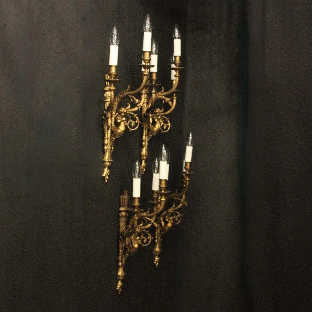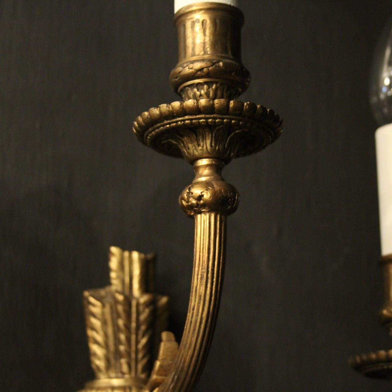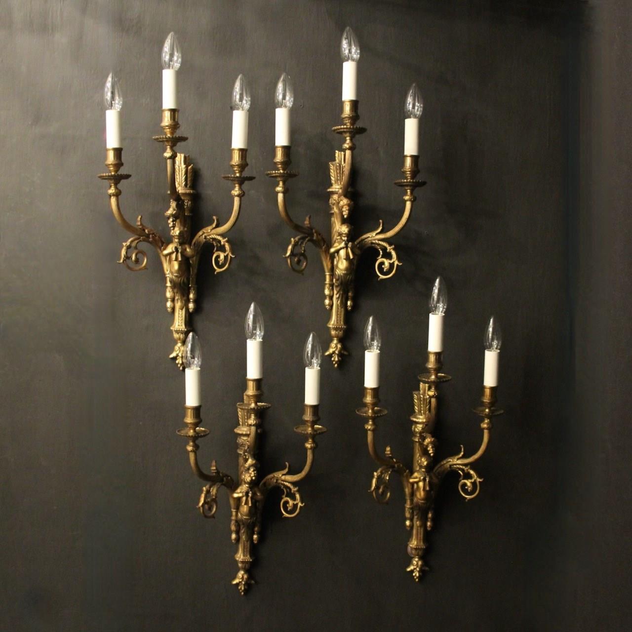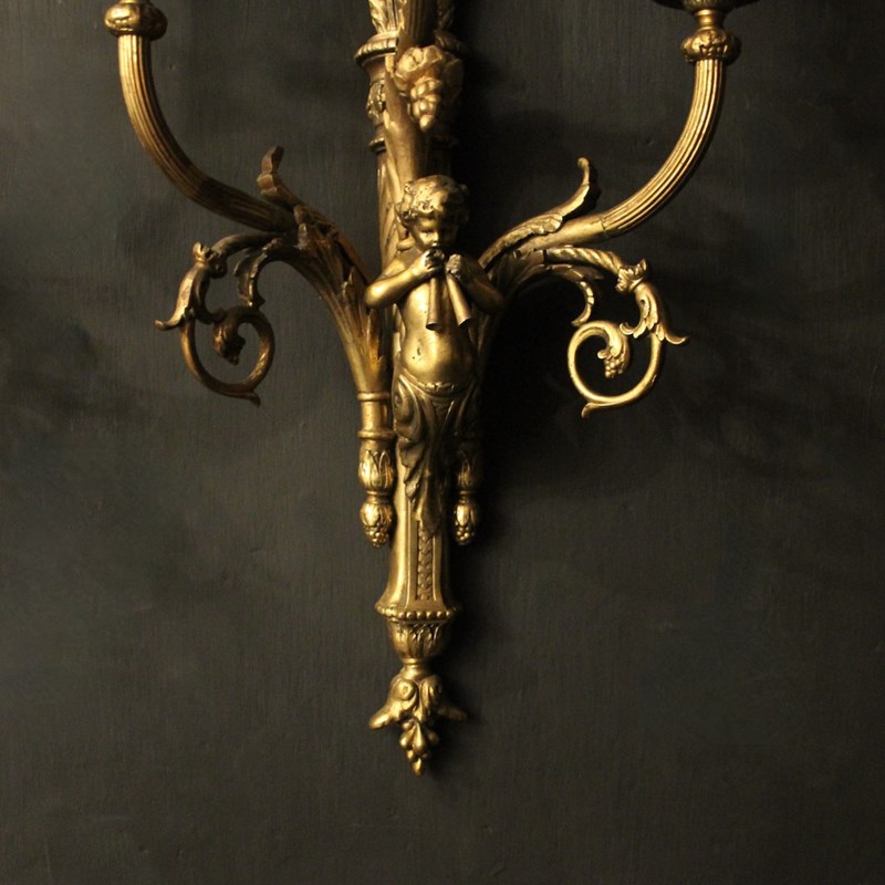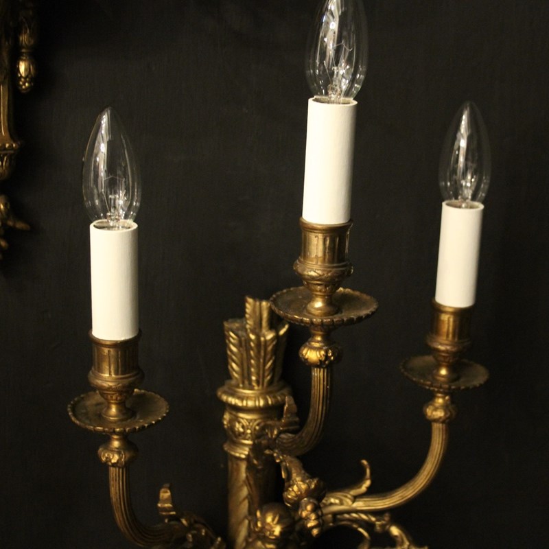 A French set of 4 gilded brass triple arm antique wall lights, the tiered reeded scrolling arms with circular leaf bobeche drip pans reeded candle sconces, issuing from tapering twisted arrow sheath backplate with arrow feather top with ornate centre pipe blowing cherubs. Nice gilded patination. Fully rewired and PAT tested. All our wall lights come with aged brass screws or brackets for fixing and spare bulbs.