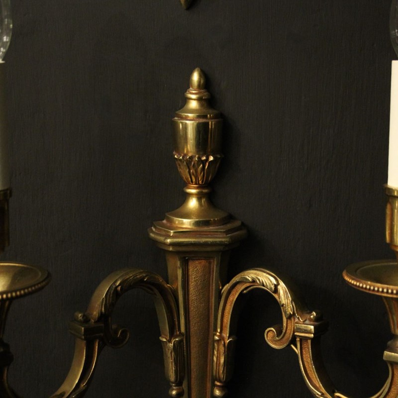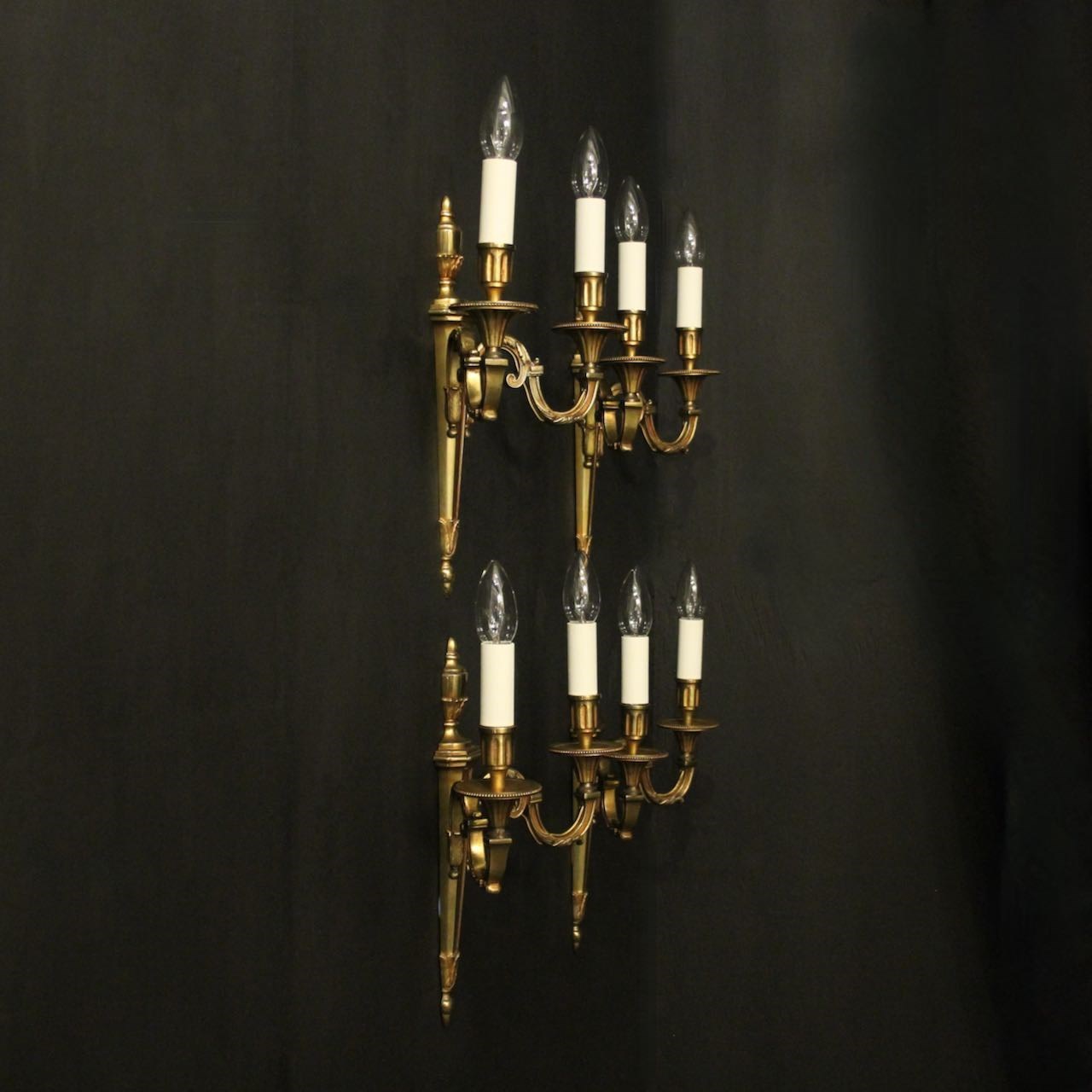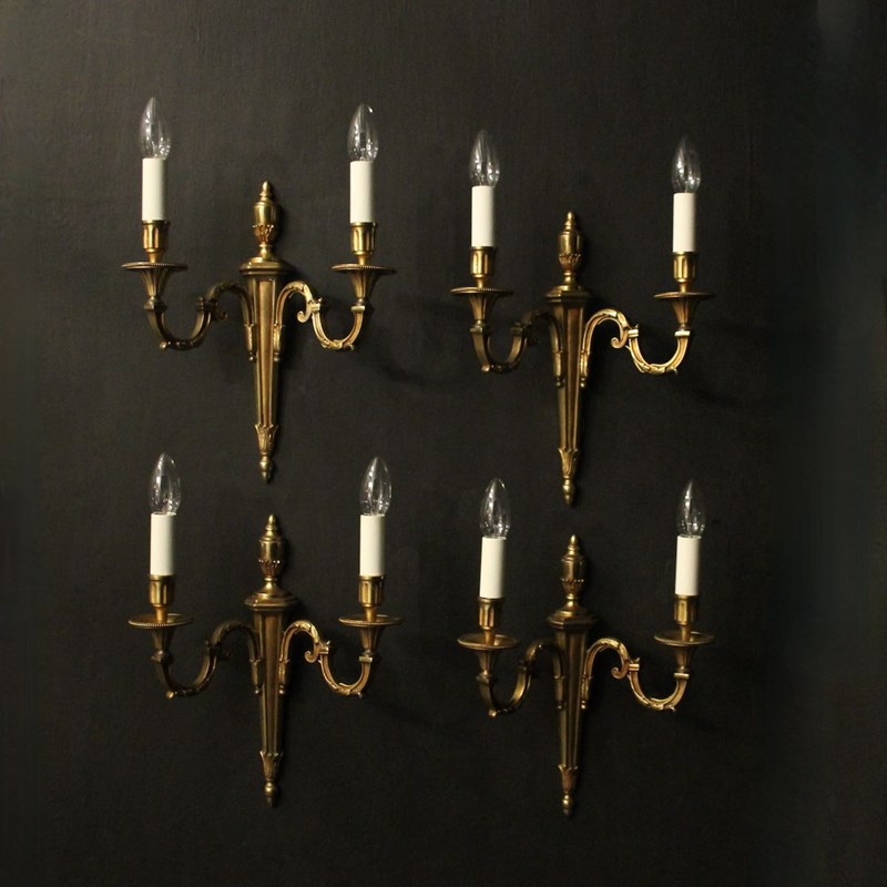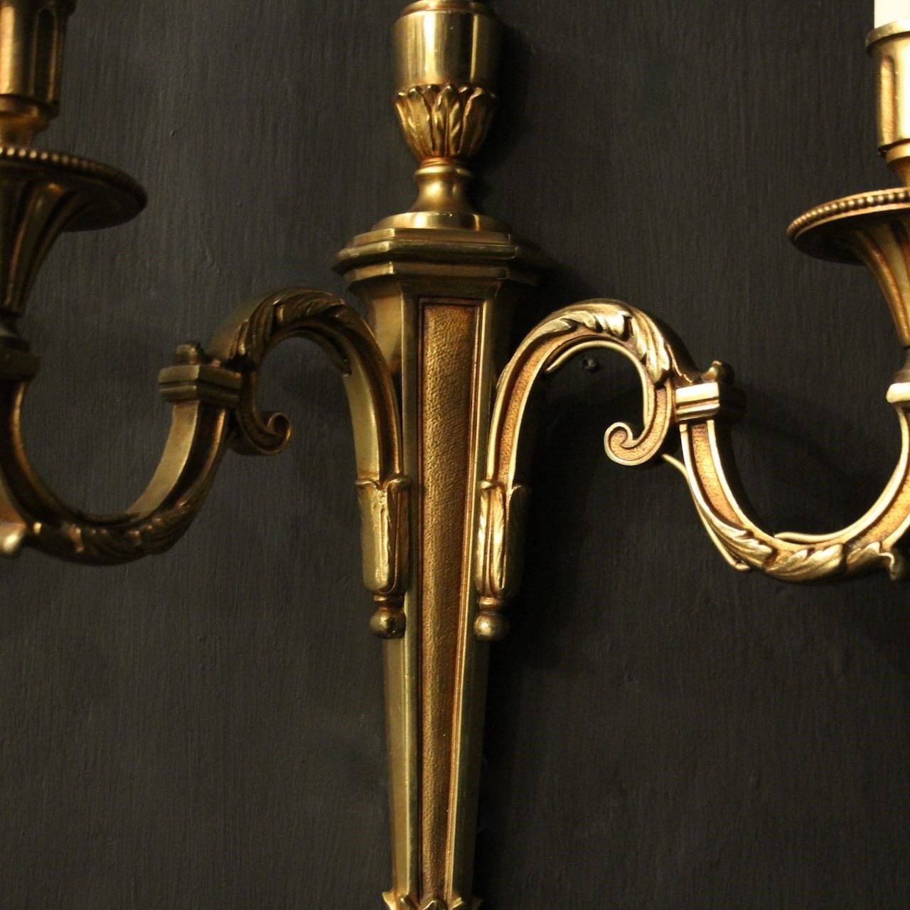 A French set of 4 gilded brass twin arm antique wall lights, the leaf clad square gauge scrolling arms with trumpet reeded millgrain bobeche drip pans and reeded candle sconces, issuing from a leaf tapering backplate with urn finial. All stamped L.G for by Lucian Gau, great quality French lighting company. Fully rewired and PAT tested. All our wall lights come with aged brass screws or brackets for fixing and spare bulbs.