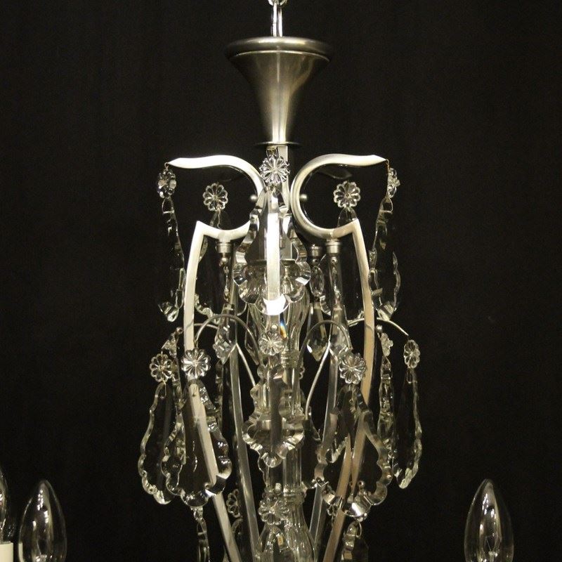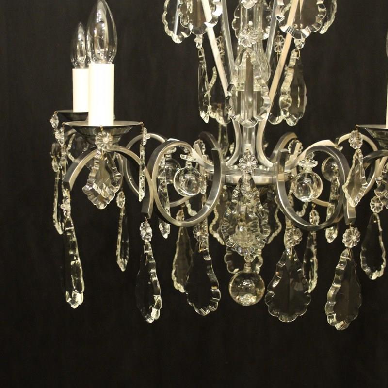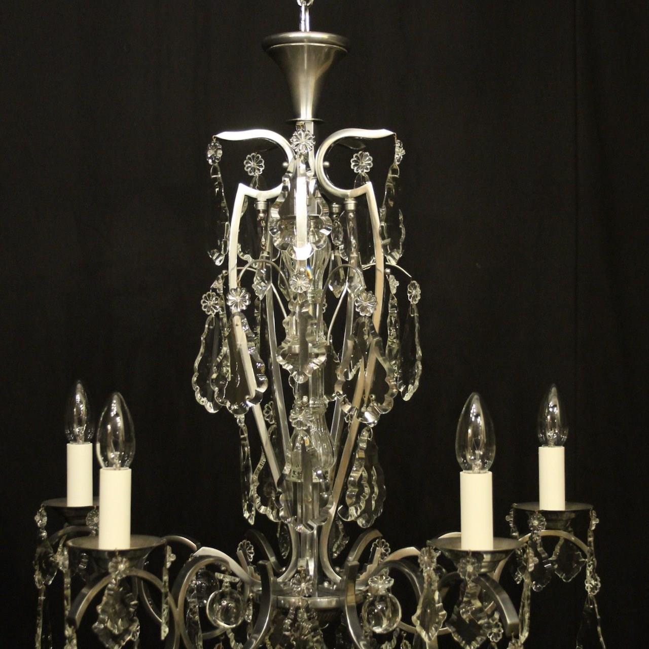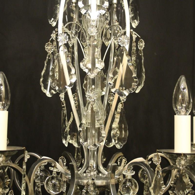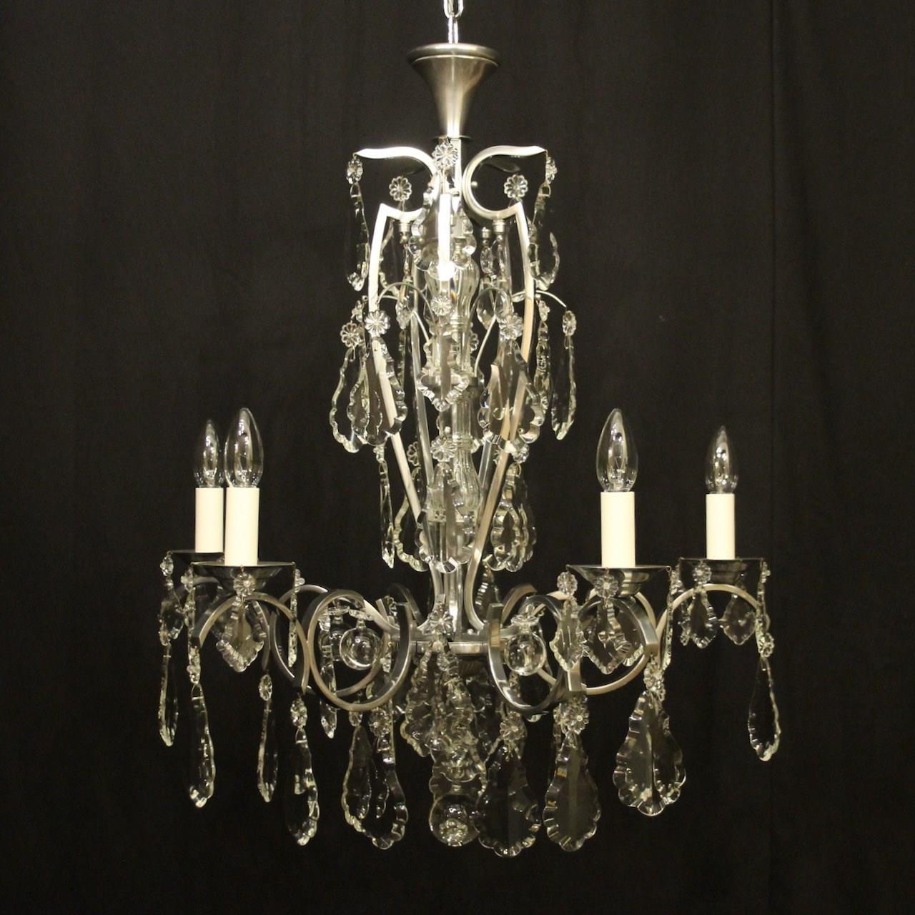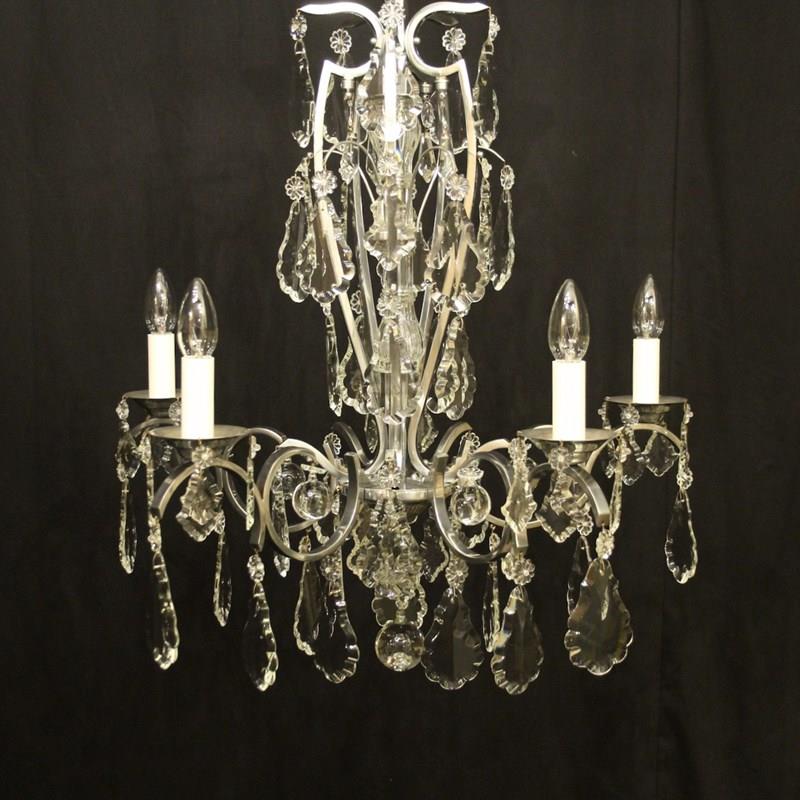 A pretty French silver gilded brass and crystal 5 light antique chandelier, the square gauge scrolling arms with circular bobeche drip pans, issuing from a glass baluster centre column with square gauge framework, decorated overall in faceted French Slab crystal pendants and having the original chain and ceiling rose, lovely silver patination. Fully rewired and PAT tested. All our chandeliers come with ceiling fixings and spare bulbs.
