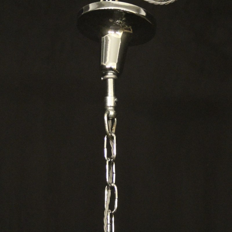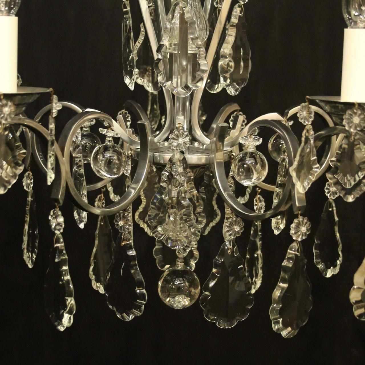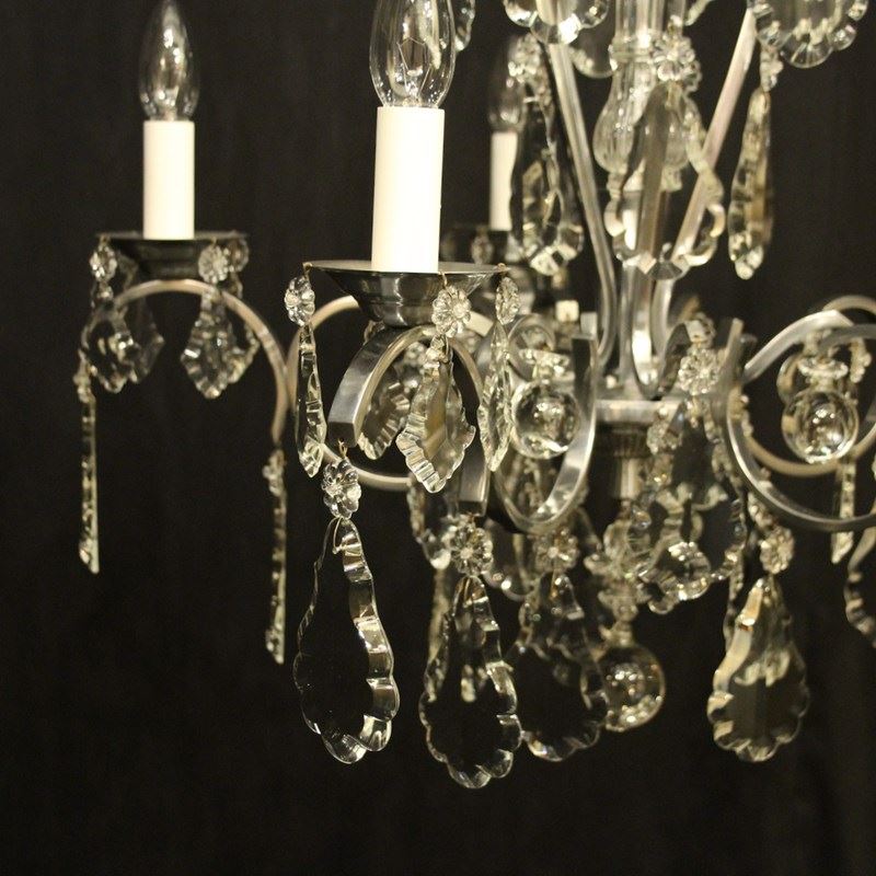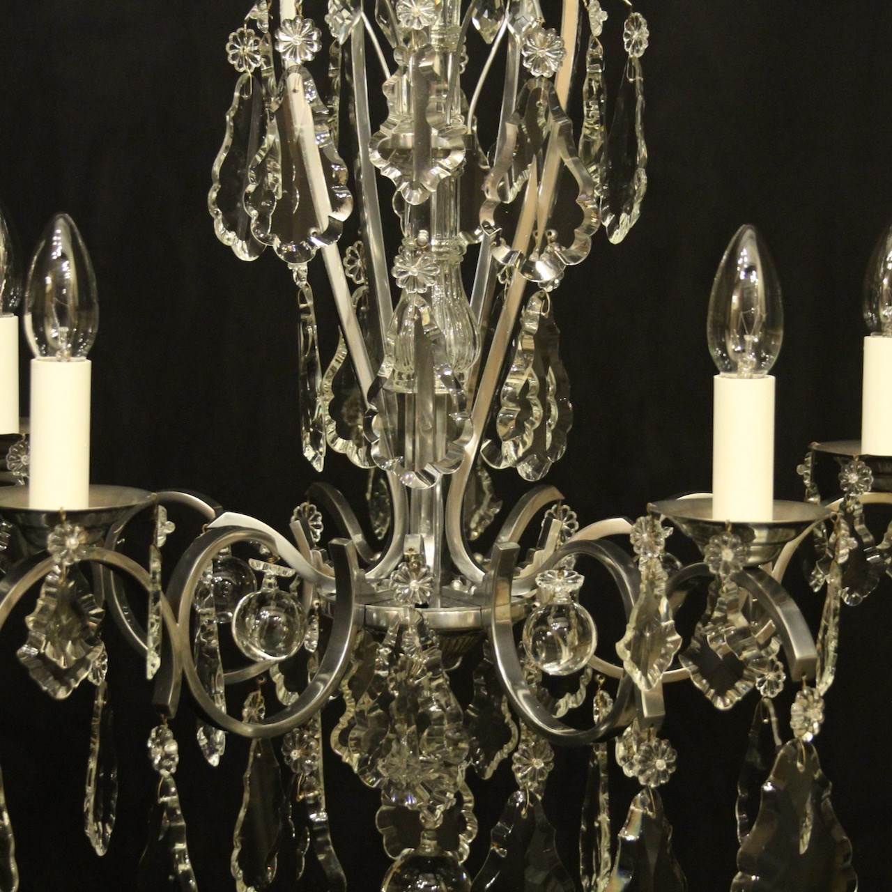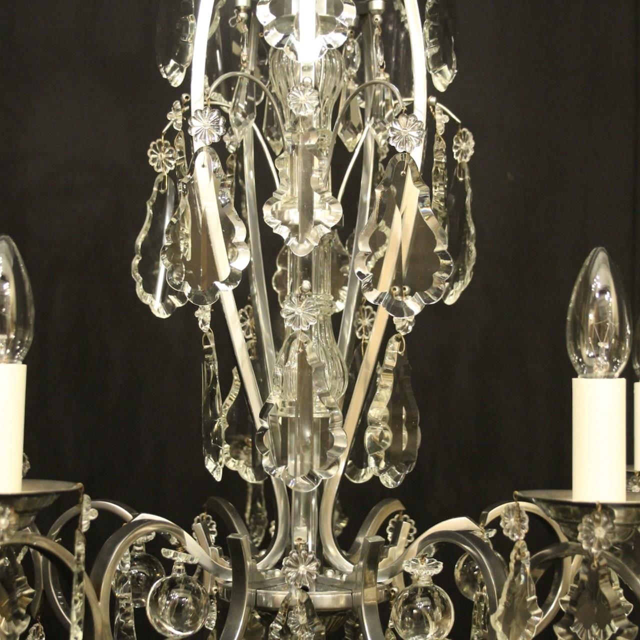 A pretty French silver gilded brass and crystal 5 light antique chandelier, the square gauge scrolling arms with circular bobeche drip pans, issuing from a glass baluster centre column with square gauge framework, decorated overall in faceted French Slab crystal pendants and having the original chain and ceiling rose, lovely silver patination. Fully rewired and PAT tested. All our chandeliers come with ceiling fixings and spare bulbs.