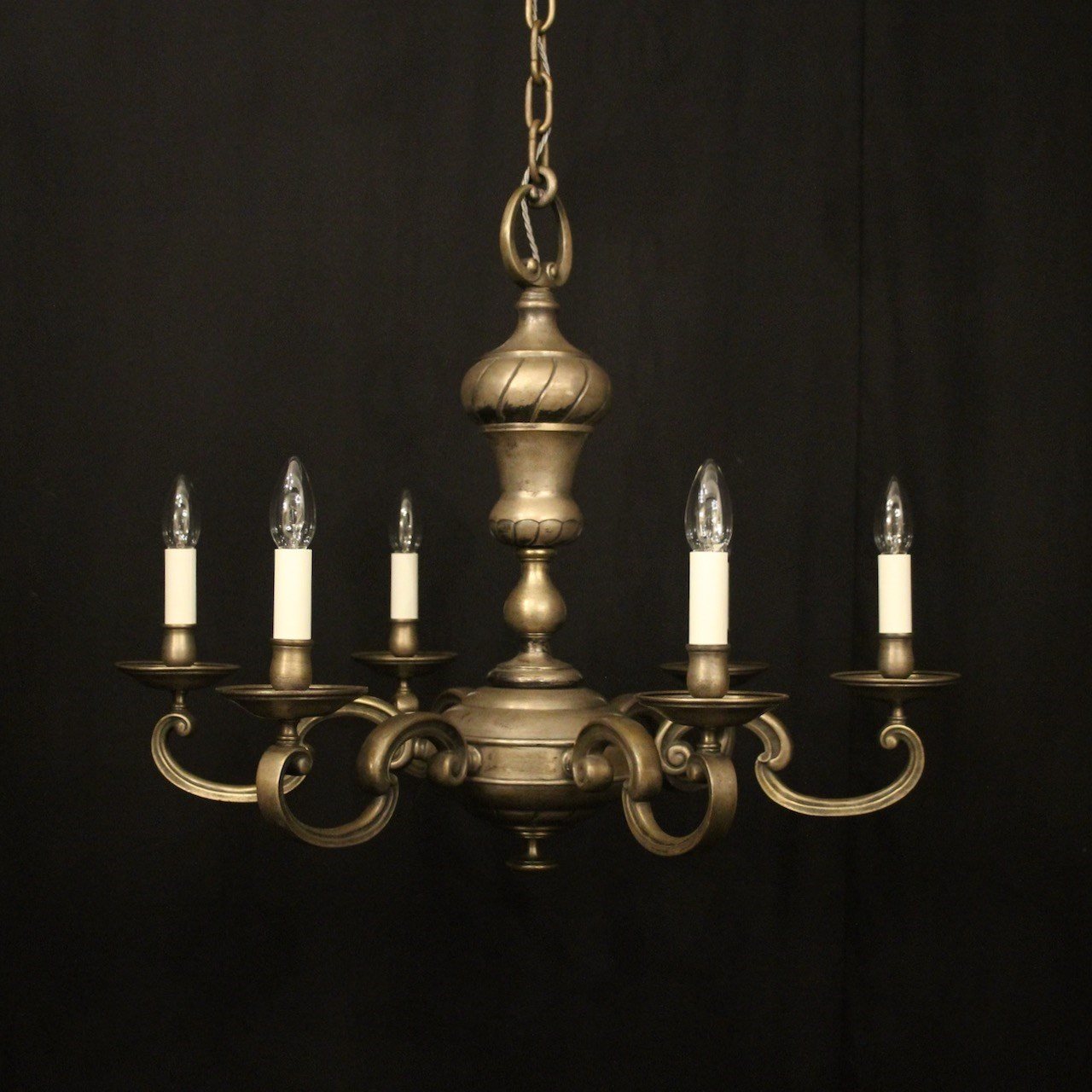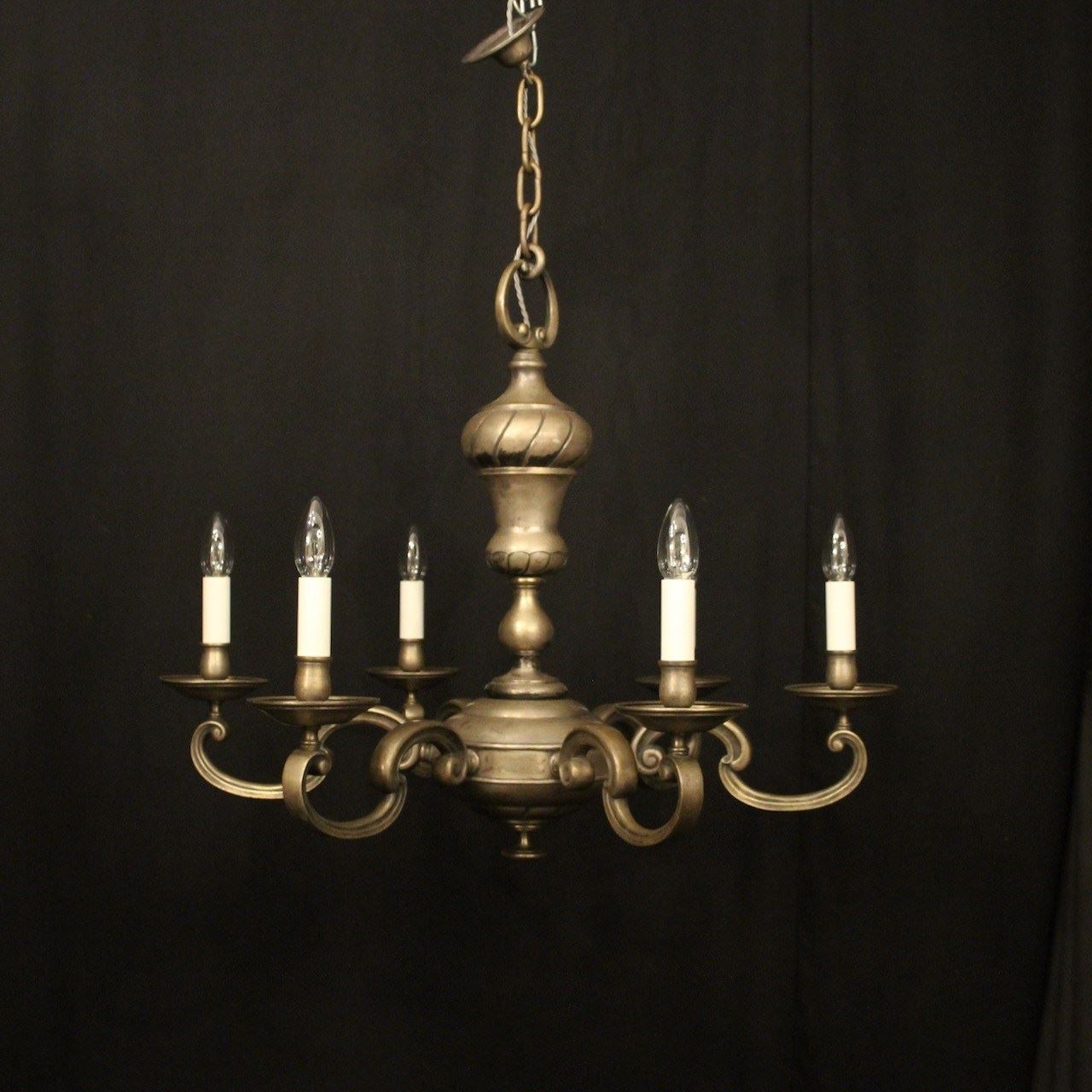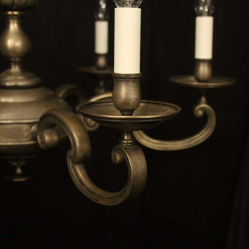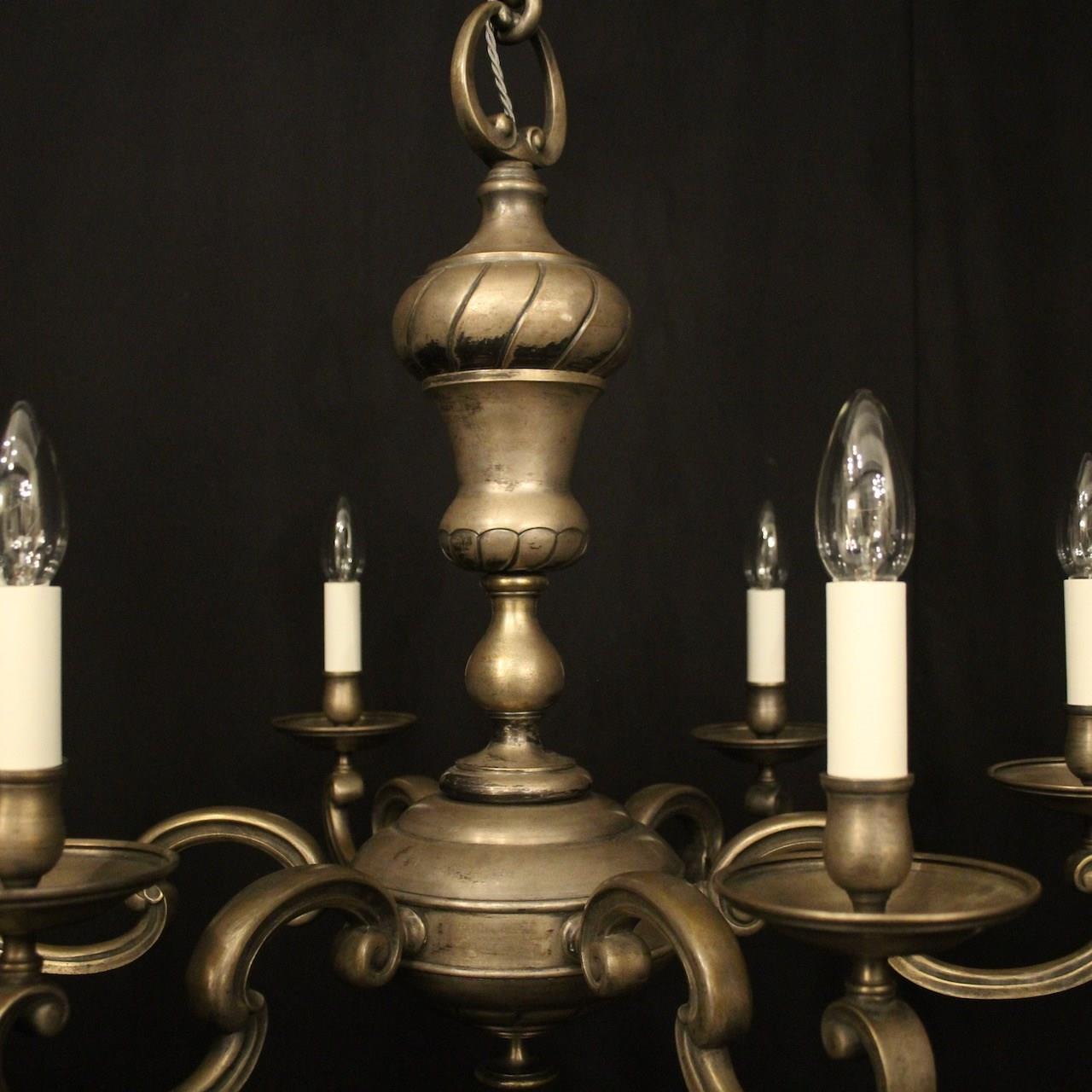 A French silver gilded brass 6 light antique chandelier, the scrolling arms with circular bobeche drip pans and bulbous candle sconces, issuing from a decorative tapering twisted urn central column with sectional base, lovely original faded silver gilded colour. Fully rewired and PAT tested. All our chandeliers come with bulbs and ceiling fixings.