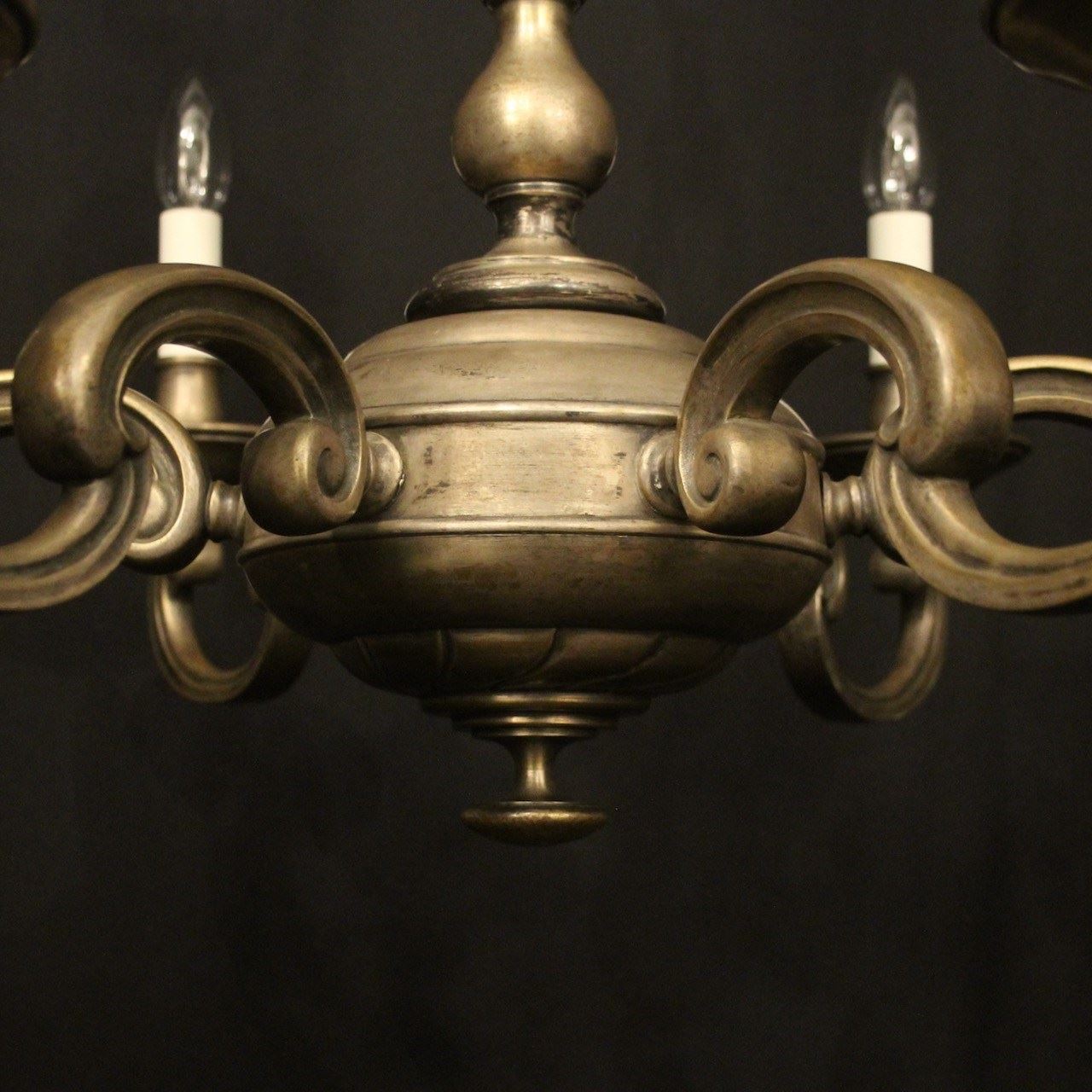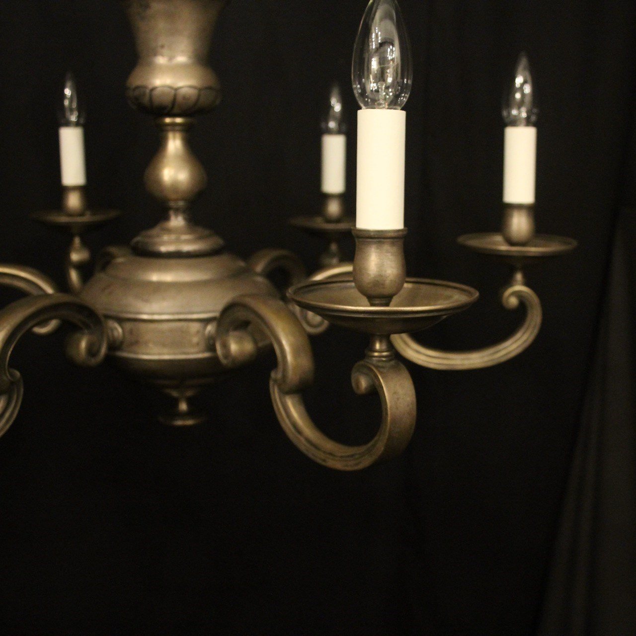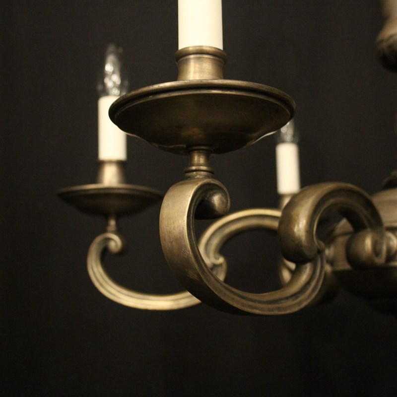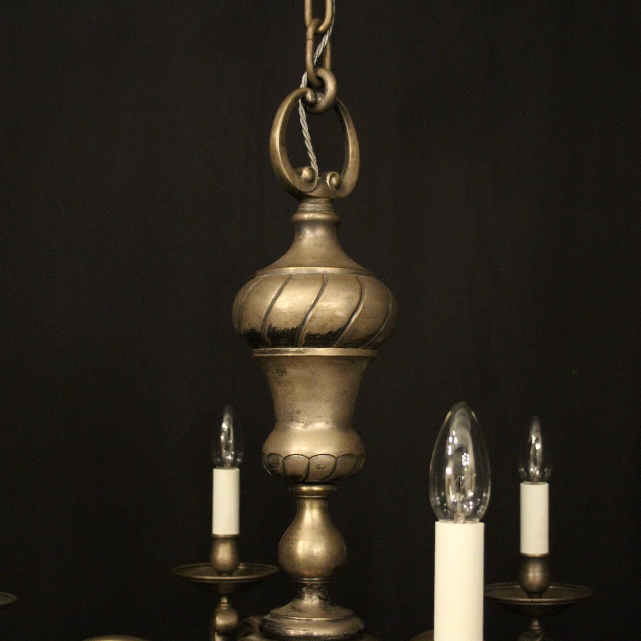 A French silver gilded brass 6 light antique chandelier, the scrolling arms with circular bobeche drip pans and bulbous candle sconces, issuing from a decorative tapering twisted urn central column with sectional base, lovely original faded silver gilded colour. Fully rewired and PAT tested. All our chandeliers come with bulbs and ceiling fixings.