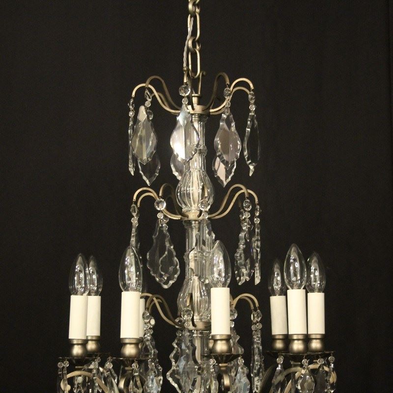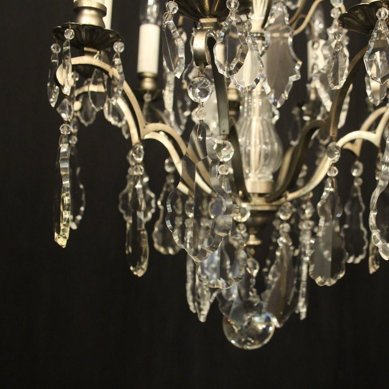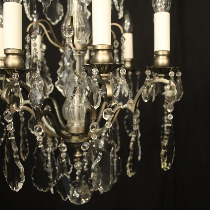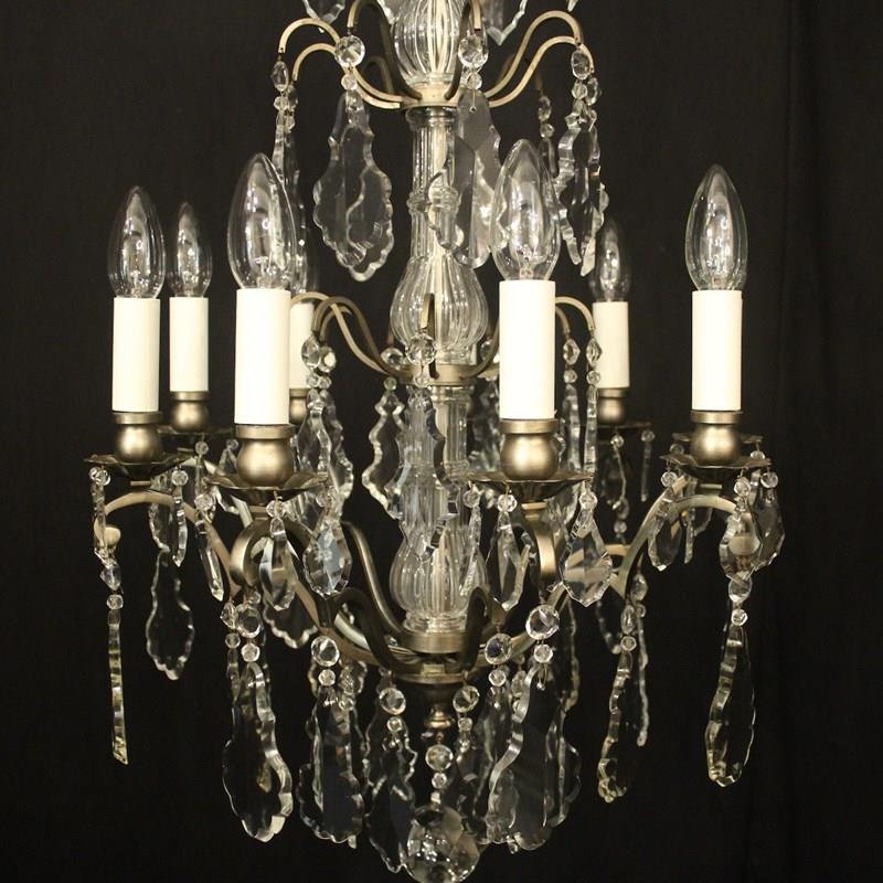 A French silver gilded brass and crystal 9 light antique chandelier, the nine square gauge scrolling arms with leaf bobeche drip pans and bulbous candle sconces, issuing from glass baluster column with scrolling canopy, decorated overall with French Slab crystal faceted pendants, having the original chain and ceiling rose, nice original silver gilded patination. Fully rewired and PAT tested. All our chandeliers come with bulbs and ceiling fixings.