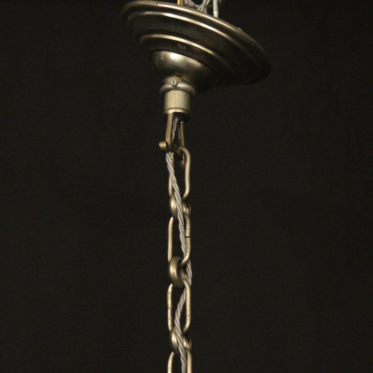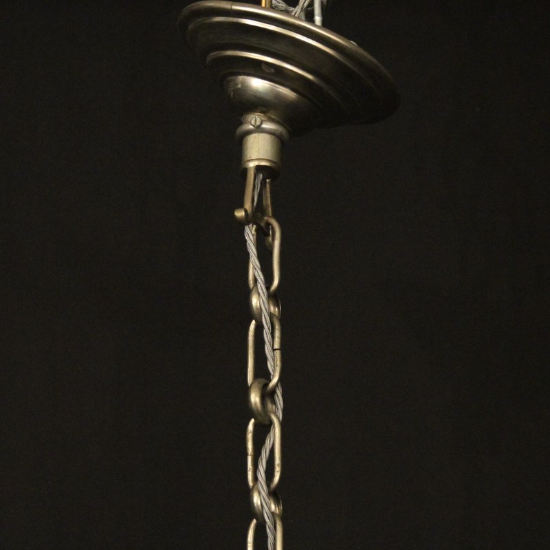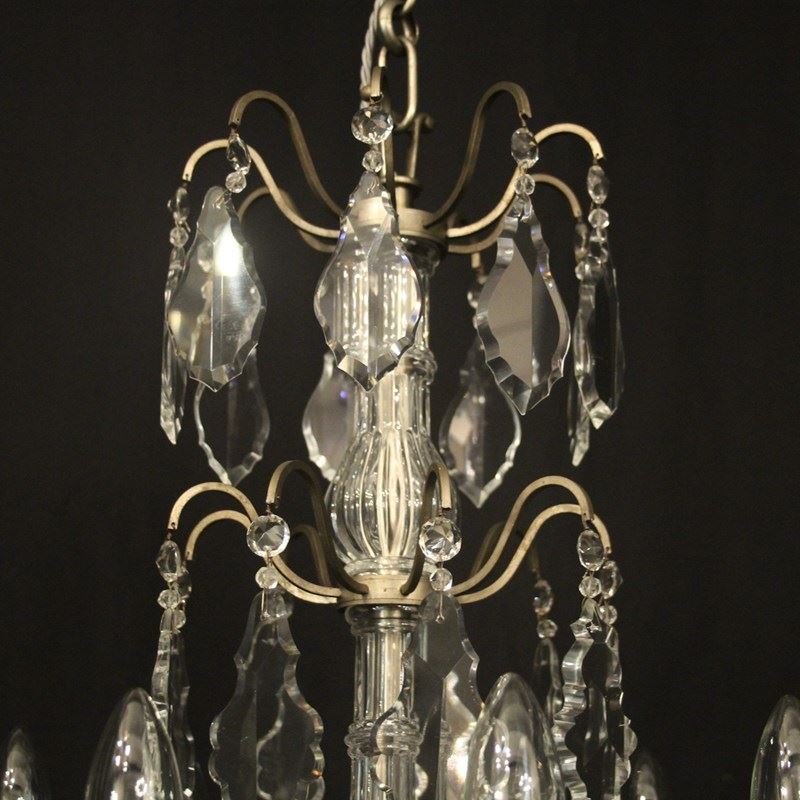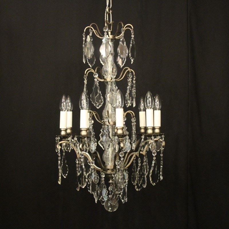 A French silver gilded brass and crystal 9 light antique chandelier, the nine square gauge scrolling arms with leaf bobeche drip pans and bulbous candle sconces, issuing from glass baluster column with scrolling canopy, decorated overall with French Slab crystal faceted pendants, having the original chain and ceiling rose, nice original silver gilded patination. Fully rewired and PAT tested. All our chandeliers come with bulbs and ceiling fixings.