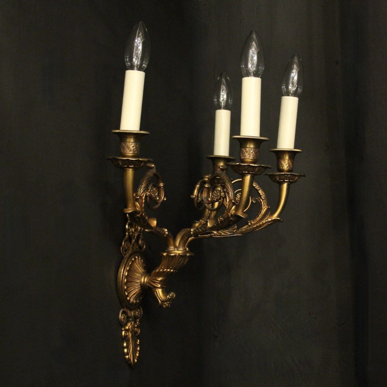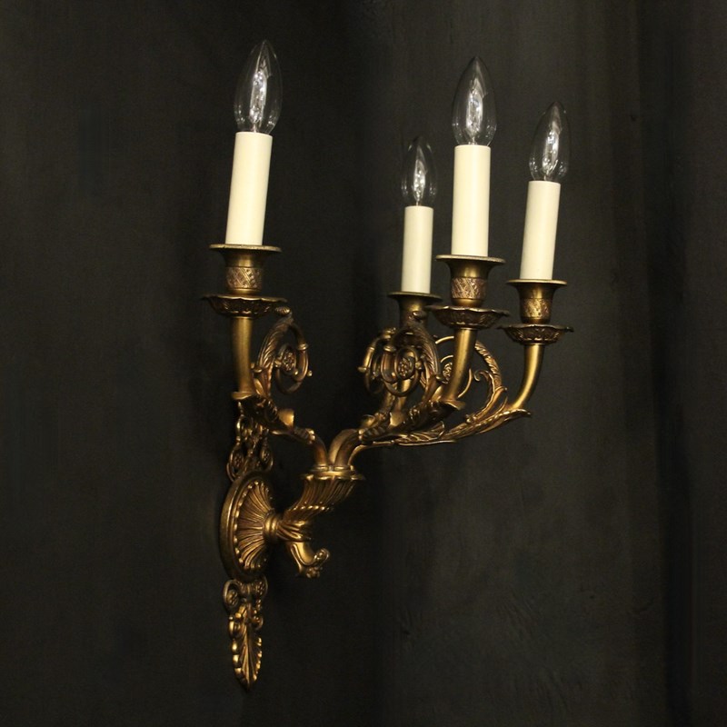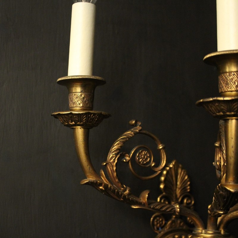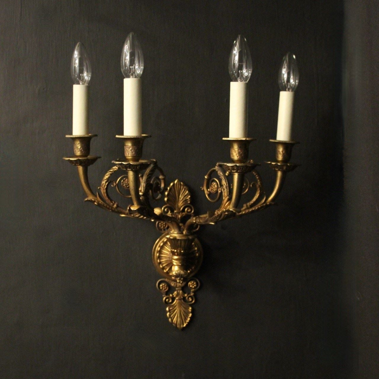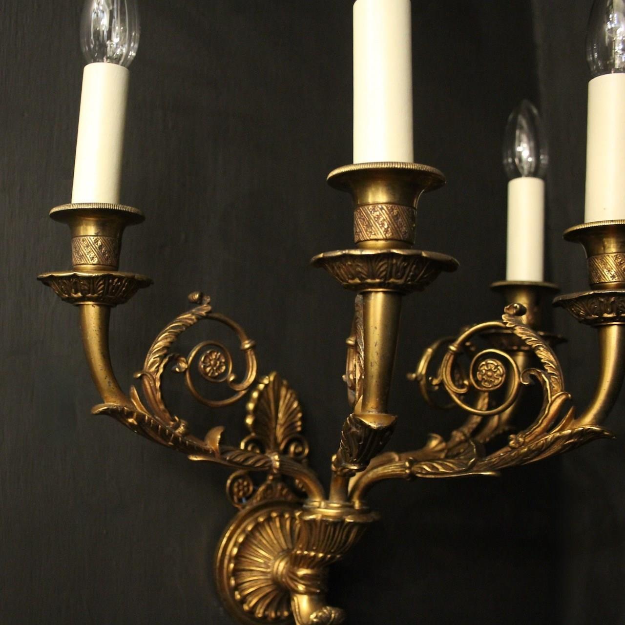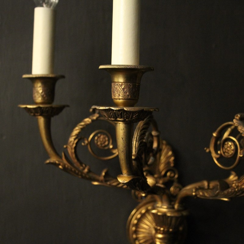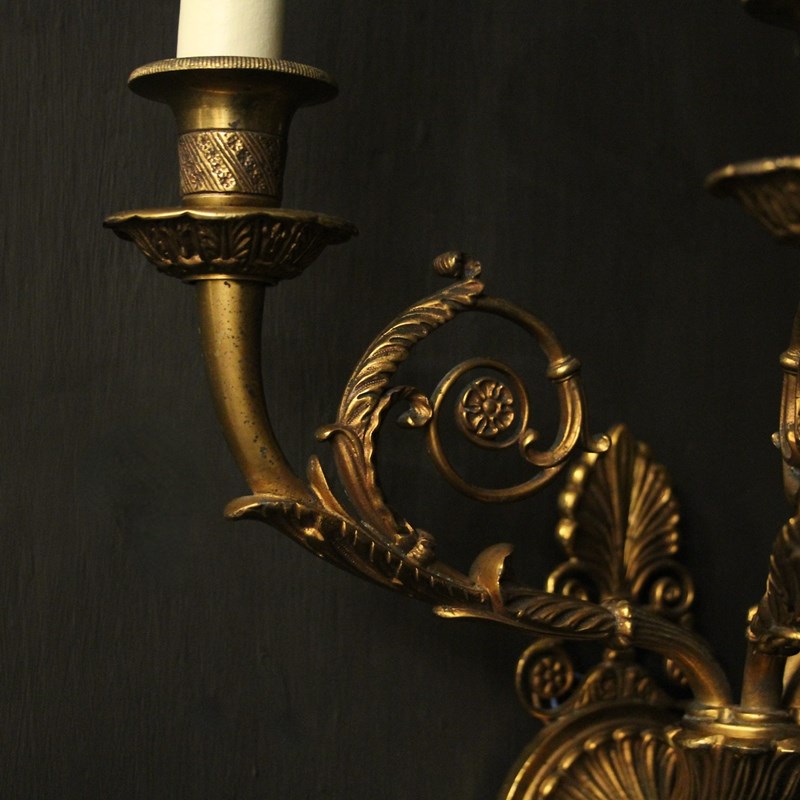 A French single gilded bronze four arm antique wall sconce, the tapering leaf clad scrolling arms with sectional bobeche drip pans and decorative candle sconces, issuing from an ornate reeded circular backplate with Anthemion finial and terminal, great original patination and well cast. Fully rewired and PAT tested. All our wall lights come with aged brass screws for fixing and spare bulbs.