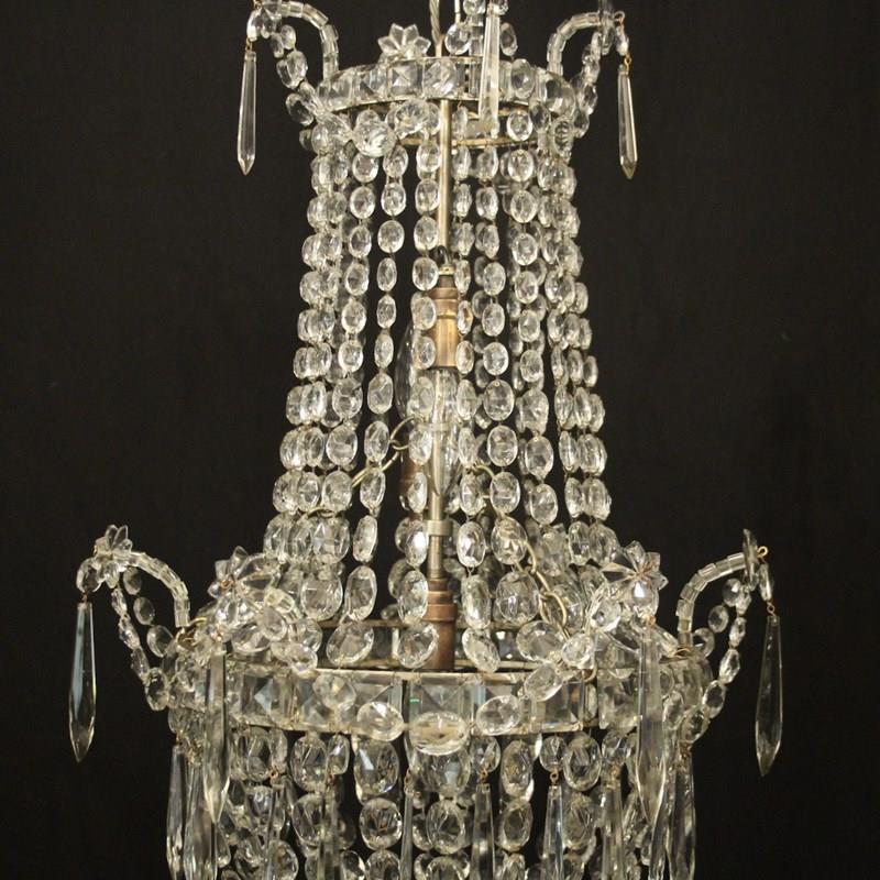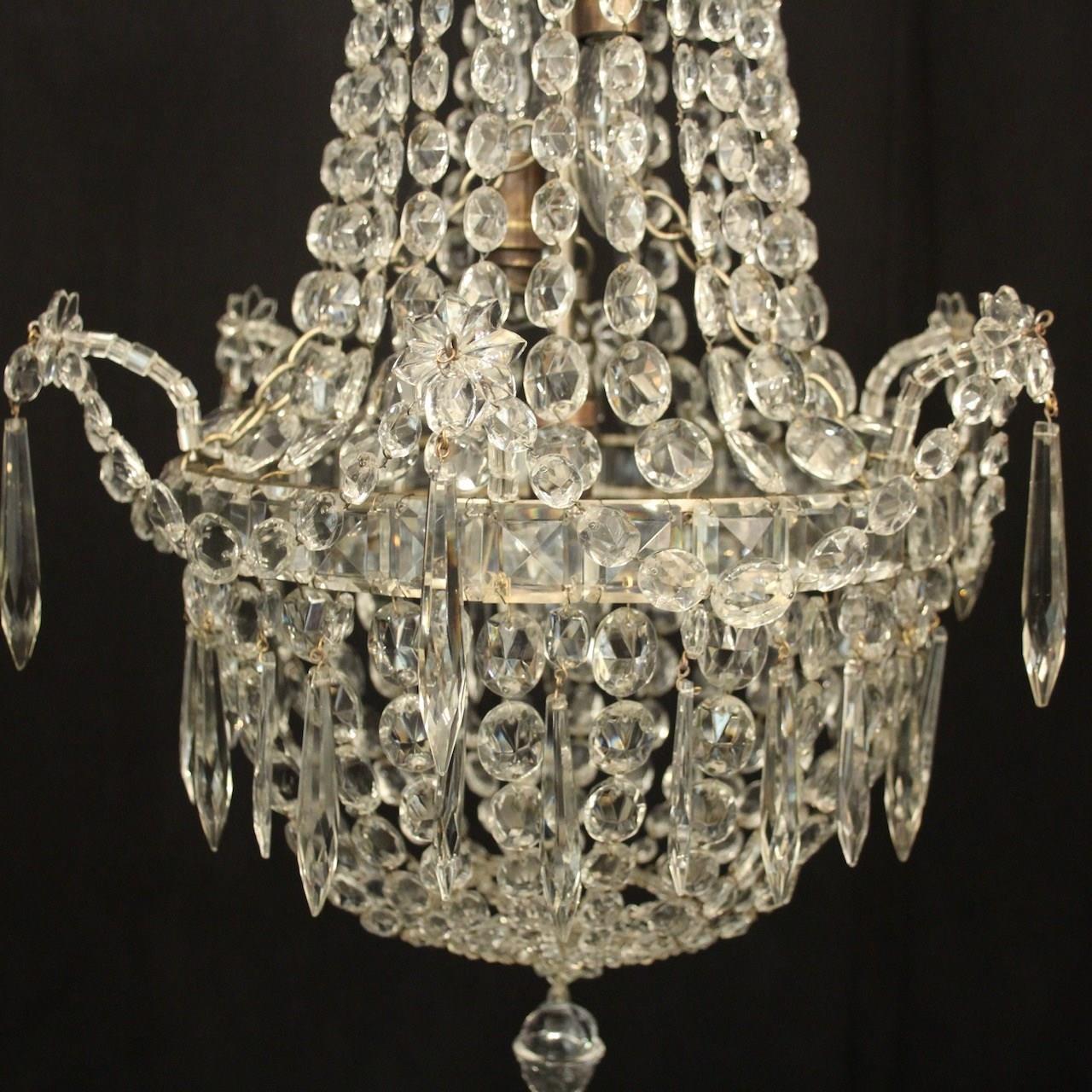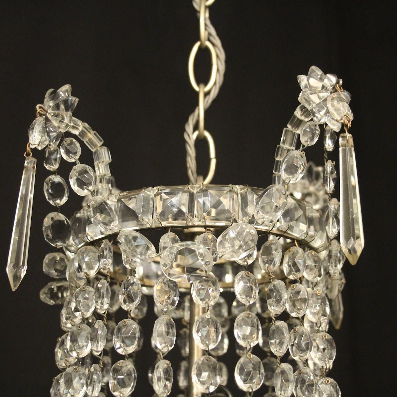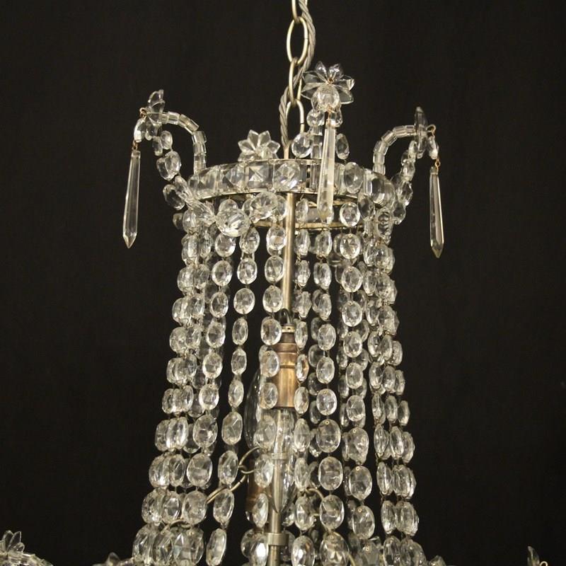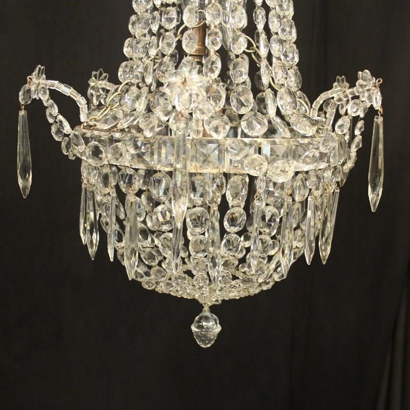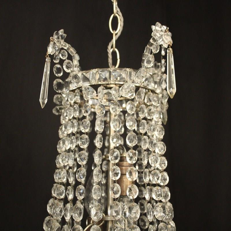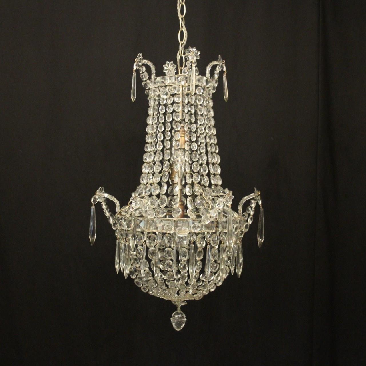 A very pretty French silver gilded crystal triple light tent & waterfall antique chandelier, the three graduated internal light fittings issuing from a central square faceted button band with icicle drops and decorated overall with graduated swaged crystal faceted pendants and floral swags. Having the original chain and ceiling rose. Fully rewired and PAT tested. All our chandeliers come with bulbs and ceiling fixings.